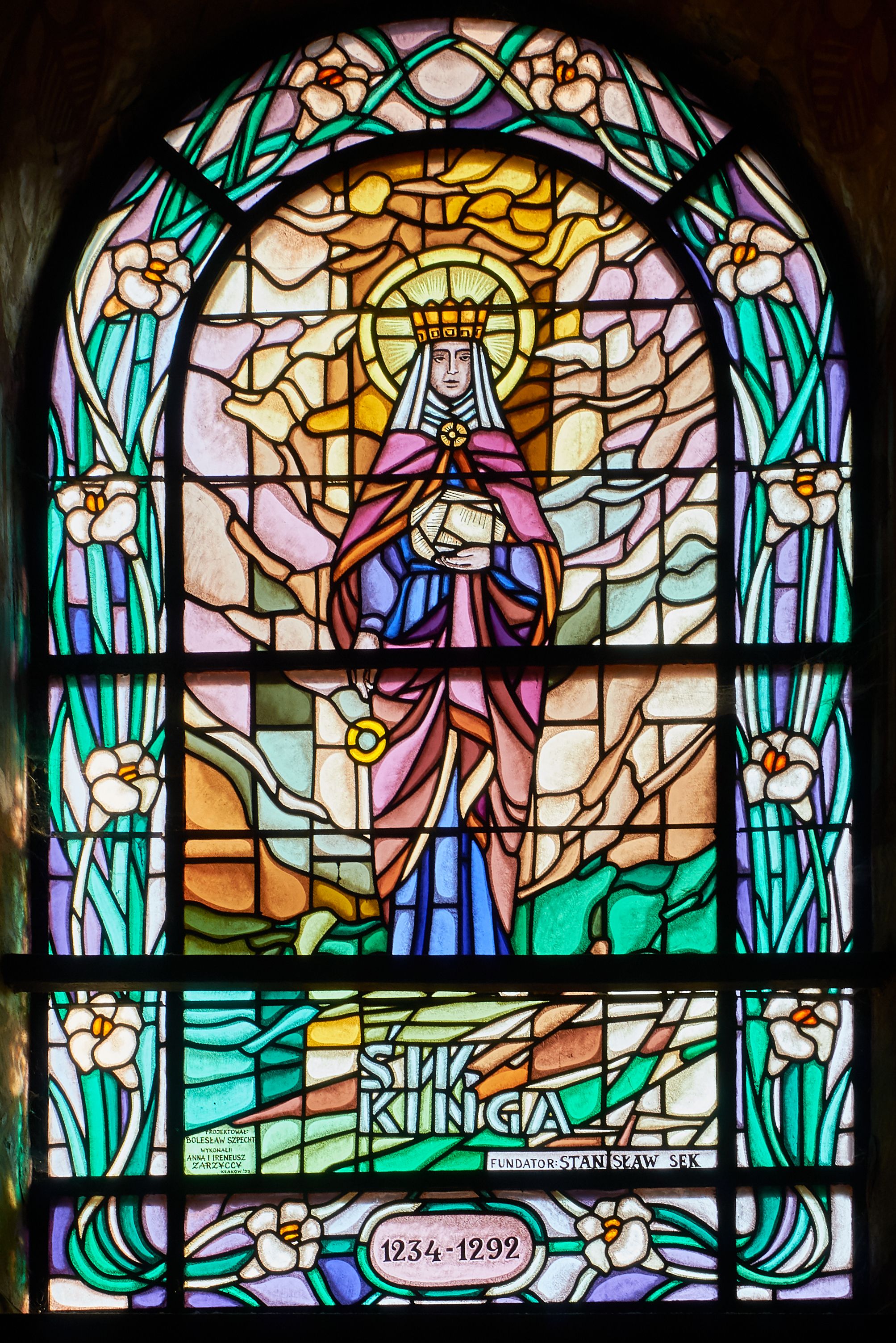 Obraz przedstawia św. Kunegundę (Kingę), córkę króla węgierskiego i żonę księcia krakowsko-sandomierskiego Bolesława Wstydliwego. Według podań Kinga wrzuciła pierścień do darowanej jej przez ojca kopalni na Węgrzech, a podczas jej podróży przez Bochnię natrafiono na zawierającą ten pierścień bryłkę soli. Tak, według legendy, sól „przewędrowała” na teren Polski, a Kinga stała się patronką górników solnych i całego kraju. Witraż przedstawia ją z bryłą soli i upadającym pierścieniem. Odwołano się do tradycyjnej ikonografii, którą ubrano w nowoczesną formę.