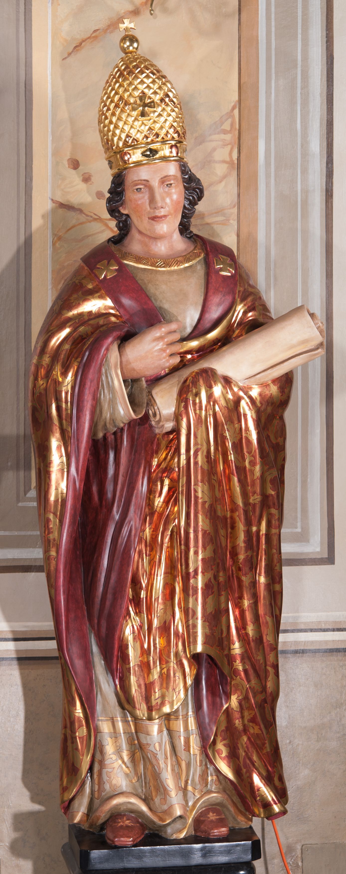 Całopostaciowe przedstawienie świętego Klemensa na cokole. Święty patrzy przed siebie, ma głowę przechyloną lekko na prawą stronę, prawą rękę unosi na wysokość dekoltu, w lewej, osłoniętej płaszczem trzyma zwój. Ma owalną twarz o łagodnym wyrazie, ciemne oczy, szeroki nos i niewielkie, czerwone usta, na policzkach delikatny rumieniec. Jest ubrany w albę z pasem koronki u dołu i obszerną, czerwoną kapę dekorowaną złotymi liśćmi; na głowie ma tiarę, a na nogach buty ze złotymi gwiazdami.