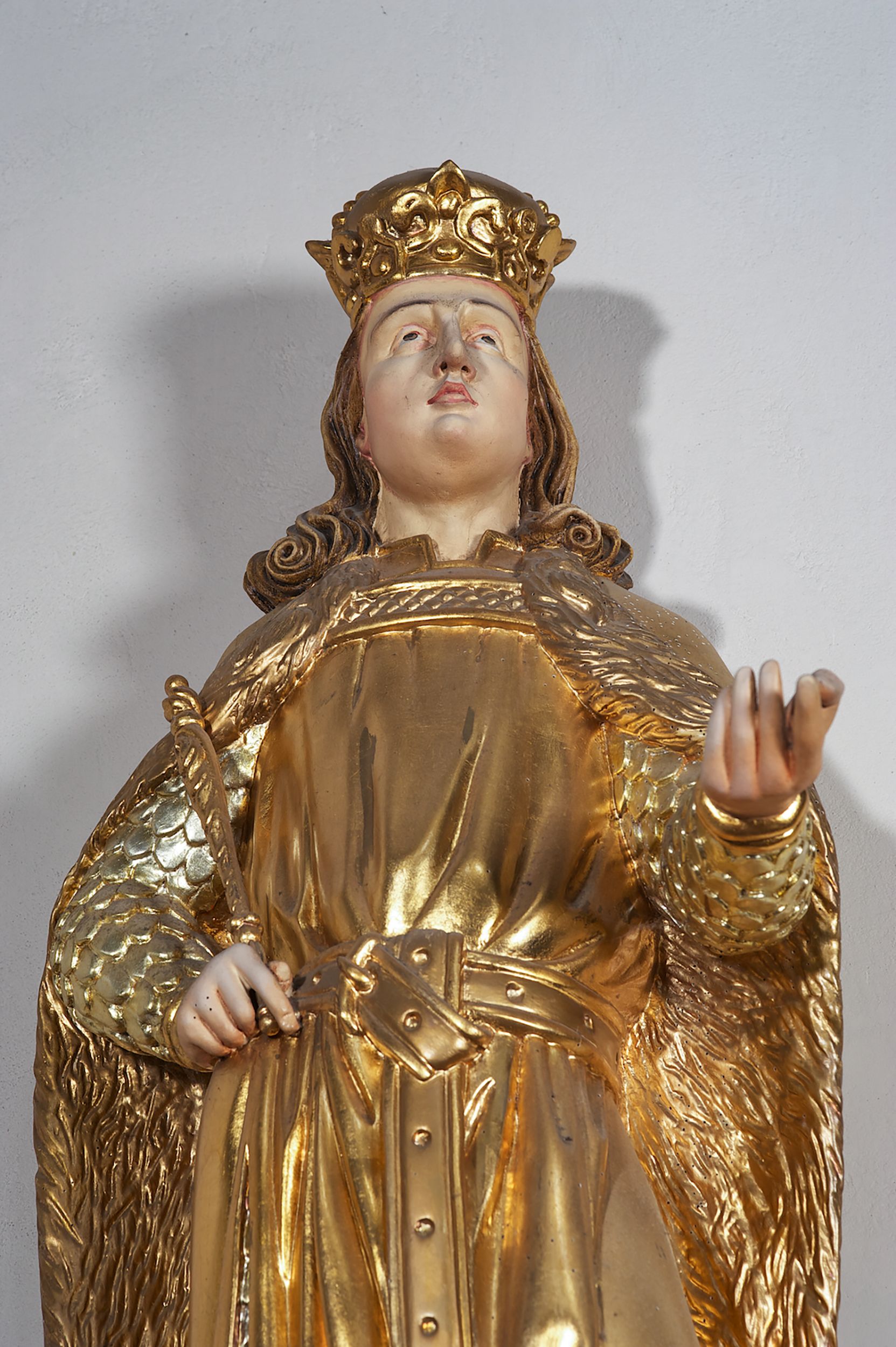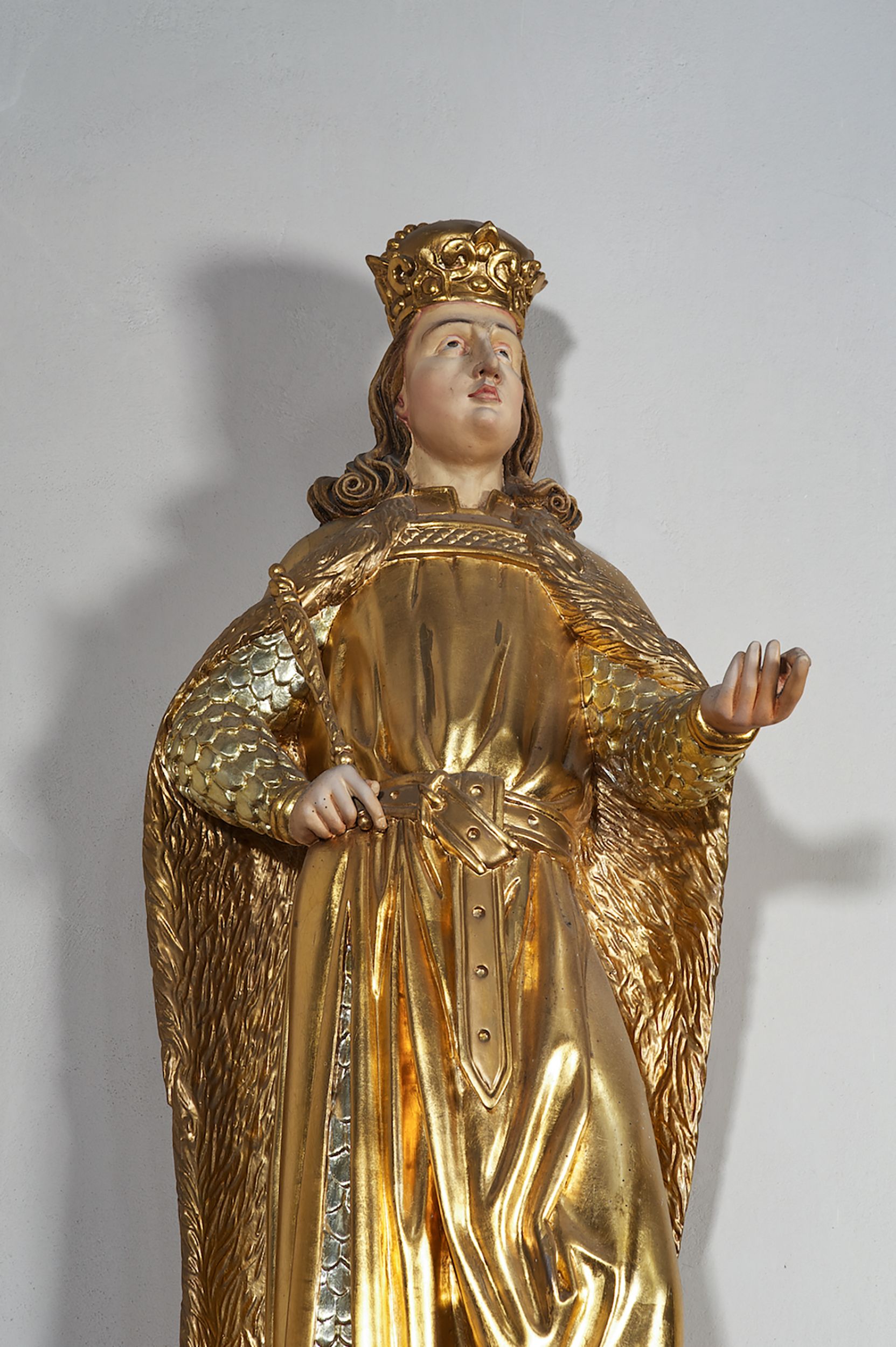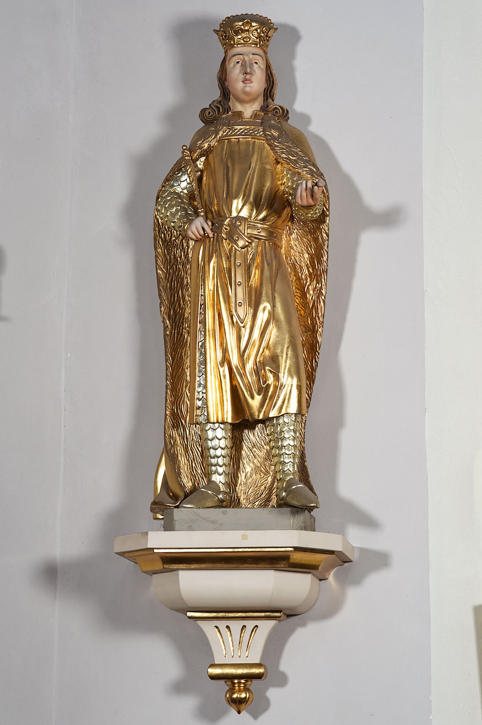Pełnoplastyczna, drewniana figura św. Ludwika, ustawiona na konsoli. Święty został przedstawiony w pozycji stojącej, z lewą nogą wysuniętą nieco do przodu, ubrany w zbroję łuskową, na którą narzucono mu przewiązaną pasem tunikę i obfity płaszcz z futrzanym podbiciem spięty pod szyją. Prawą, ugiętą rękę opiera na biodrze, lewą wyciąga przed siebie. Twarz pociągła, okolona długimi włosami opadającymi na oba ramiona i zwijającymi się w loki. Ma niewielkie, pełne usta, prosty nos i ciemne oczy; na głowie korona zamknięta. Partie twarzy i włosów polichromowane naturalistycznie, szaty złocone.