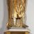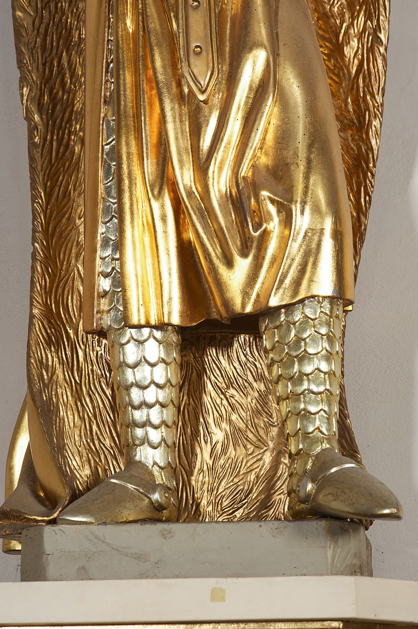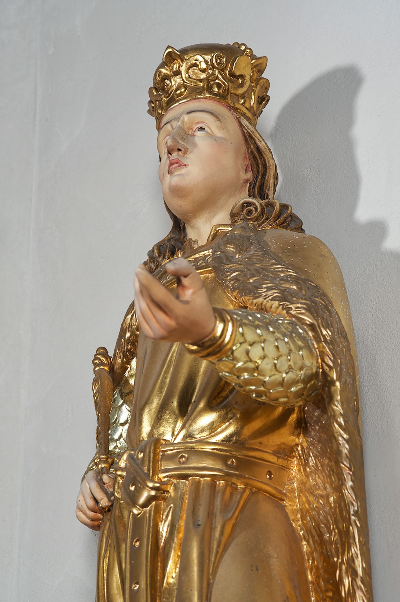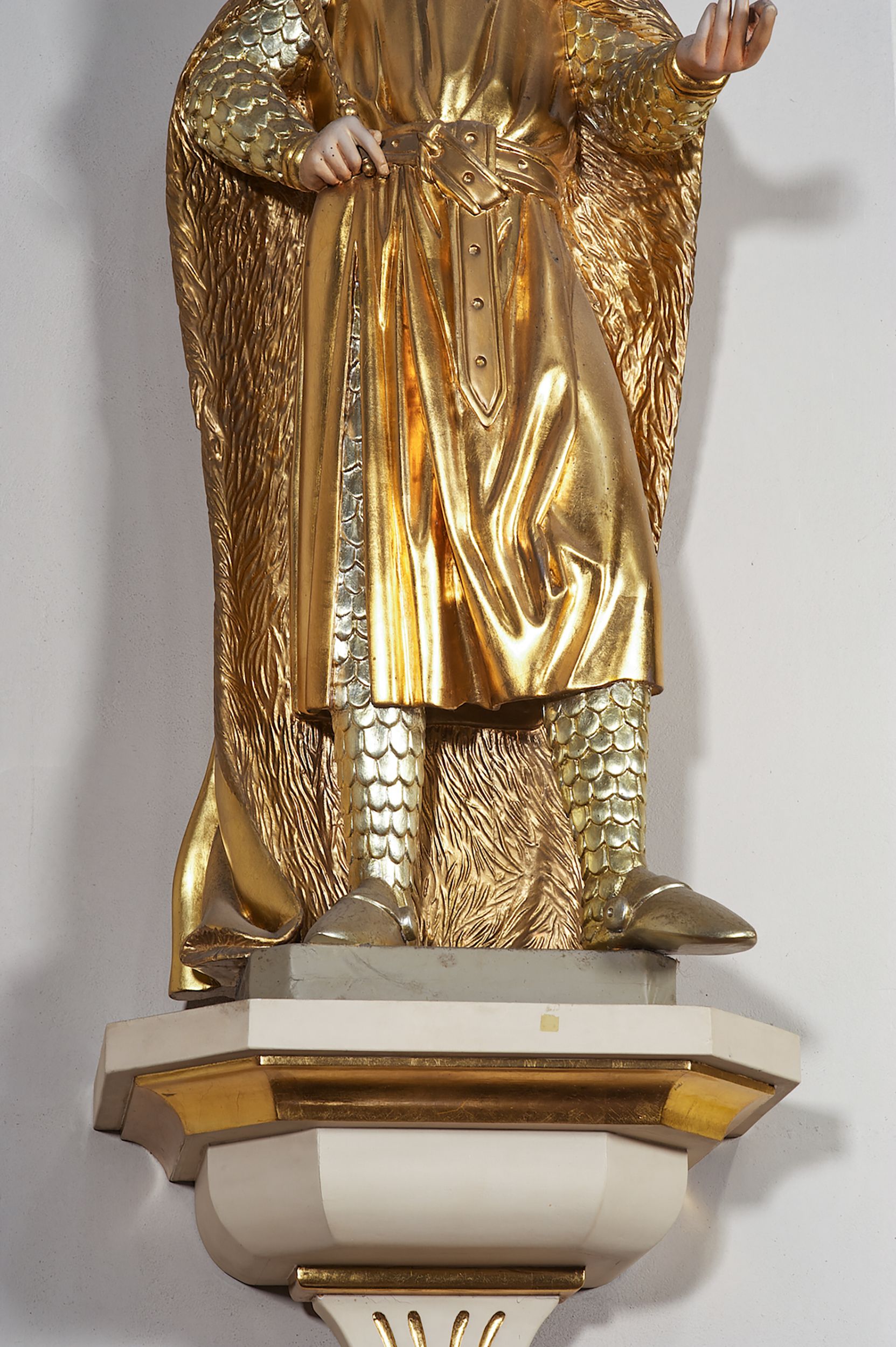 Pełnoplastyczna, drewniana figura św. Ludwika, ustawiona na konsoli. Święty został przedstawiony w pozycji stojącej, z lewą nogą wysuniętą nieco do przodu, ubrany w zbroję łuskową, na którą narzucono mu przewiązaną pasem tunikę i obfity płaszcz z futrzanym podbiciem spięty pod szyją. Prawą, ugiętą rękę opiera na biodrze, lewą wyciąga przed siebie. Twarz pociągła, okolona długimi włosami opadającymi na oba ramiona i zwijającymi się w loki. Ma niewielkie, pełne usta, prosty nos i ciemne oczy; na głowie korona zamknięta. Partie twarzy i włosów polichromowane naturalistycznie, szaty złocone.