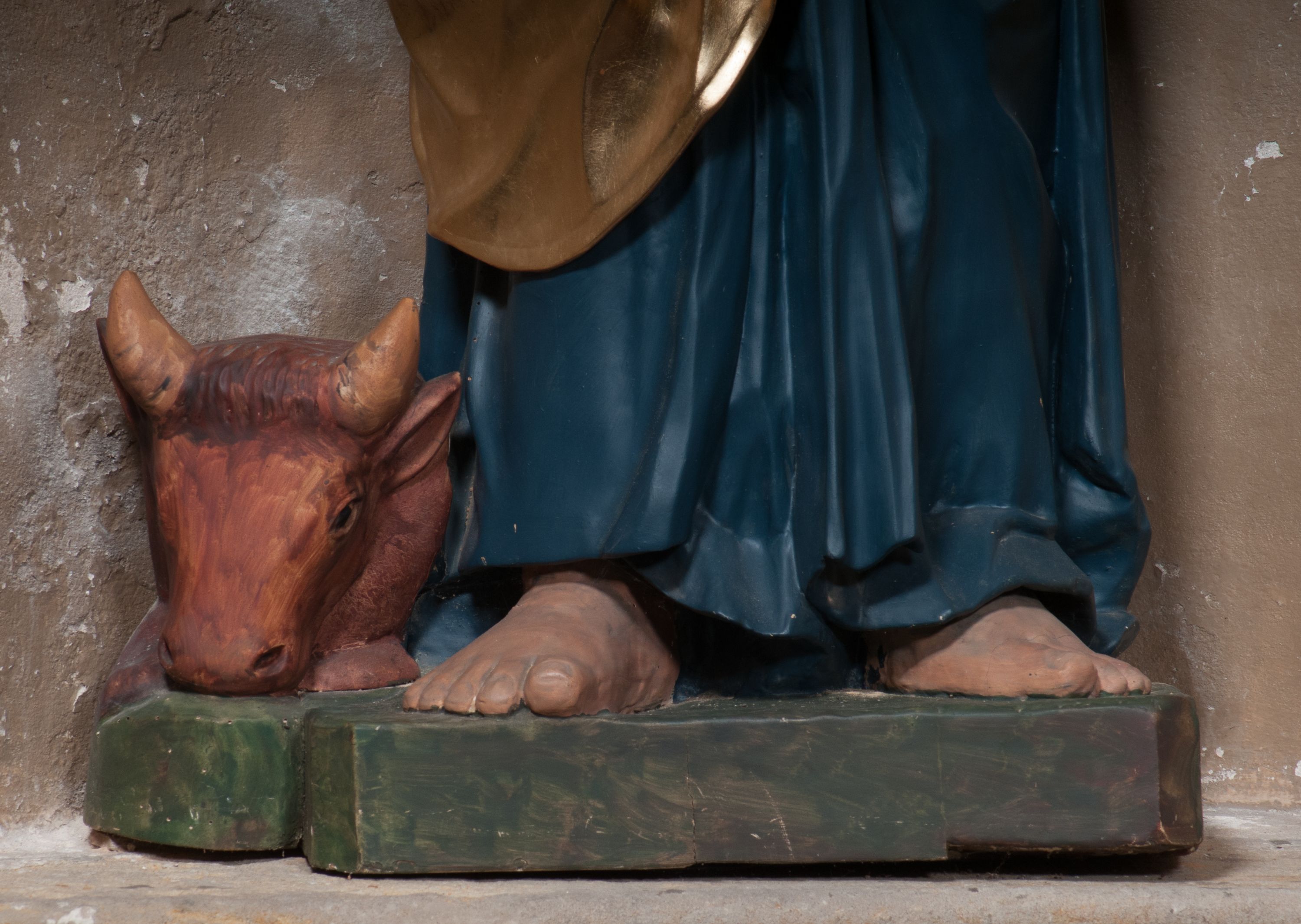 Święty Łukasz pochodził z Antiochii i wykonywał zawód lekarza. Był misjonarzem podróżującym ze św. Pawłem, autorem Ewangelii i Dziejów Apostolskich, zmarł śmiercią męczeńską. Towarzyszący mu na przedstawieniach wół nawiązuje do pierwszego rozdziału spisanej przez niego Ewangelii i symbolizuje składaną przez Zachariasza ofiarę, podczas której ukazał się anioł przepowiadający narodzenie Jana Chrzciciela. Atrybut odwołuje się również do wyobrażeń z wizji proroka Ezechiela (Ez 1, 4-12) i św. Jana (Ap 4, 6-8) interpretowanych jako symbole czterech ewangelistów. Zgodnie z powszechnym zwyczajem św. Łukasz został przedstawiony z księgą.