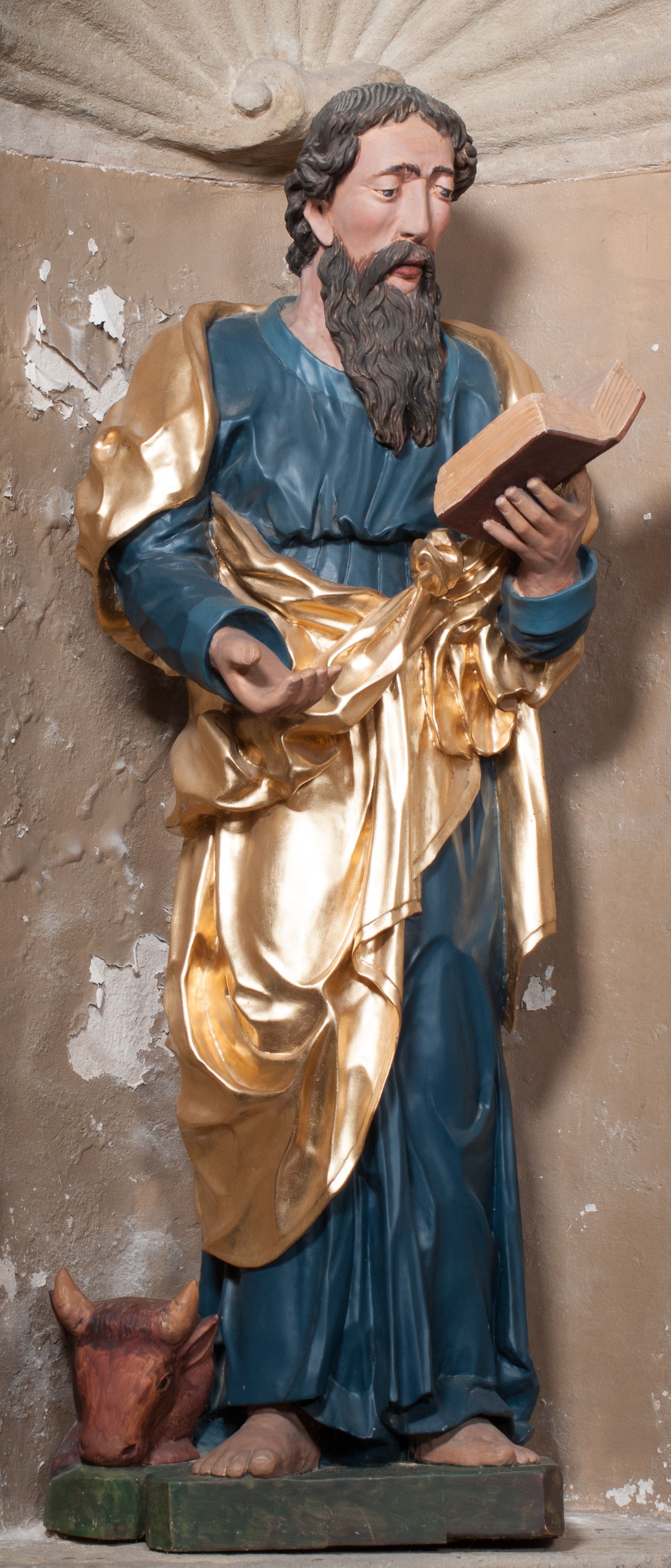 Rzeźba drążona, postać umieszczona na cokole, przedstawiająca św. Łukasza Ewangelistę. Święty ukazany jest w pozycji stojącej, z górną partią ciała skręconą nieznacznie w lewo, z lekko pochyloną głową. Ręce ma ugięte, w lewej trzyma otwartą księgę, prawą wyciąga przed siebie. Ma pociągłą twarz z okrągłymi oczami, długim nosem i wydatnymi ustami, okoloną krótkimi, opadającymi do tyłu puklami włosów oraz długą, dzielącą się na końcu w dwa pukle brodę. Święty odziany jest w przewiązaną w pasie niebieską suknię opadającą do stóp płytkimi, miękkimi fałdami oraz złoty płaszcz, zarzucony na ramiona i otaczający biodra, przytrzymany z przodu rękami, układający się w głębokie, nieregularne fałdy. U bosych stóp świętego wół.