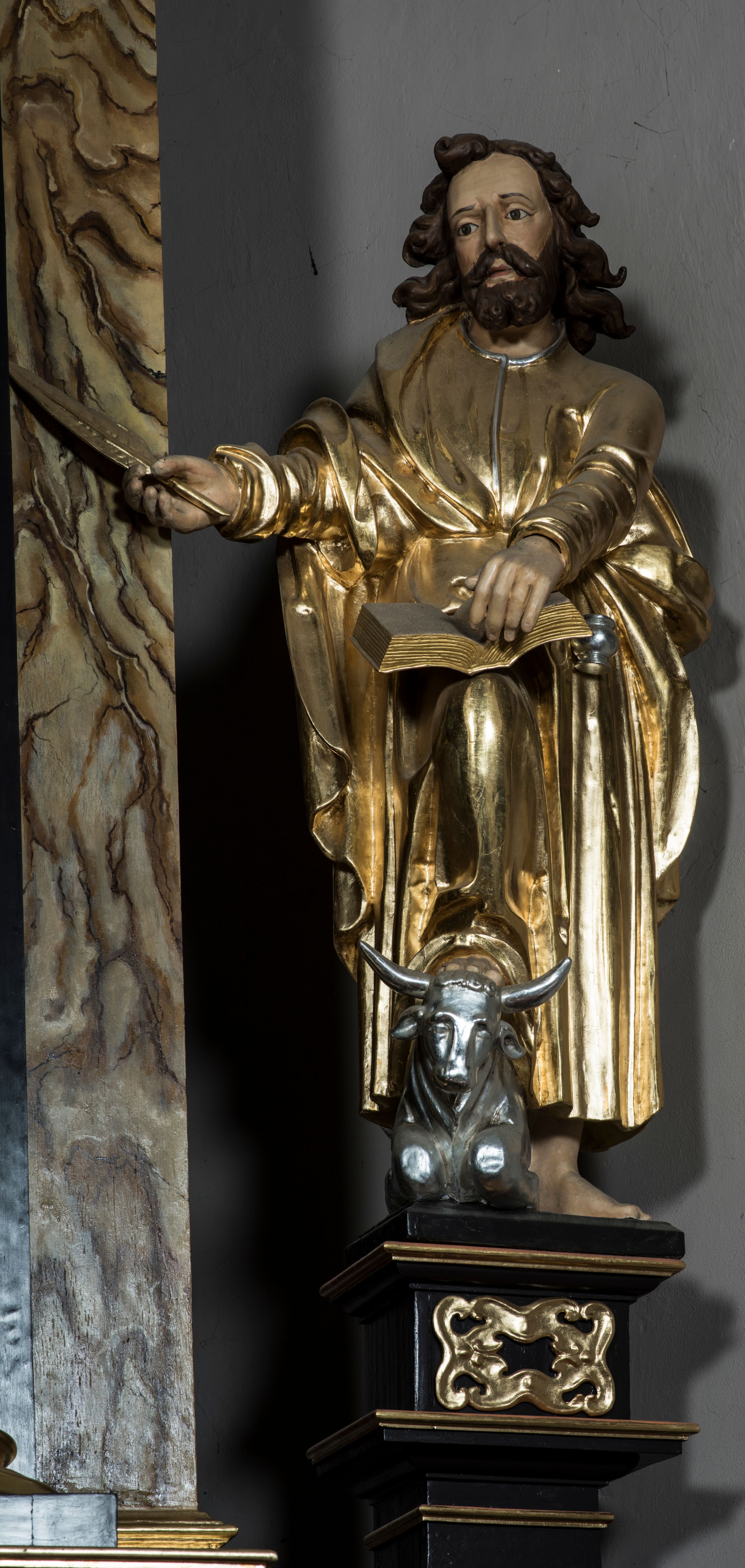 Figura św. Łukasza jest umieszczona ponad bramką prowadzącą za ołtarz, na postumencie, ozdobionym od frontu ornamentem małżowinowym. Święty ukazany jest w pozycji stojącej, lekko pochylony w przód, z prawą nogą ugiętą w kolanie i wspartą na leżącym u jego stóp wole. W prawej lekko zgiętej, wyciągniętej do przodu ręce trzyma ptasie pióro, lewą natomiast podtrzymuje księgę, która jest rozłożona i wsparta na kolanie. Twarz ewangelisty jest pociągła, z prostym nosem, szeroko otwartymi, dużymi oczami. Ponad wysokim czołem zaczepione są pofalowane pukle włosów uformowane w taki sposób, jak gdyby były rozwiane. Święty stoi boso, ma na sobie długą tunikę z dekoltem ozdobionym delikatną bordiurą oraz wąskimi rękawami, przewiązaną w pasie. Na wierzchu narzucony jest płaszcz spływający z prawego ramienia. Pod jego lewą ręką przywiązany do płaszcza kałamarz. W opracowaniu tuniki dominują pionowe, równoległe, rurkowate fałdy, a w przypadku płaszcza fałdy załamane i wygięte zgodnie z duktem tkaniny. Fragmenty ciała polichromowane naturalistycznie, szaty złocone, lamówki szat, wół i kałamarz srebrzone.