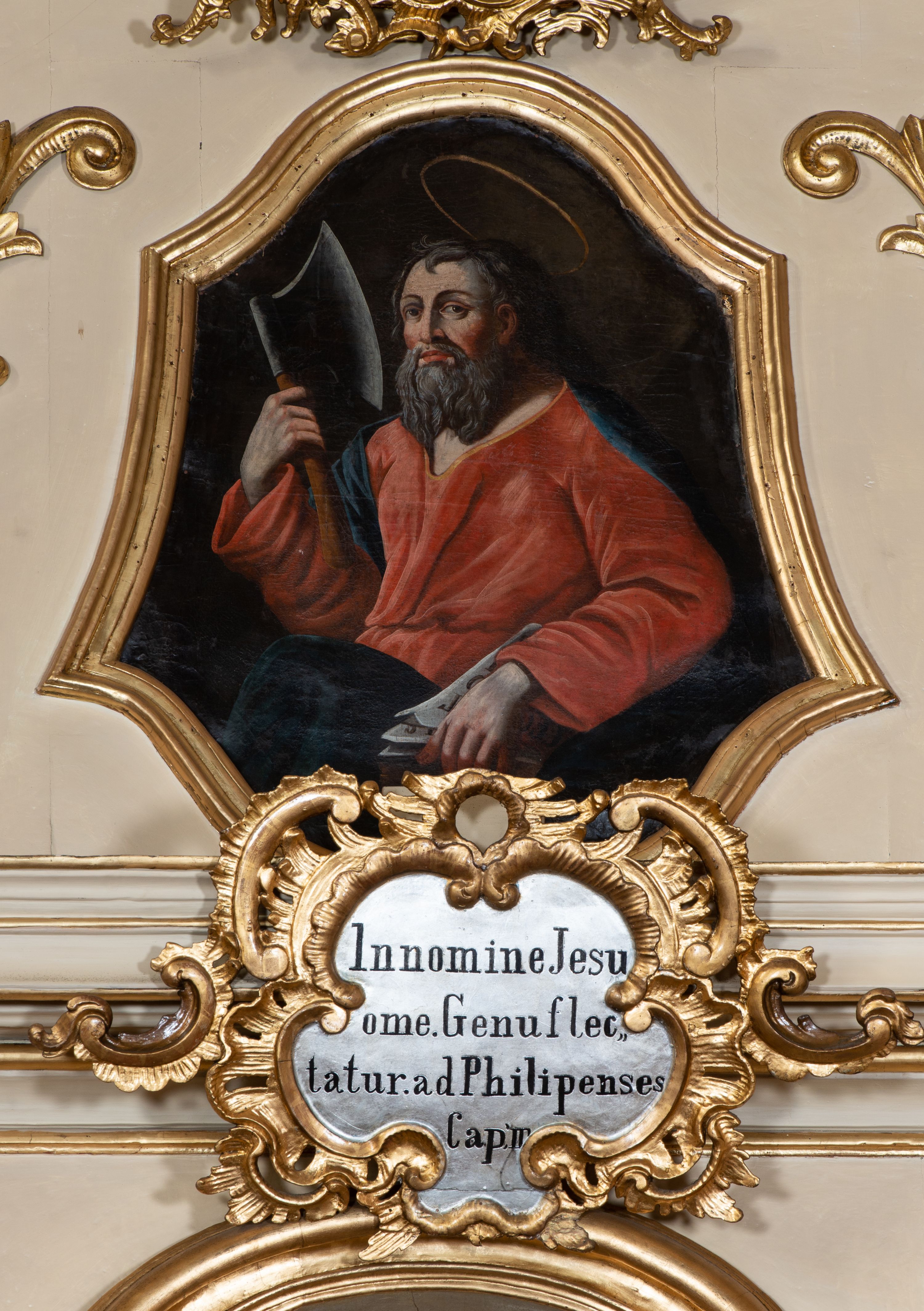 Obraz w formie zbliżonej do trapezu zamkniętego z dwóch stron łukiem falistym. W centrum święty ukazany w półpostaci, zwrócony w trzech czwartych w prawo. W prawej uniesionej ręce trzyma topór, w lewej opuszczonej w dół trzyma księgę. Twarz ma kwadratową, o dużych, migdałowatych oczach, nosie i pełnych ustach; okoloną długą, siwą brodą oraz krótkimi, siwymi włosami. Nad głową ma aureolę. Ubrany jest w luźną, czerwoną suknię, przepasaną w talii oraz ciemnoniebieski płaszcz zarzucony na plecy i prawe ramię, opadający z przodu postaci. Święty ukazany na ciemnobrązowym tle.
