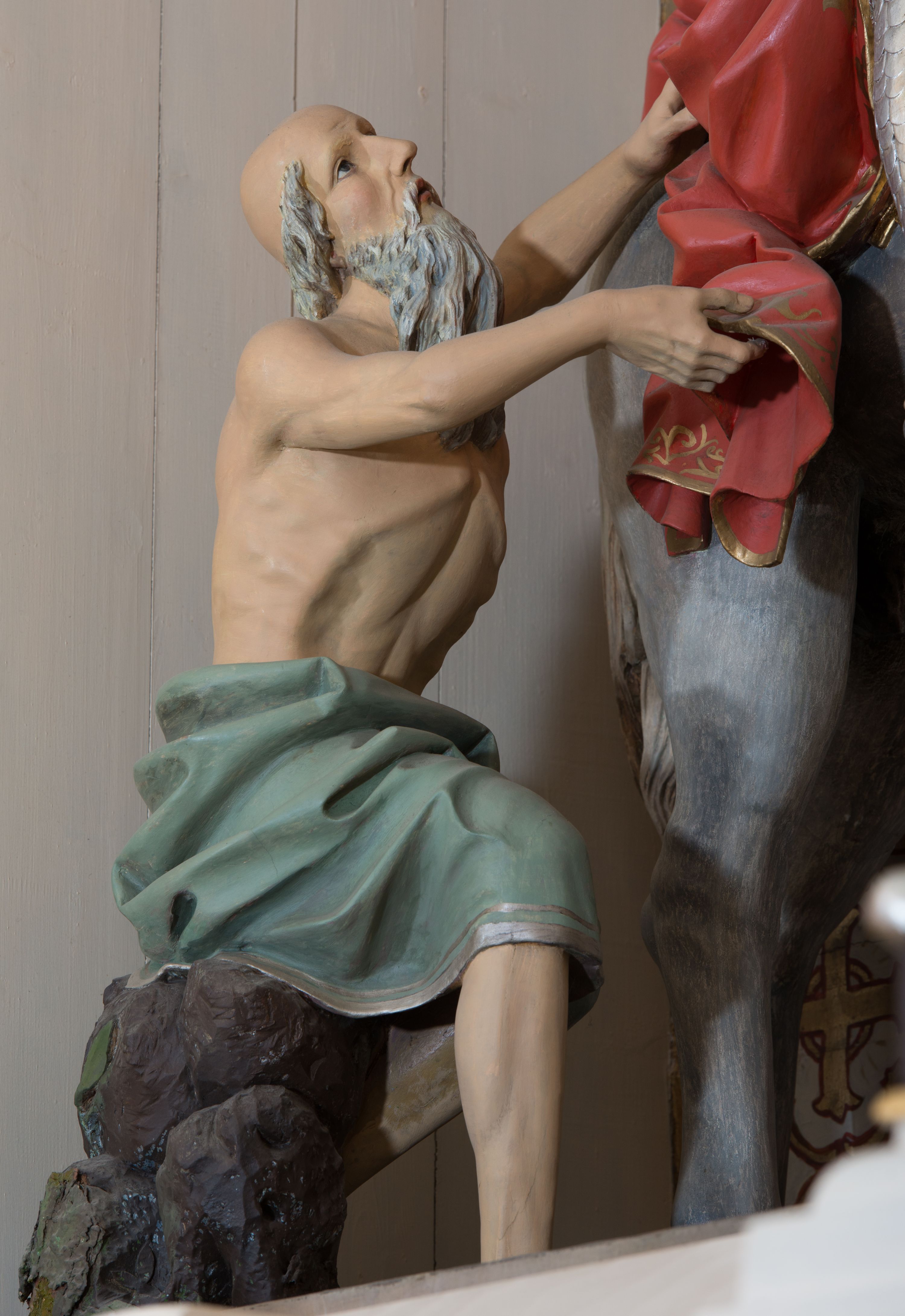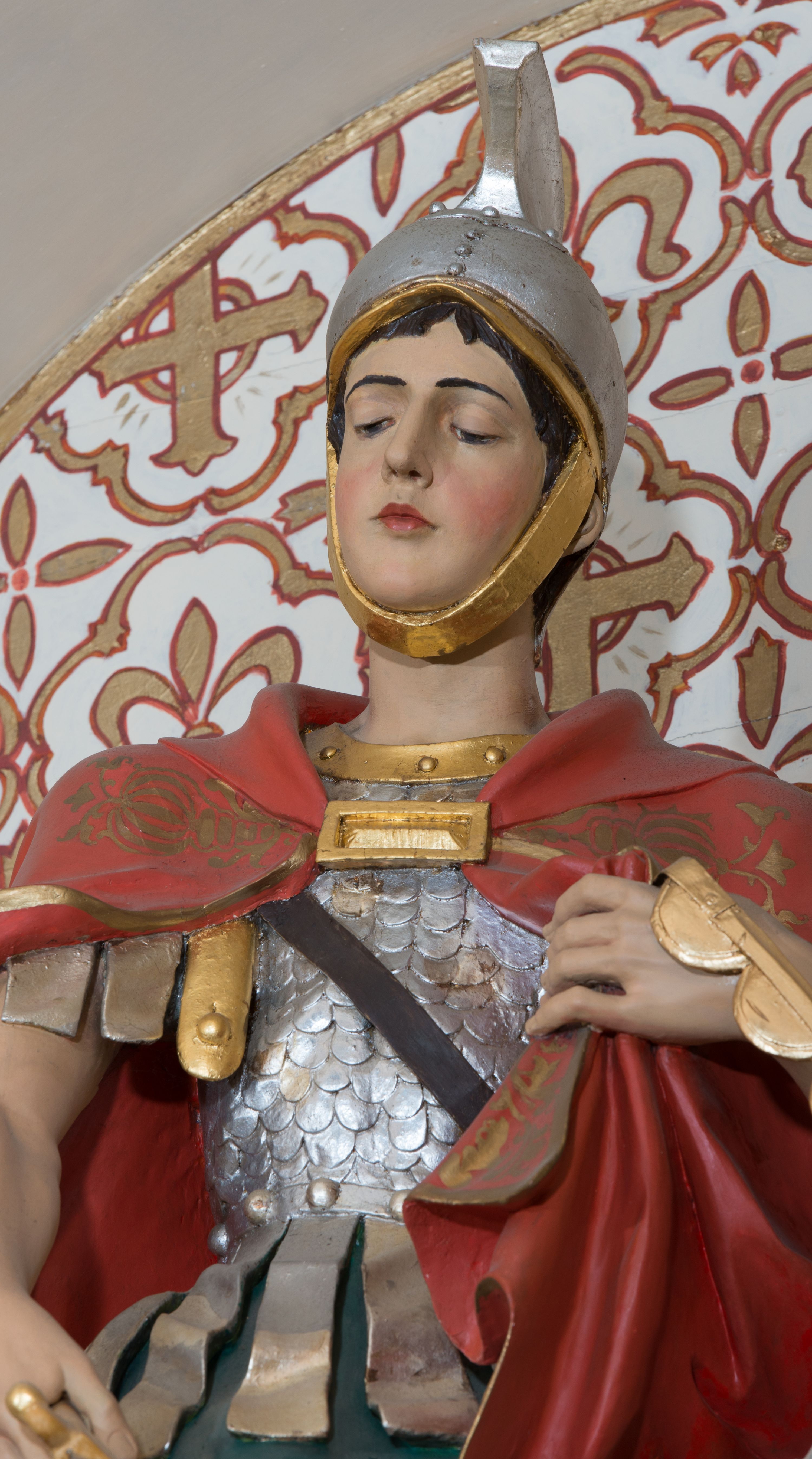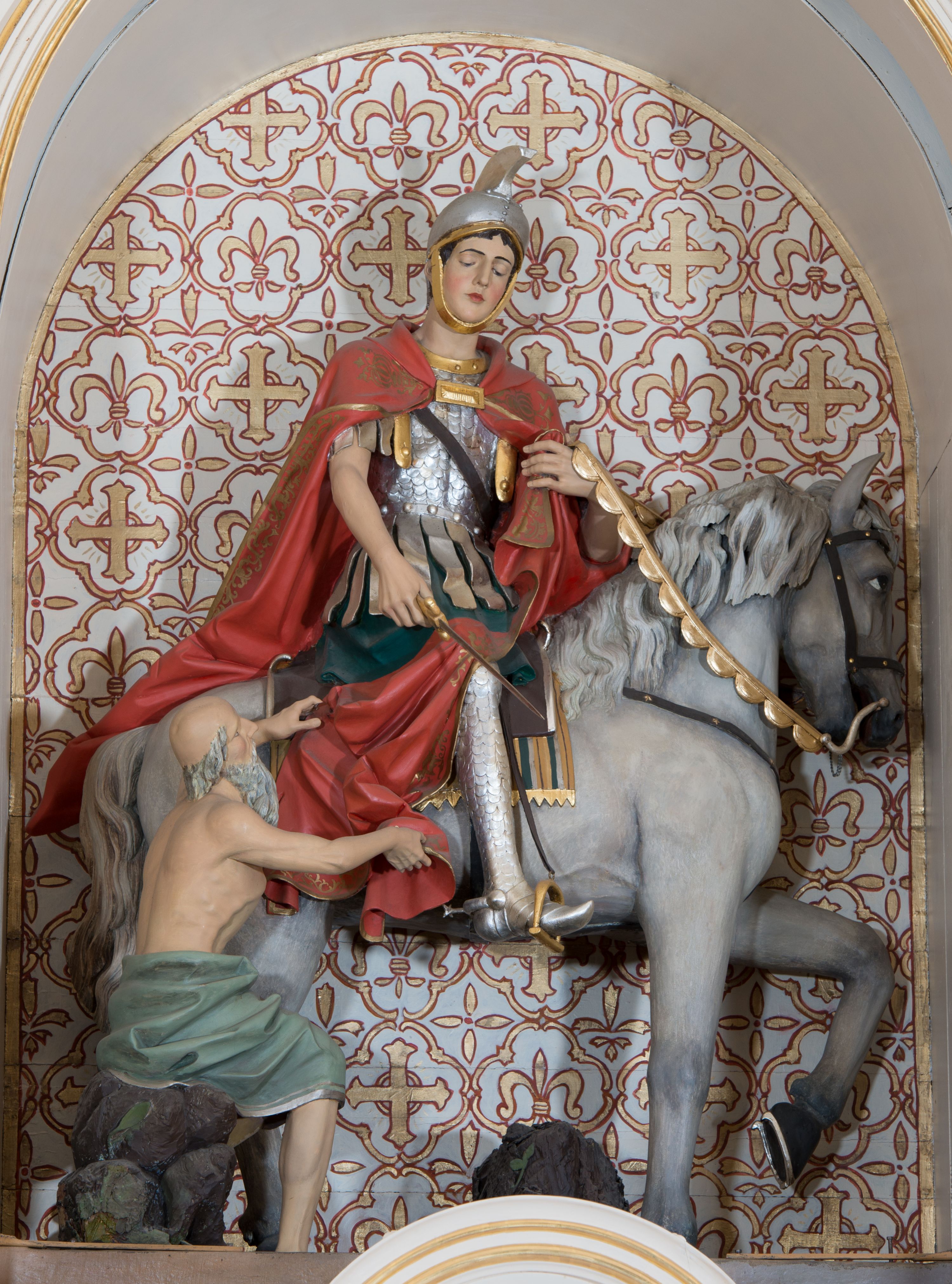 Rzeźba św. Marcina, drążona przedstawiająca świętego, który siedzi na koniu o szarej maści i ucina połę płaszcza biedakowi stojącemu po lewej stronie kompozycji. Święty zwrócony w lewo, ukazany w pozycji siedzącej, lewą dłonią trzyma uzdę konia, w prawej ma miecz. Twarz podłużna z długim nosem i przymkniętymi oczami, policzki silnie zarumienione. Ubrany jest w strój legionisty rzymskiego: pełną zbroję, hełm, napierśnik, ostrogi, zieloną tunikę oraz czerwony płaszcz spięty pod szyją złotą klamrę, ozdobiony na brzegu złoconą dekoracją roślinną. Z lewej, u dołu przedstawiony jest starszy mężczyzna, który siedzi na skale i dłońmi chwyta płaszcz św. Marcina. Ubrany jest w zieloną szatę ze srebrzoną lamówką, która osłania jego biodra. Twarz o rysach starszego mężczyzny, wychudzona, okolona długą i siwą brodą oraz rzadkimi włosami. Wnęka zdobiona krzyżami greckimi wpisanymi w czwórliście. Polichromia w odsłoniętych partiach ciała naturalistyczna, elementy uzbrojenia złocone i srebrzone.