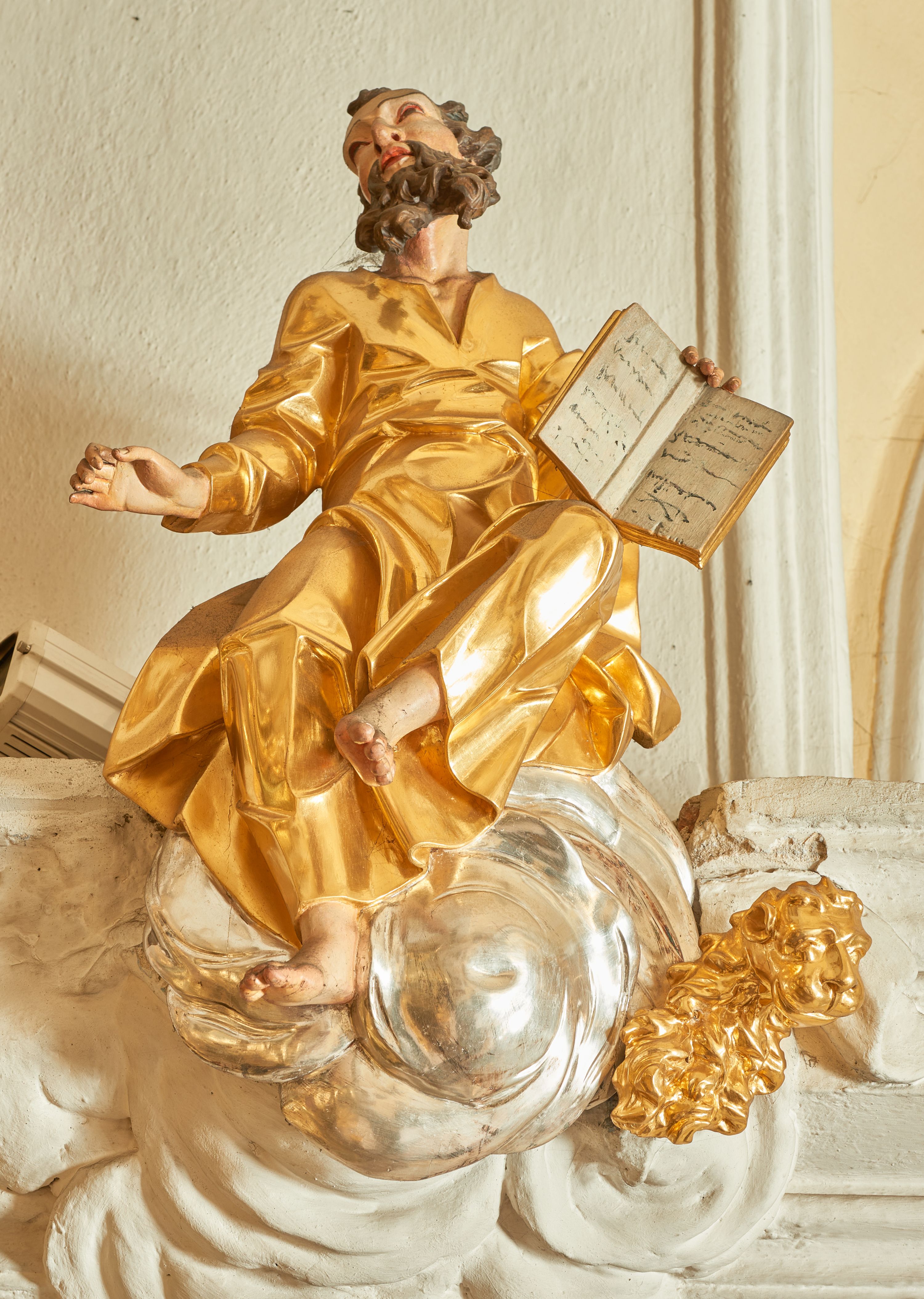 Rzeźba św. Marka, który siedzi na srebrnych obłokach. Święty jest ukazany frontalnie, delikatnie wygięty do tyłu z głową uniesioną do góry w prawą stronę. Nogi ma ugięte w kolanach, lewą uniesioną i odwiedzioną na bok; ręce szeroko rozłożone na boki, w lewej dłoni trzyma otwartą księgę. Twarz szeroka z dużym i szerokim na końcu nosem, dużymi oczami oraz silnie zarumienionymi policzkami. Włosy krótkie, ciemnobrązowe z zakolami nad czołem, broda krótka i postrzępiona, ułożona w dwa duże pukle. Święty ubrany jest w długą i złoconą suknię, drapowaną w grube i ostro łamane fałdy z dekoltem w kształcie litery „V”. Po lewej stronie świętego znajduje się złocone popiersie lwa. Polichromia naturalistyczna w odsłoniętych partiach ciała świętego, szaty i lew złocone, obłoki srebrzone.