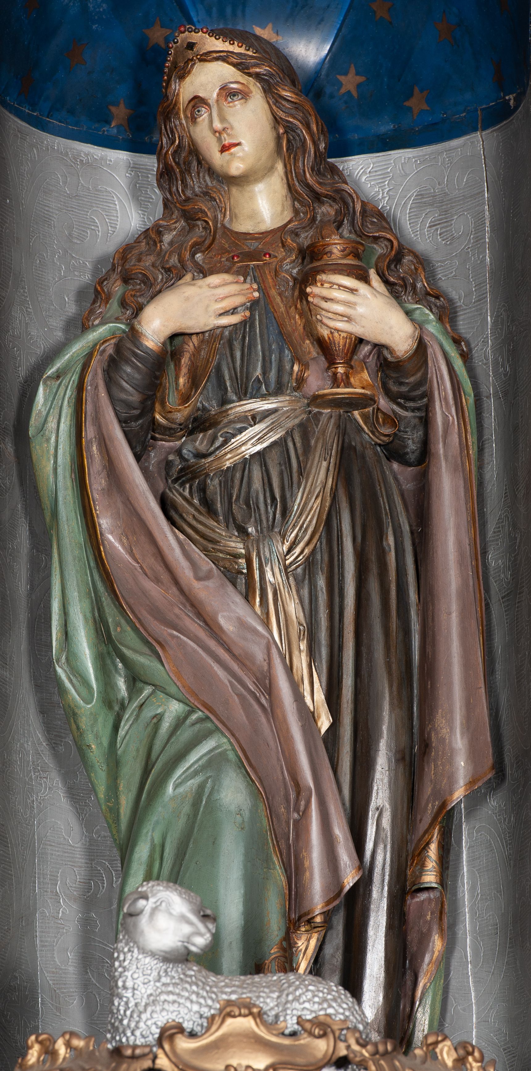 Drewniane, rzeźbione, polichromowane i złocone przedstawienie patronki kościoła św. Marii Magdaleny, wykonane w XIX wieku przez nieokreślonego rzeźbiarza małopolskiego, umieszczone pośrodku ołtarza głównego.