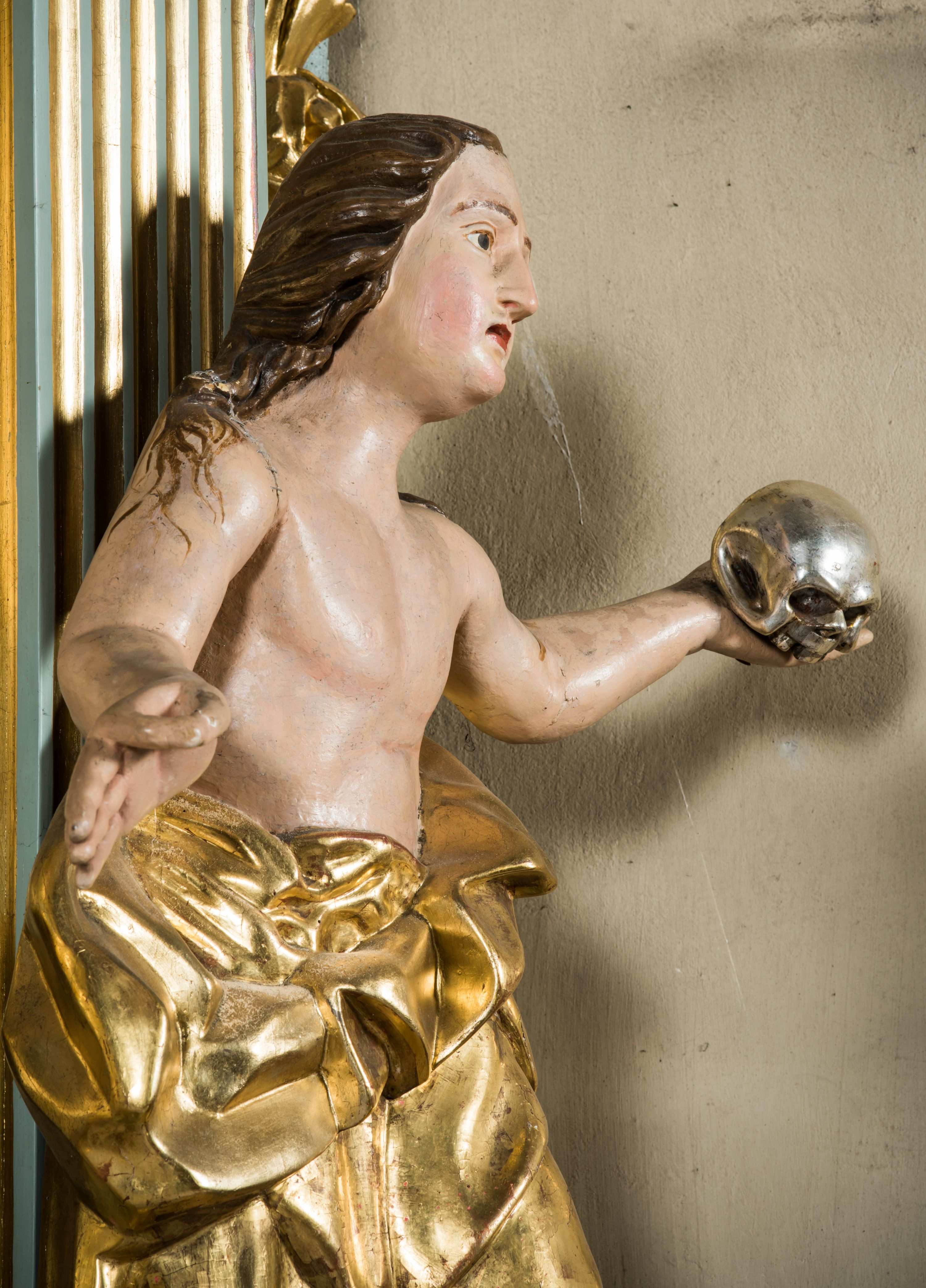 Rzeźba św. Marii Magdaleny nawiązuje w swojej formie do jej przedstawień reprezentacyjnych. Trudno jednak wskazać tutaj bliższe analogie. Świętą można identyfikować dzięki trzymanej ludzkiej czaszce oraz rozpuszczonych i opadających na nagie ramiona i piersi włosy. Tak m.in. świętą przedstawił Peter Paul Rubens na obrazie w zbiorach berlińskiego Staatliche Museen. Rzeźba zapewne pierwotnie przynależała do wcześniejszego ołtarza z drugiej połowy XVIII wieku. Pod względem formalnym rzeźba wyrasta z tradycji rokokowych realizacji, które kształtowane były "manierą Fontany". Stąd też posiada teatralne upozowanie, "grając" sobie powierzoną rolę, aczkolwiek nie jest to figura zdeformowana lub manieryczna. Tendencję tę można było zauważyć w twórczości Francesca Placidiego (np. wystrój rzeźbiarski w Morawicy), lub też u Piotra Korneckiego (np. rzeźby u cystersów w Jędrzejowie lub w farze w Bochni). Obecność gałązki palmowej każe widzieć w przedstawionej postaci świętą męczenniczkę, którą trudno jest zidentyfikować bez dodatkowego atrybutu.