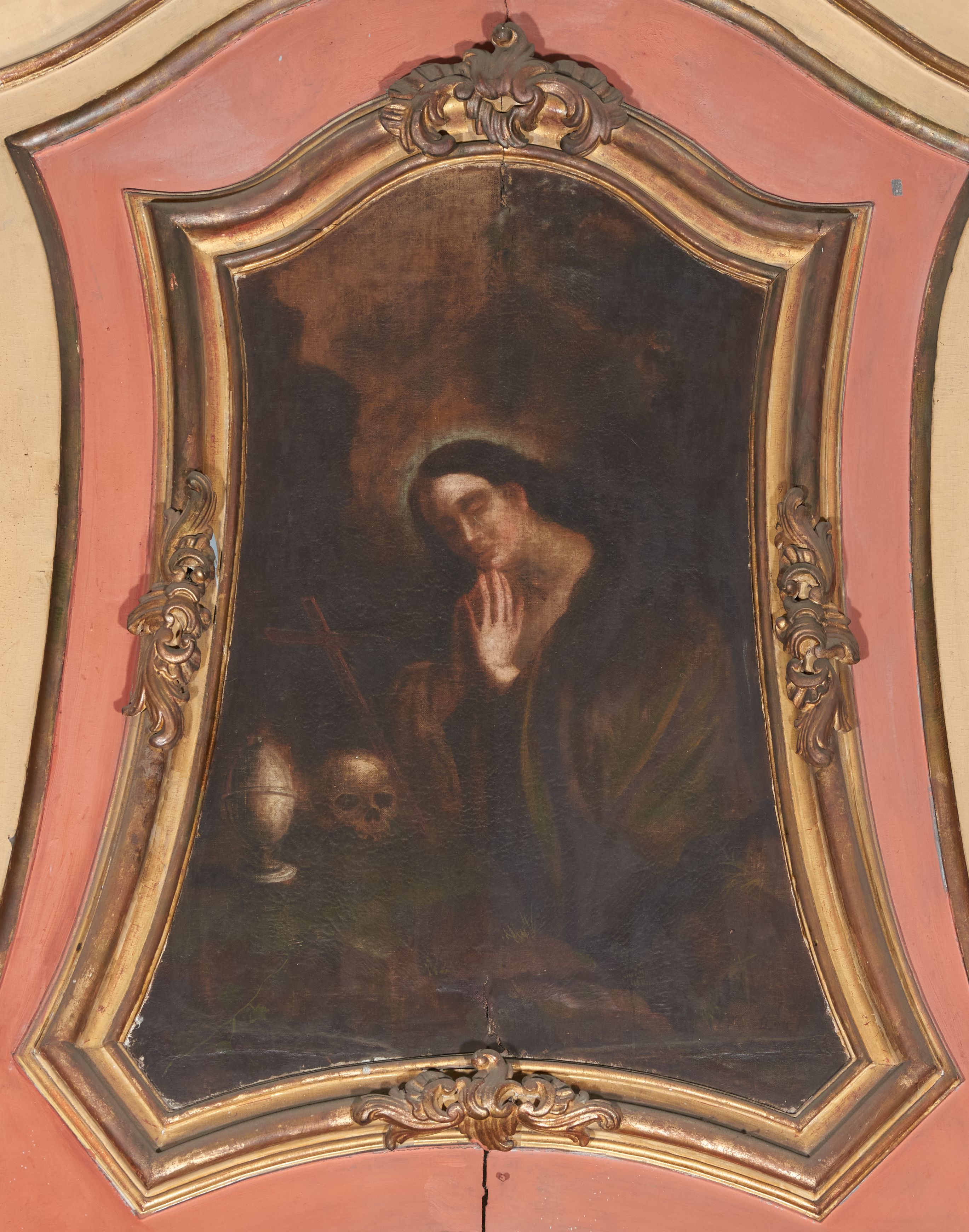 Maria Magdalena była jedną z niewiast, które podążyły za Chrystusem. W Piśmie Świętym została opisana jako kobieta, z której Jezus wypędził siedem demonów (Łk 8, 2). Święta ta była obecna przy ukrzyżowaniu i zmartwychwstaniu Jezusa. Część biblistów utożsamiało ją również z opisaną w Piśmie nierządnicą oraz siostrą Marty i Łazarza. Po wniebowstąpieniu Jezusa Maria Magdalena razem z rodzeństwem i innymi towarzyszami wyruszyła w podróż statkiem pozbawionym steru i dopłynęła do Marsylii. Na miejscu nawrócili oni parę książęcą, św. Łazarz został biskupem Marsylii, a Maria Magdalena udała się do pustelni na 30 lat. Omawiany obraz przedstawia pokutującą w pustelni Marię Magdalenę. Zgodnie z ikonografią święta ma rozpuszczone włosy, a jej ciało zakryte jest brązowym płaszczem pokutnym. Krzyż, czaszka i księga, które leżą przed nią na skale symbolizują pokutę.