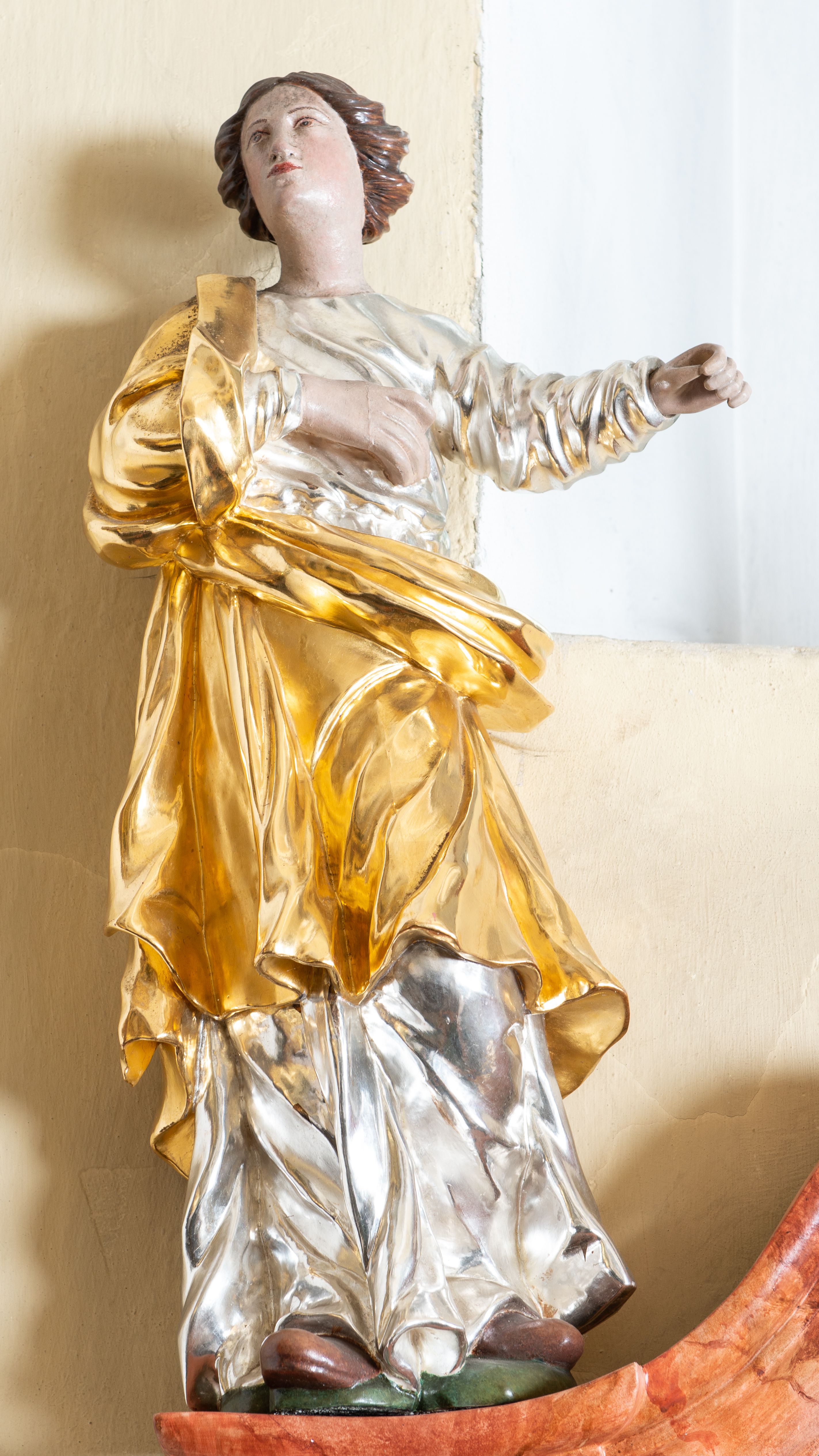 Ubrana jest w srebrzoną suknię z długimi rękawami oraz złocony płaszcz przewieszony przez prawe ramię i spływający z przodu przez biodra. Na stopach ma brązowe buty. Polichromia w odsłoniętych partiach ciała naturalistyczna.