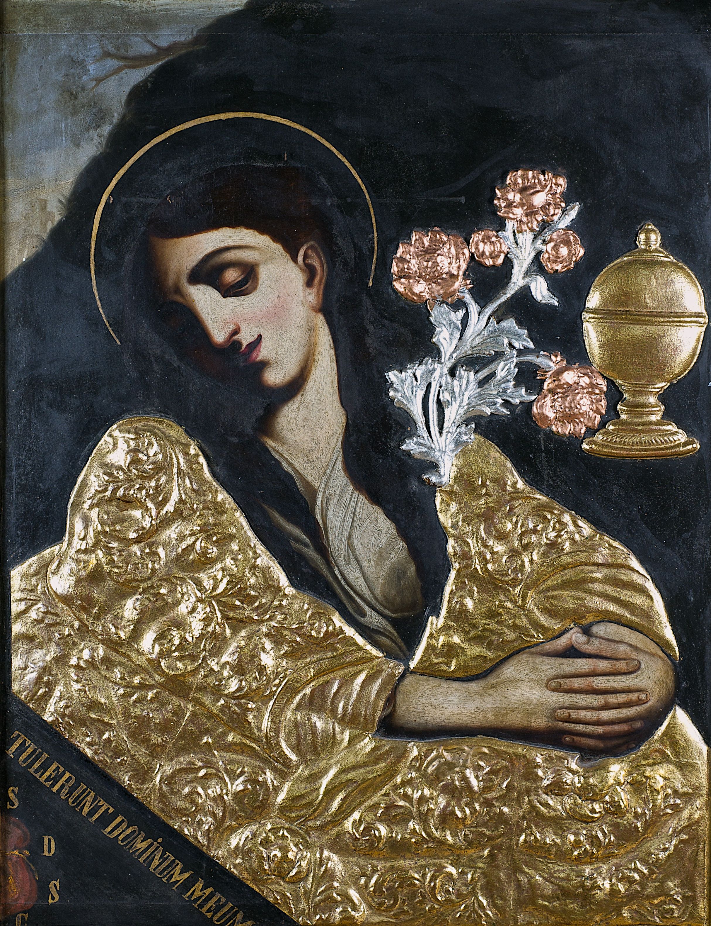 Na awersie przedstawienie św. Marii Magdaleny z kwitnącą gałązką oraz pojemnikiem na olej. Święta została ukazana w półpostaci, z głową przechyloną na prawe ramię i rękami złożonymi przed sobą. Przykryta rzeźbioną, złoconą sukienką dekorowaną motywami roślinnymi. Lewy, dolny narożnik odcięty, a w nim napis: „TULERUNT DOMINUM MEUM” oraz sygle „S D S C”.