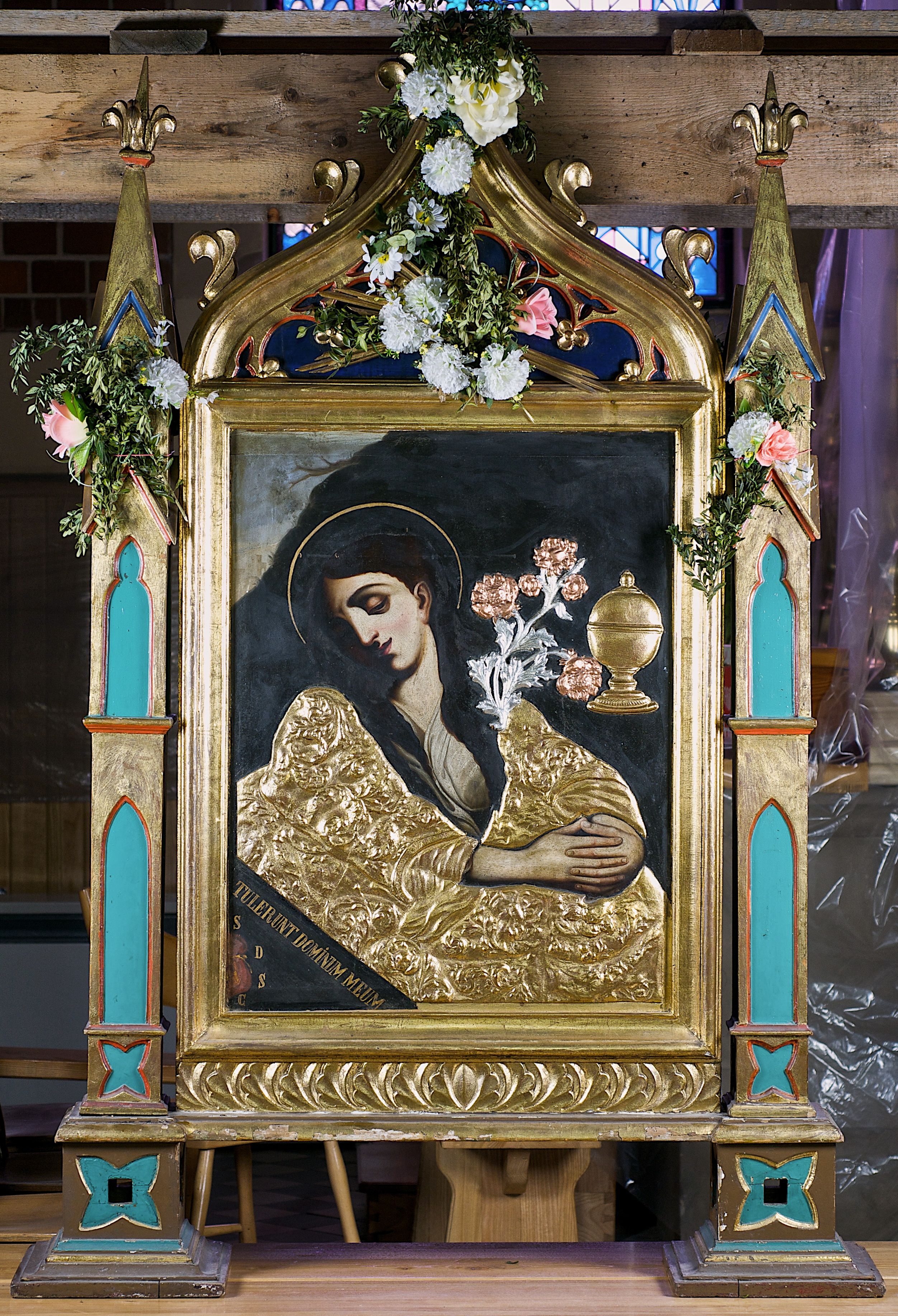 Feretron w formie obrazu w kształcie stojącego prostokąta w neogotyckiej ramie utworzonej z flankujących przedstawienie pinakli zakończonych kwiatonami. Zwieńczenie w formie łuku w ośli grzbiet wypełnionego maswerkowaniem, zdobionego żabkami i spiętego kwiatonem.