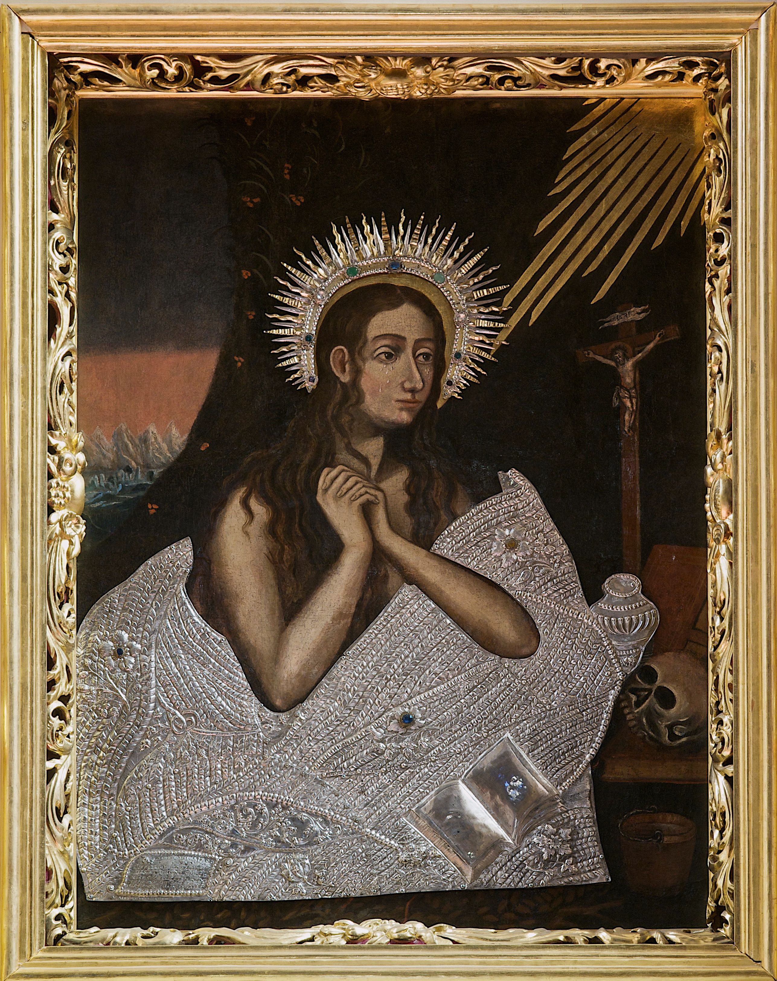 Maria Magdalena, która jest tematem przedstawienia, jest utożsamiana z jawnogrzesznicą, która nawróciła się po spotkaniu z Jezusem. Towarzyszyła mu aż do śmierci i jako pierwsza przekazała apostołom wieść o zmartwychwstaniu. Ukazana jest w typowym ujęciu, w czasie pokuty, jakiej miała oddawać się przez 30 lat na pustyni: z długimi, rozpuszczonymi włosami oraz ludzką czaszką. Krzyż nawiązuje do faktu jej obecności na Kalwarii w czasie męki Jezusa, otwarta księga jest znakiem działalności misyjnej. Stojące pod krzyżem naczynie z olejem przypomina scenę obmycia Zbawicielowi nóg przez jawnogrzesznicę, oraz przyniesienie przez nią do grobu Jezusa wonności służących do namaszczenia ciała.