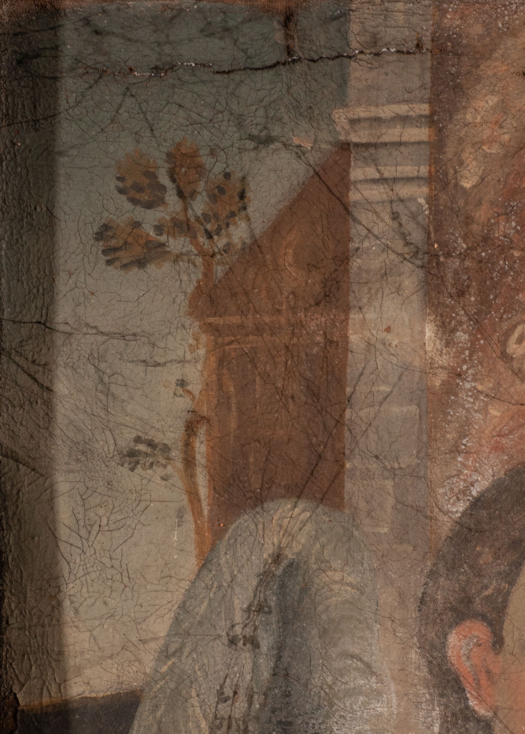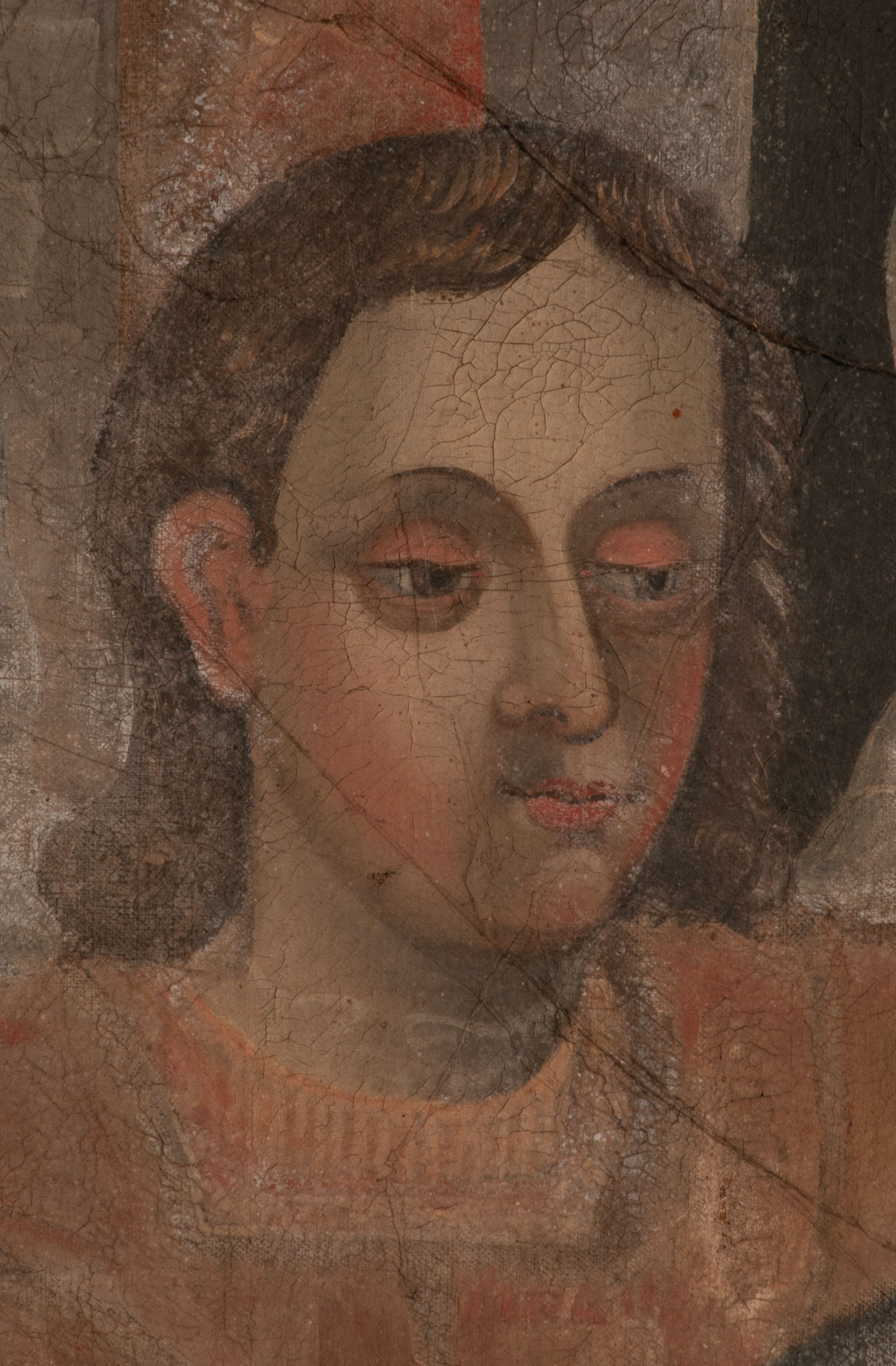 Płótno podziurawione. Silne przetarcia i ubytki warstwy malarskiej, ściemniała kolorystyka.