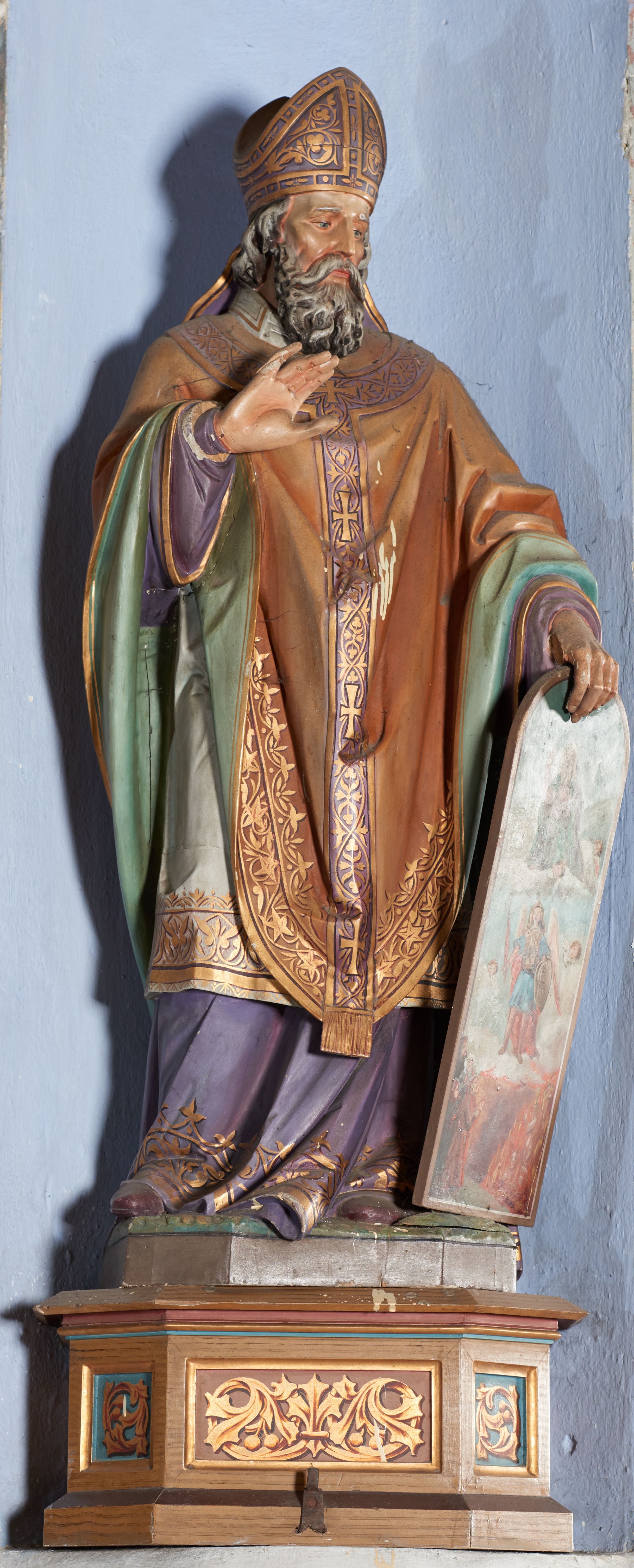 Rzeźba pełnoplastyczna przedstawiająca św. Metodego ustawiona na niskim, wielobocznym cokole. Figura ukazana frontalnie, w lewej ręce trzyma ikonę, prawą unosi w geście oratorskim. Twarz pociągła, o wyrazistych rysach, okolona dzielącą się w pukle siwiejącą brodą, wzrok skierowany przed siebie, w dół. Włosy siwiejące, opadające na kark. Święty jest ubrany w fioletową albę, u spodu dekorowaną malowanym ornamentem roślinnym, jasnozieloną rokietę oraz bogato dekorowany, brązowy, dekorowany złotym ornamentem ornat, na którą ma nałożony złoto-fioletowy paliusz; na głowie fioletowo-złota infuła. Ikona w kształcie wydłużonego, stojącego prostokąta zamkniętego łukiem półkolistym z przedstawieniem Sądu Ostatecznego. Pośrodku Michał Archanioł z mieczem i tarczą w rękach, powyżej Bóg Ojciec, a w dolnej części piekło i zmierzające do niego dusze. Polichromia w odsłoniętych partiach ciała naturalistyczna.