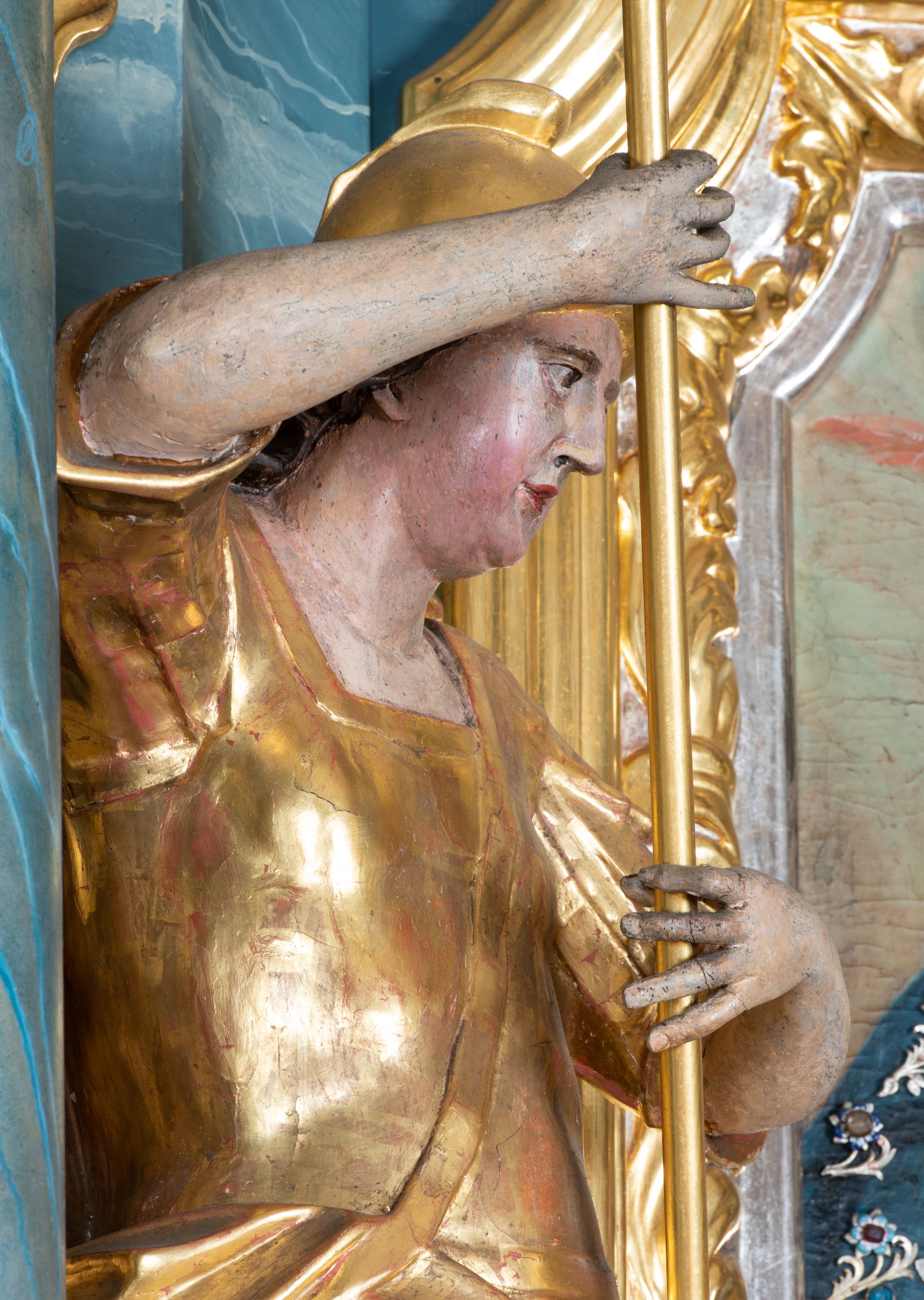 Zabrudzenia; spękania i przetarcia warstwy polichromii i złoceń.