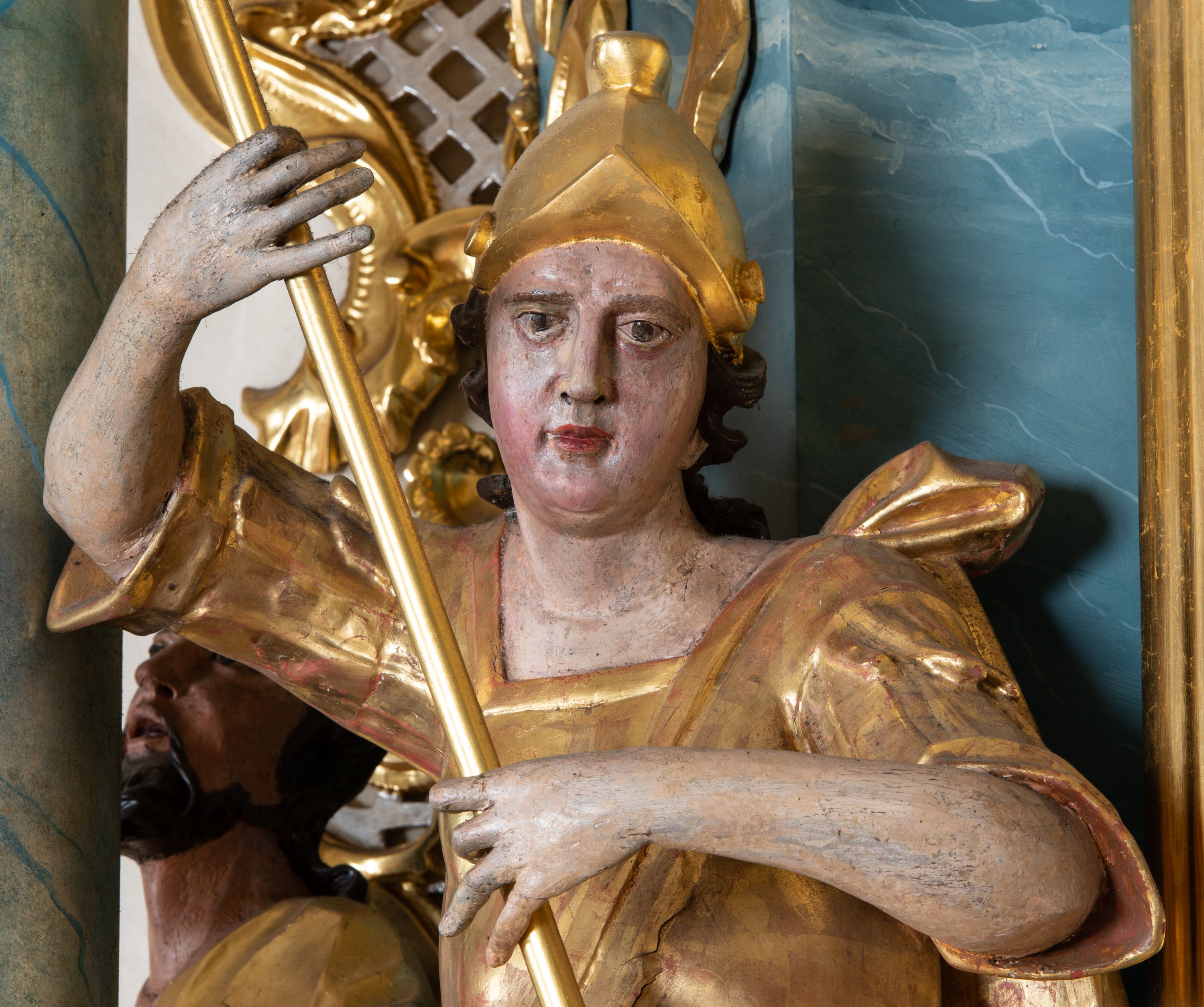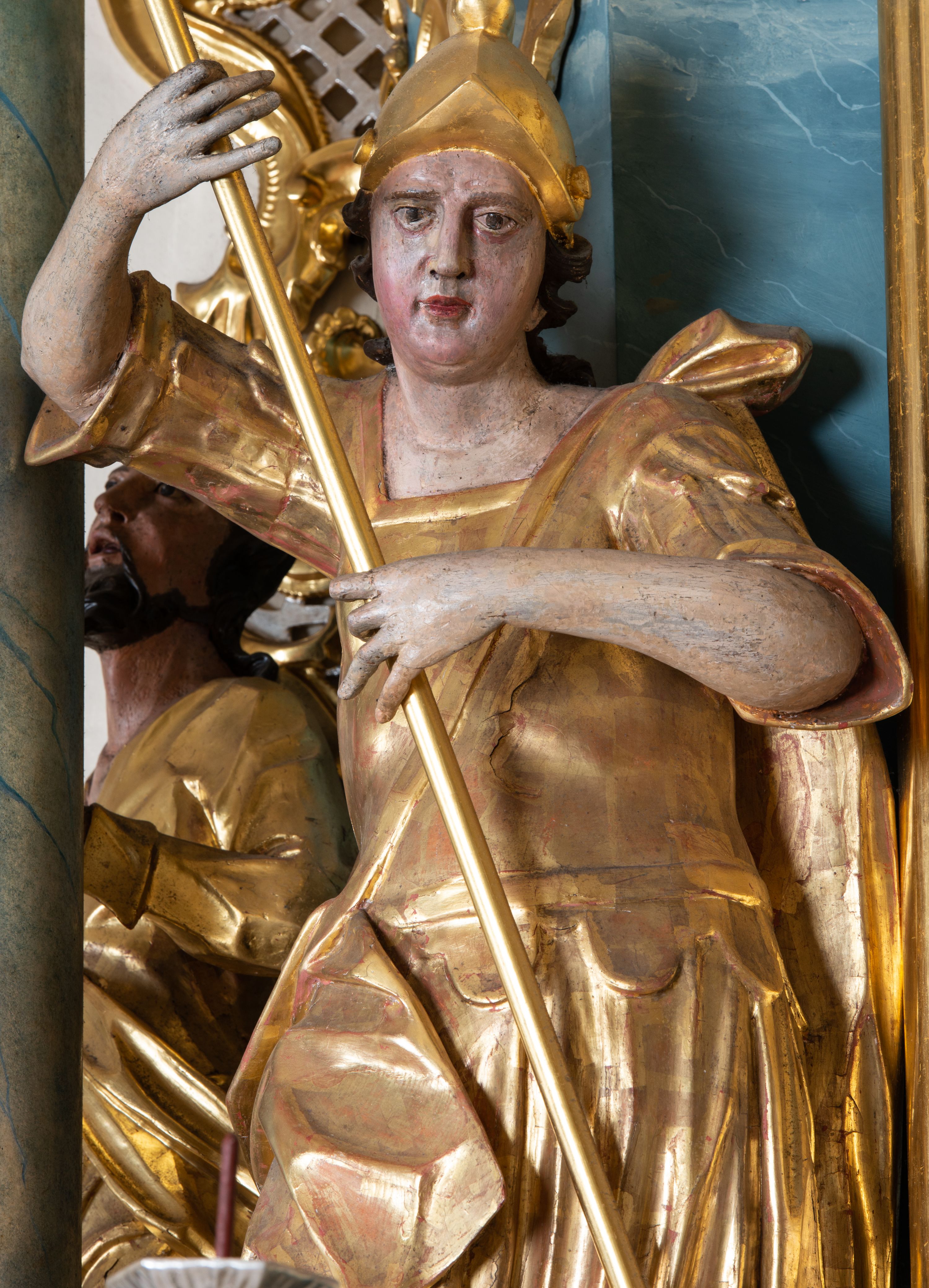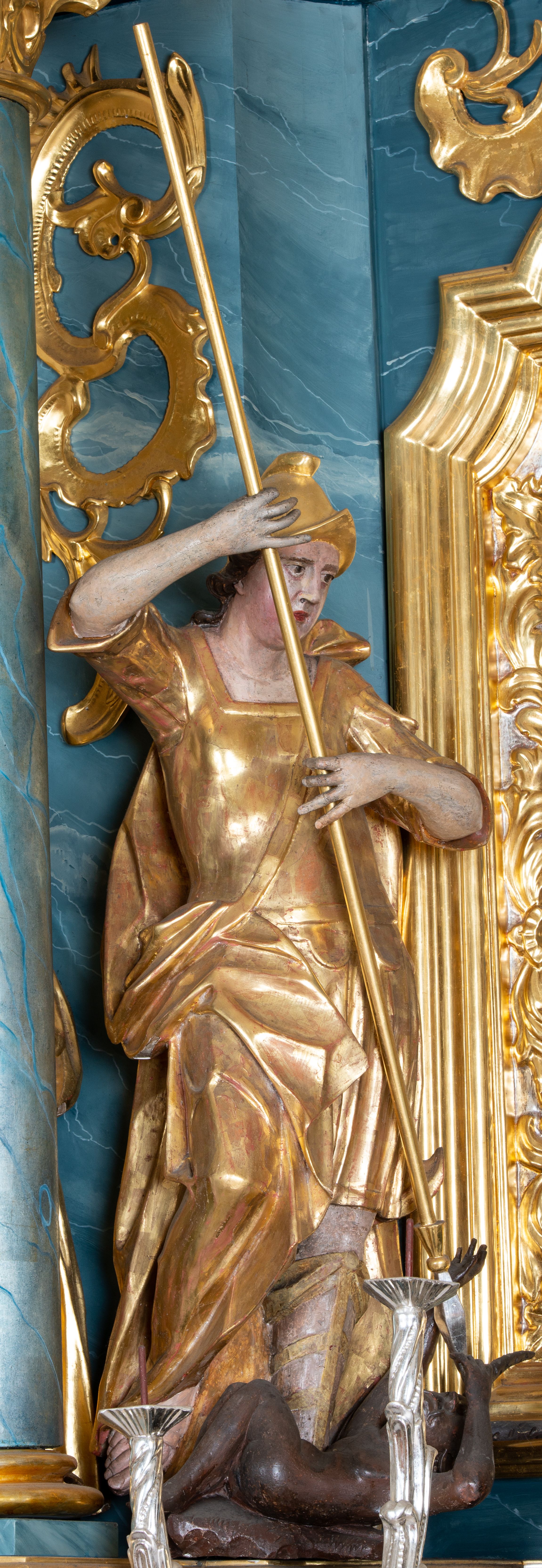Figura ścięta z tyłu, drążona, zwrócona w trzech czwartych w prawo, w kontrapoście. Święty obiema rękami trzyma włócznię skierowaną w dół w stronę leżącego u jego stóp diabła. Twarz ma pociągłą, o migdałowatych oczach, lekko garbatym nosie, pełnych ustach, okoloną długimi, silnie kręconymi włosami. Postać w stroju żołnierza, w tunice sięgającej kolan, zbroi oraz w płaszczu zarzuconym na plecy i opadającym na prawą nogę, przewiązanym taśmą przez tors, na głowie ma hełm. Ciało polichromowane naturalistycznie, strój złocony.