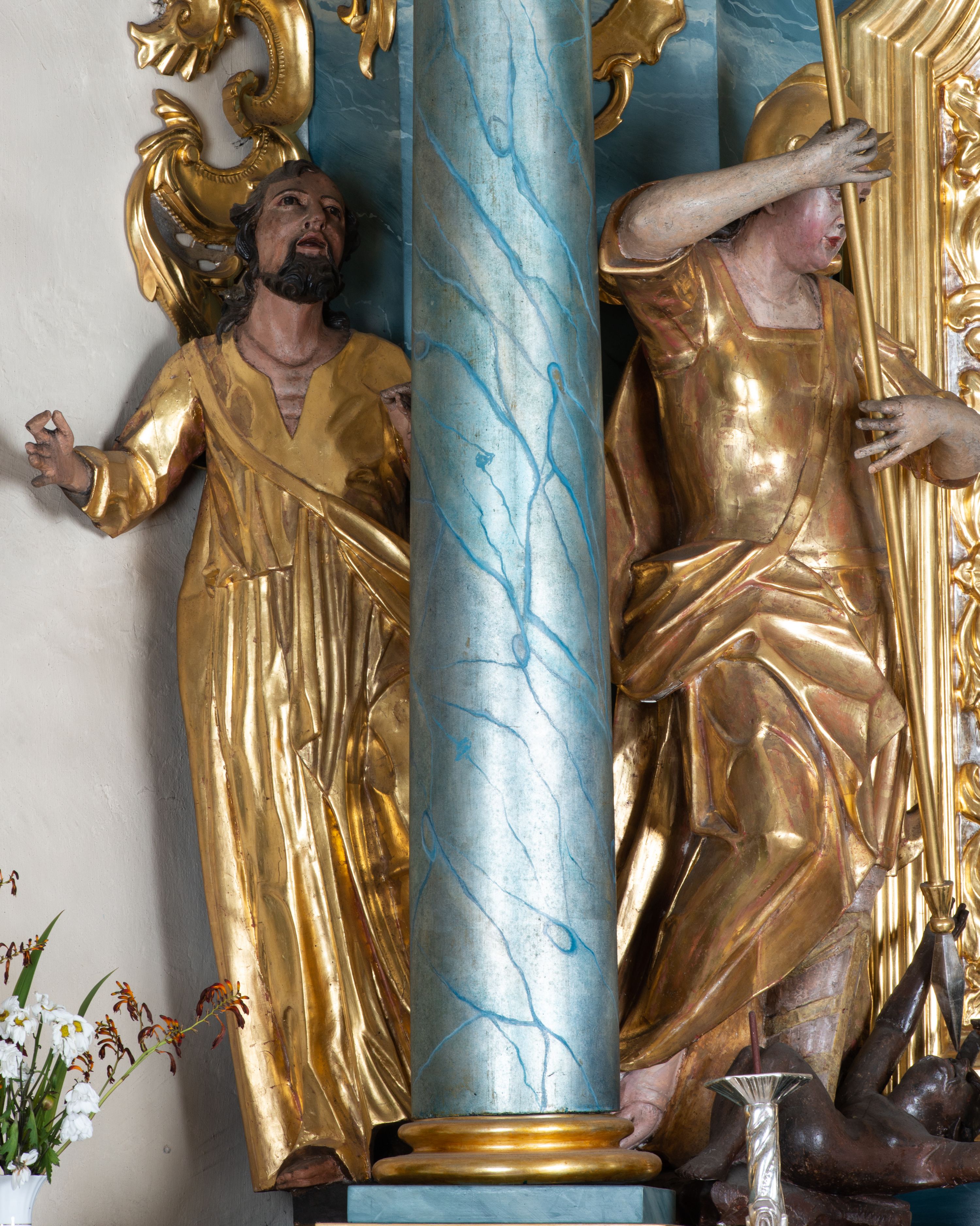 Dekoracja rzeźbiarska ołtarzy bocznych jest niejednorodna, wykonana niewątpliwie przez kilku artystów. Osiem głównych figur w obu retabulach można potraktować jako spójny formalnie zespół, wyróżniający się pod względem poziomu wykonania spośród pozostałej dekoracji rzeźbiarskiej kościoła. Wszystkie figury charakteryzuje ten sam typ twarzy ze znamiennie rzeźbionymi wąskimi wąsami oraz silnie skręconymi puklami brody i włosów. Sylwetki pozowane są dosyć zachowawczo, zaś we wszystkich przypadkach tkanina ściśle przylega do ciała i jest obficie drapowana. Figury zostały wykonane niewątpliwie przez tego samego artystę, którym z dużym prawdopodobieństwem był nieznany z nazwiska rzeźbiarz z Preszowa.