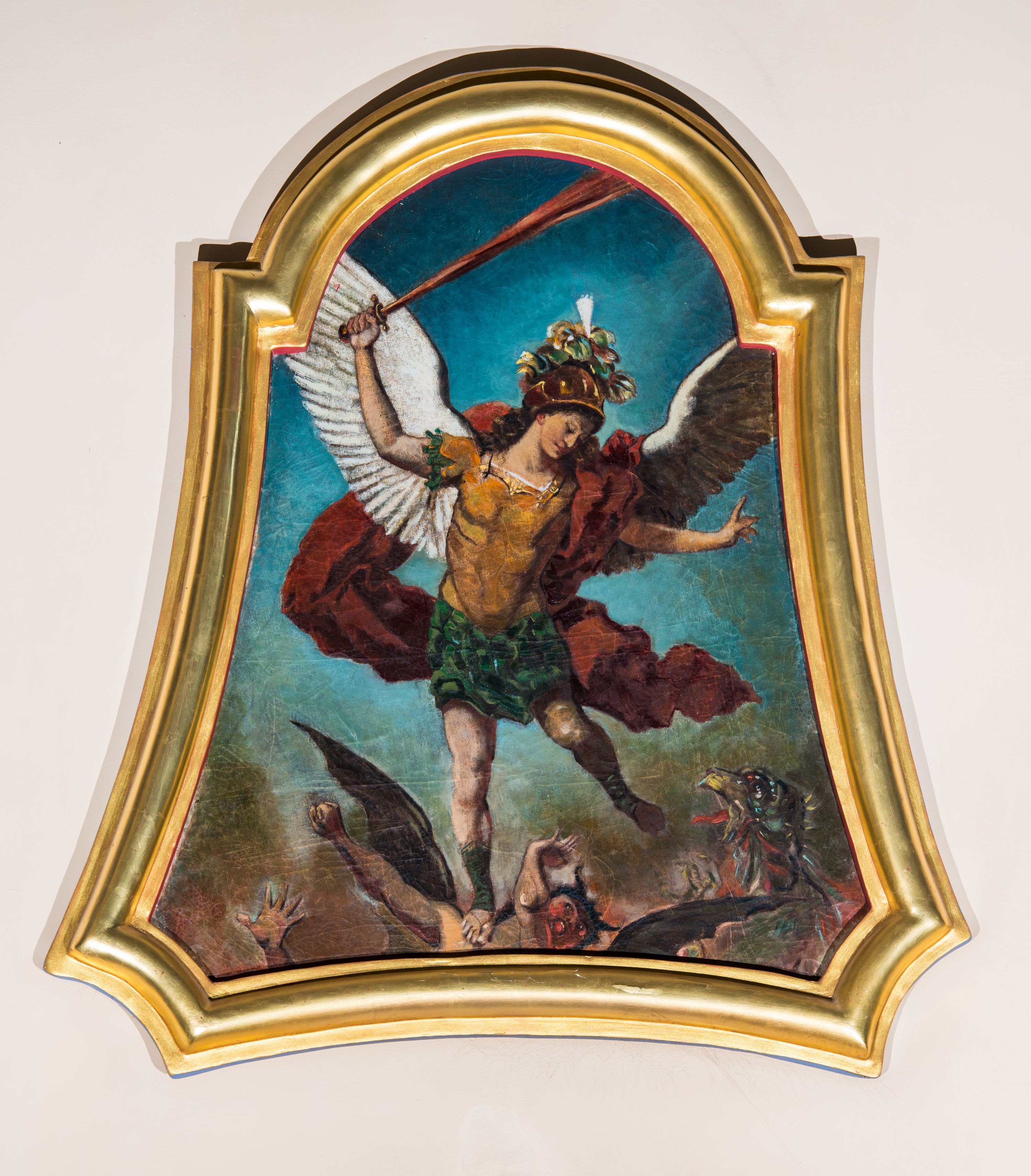 Obraz z przedstawieniem Michała Archanioła walczącego z szatanem. W centrum kompozycji archanioł w momencie ataku unosi się powyżej szatana na rozpostartych skrzydłach. W prawej ręce trzyma skierowany ostrzem w górę ognisty miecz, lewą unosi do boku. Archanioł ma małą, okrągłą głowę, długie, falowane włosy spływają mu na plecy. Jest ubrany w strój żołnierza rzymskiego: złoty pancerz z naramiennikami założony na zieloną tunikę i sandały. Czerwony płaszcz zarzucony na lewe ramię rozwiewa się dynamicznymi za plecami. W dolnej partii obrazu szatan zobrazowany jako człowiek z rogami i skrzydłami, uchyla się przed nadchodzącym ciosem. W prawym, dolnym rogu widać zielonego stwora z otwartym dziobem i rozpostartymi pazurami, w lewym wyciągniętą dłoń. Tło utrzymane w chłodnej, niebieskiej tonacji, ciemnieje w dolnej partii obrazu. Obraz w złoconej, profilowanej ramie o wklęsło-wypukłym kształcie.