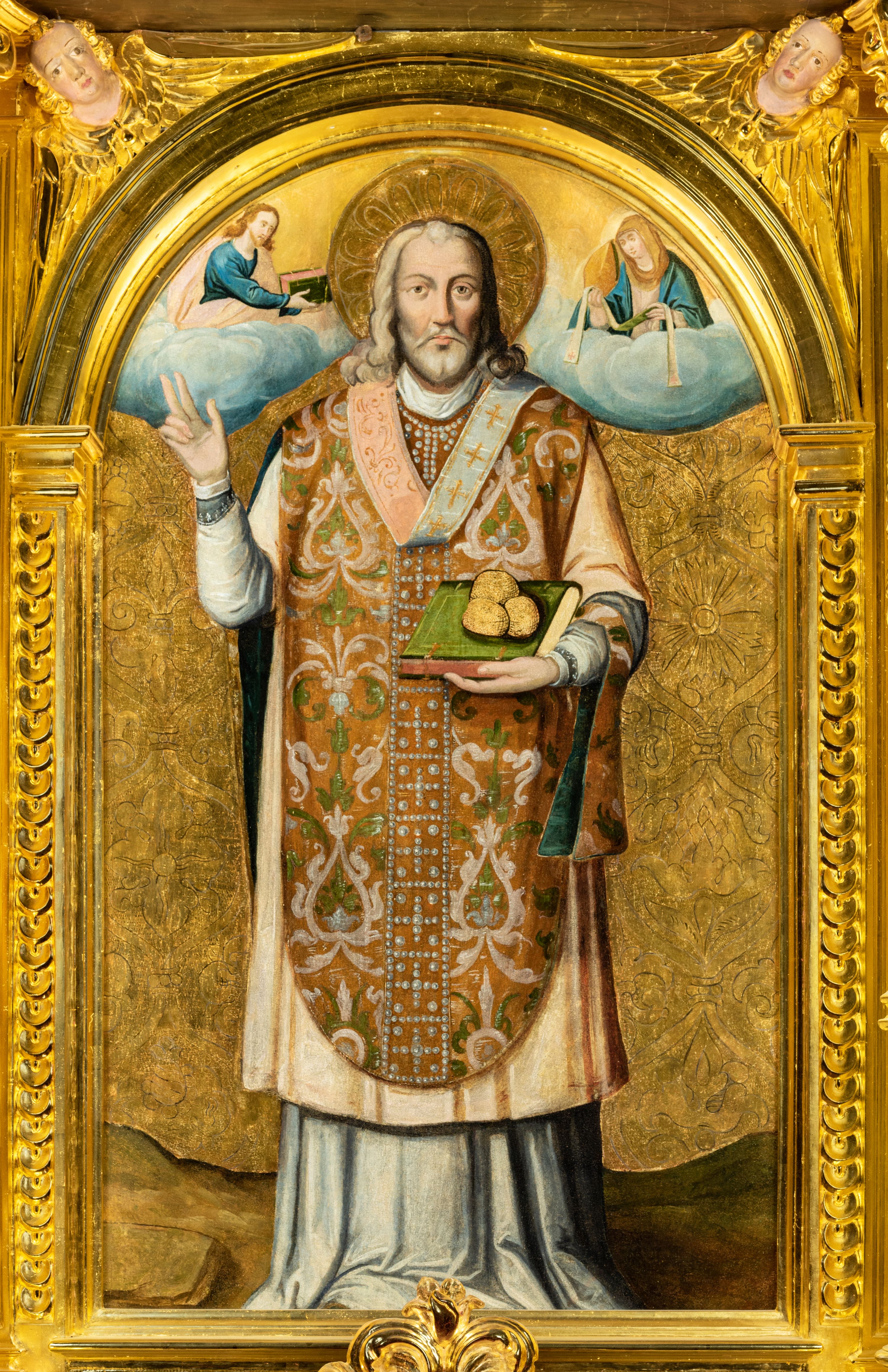 Obraz w kształcie stojącego prostokąta zamknięty łukiem półkolistym. Przedstawienie ujęte profilowaną i złoconą ramą dekorowaną pilastrami o trzonach wypełnionych motywem cekinów. W centrum kompozycji frontalne przedstawienie stojącego św. Mikołaja ukazanego na tle jednolitego złoconego tła z rytą, symetryczną dekoracją kwiatową. W dolnej części obrazu skaliste podłoże. Święty został przedstawiony jako dojrzały, siwowłosy mężczyzna z zarostem, wąsami i krótką brodą. Podłużną twarz o dużych, ciemnych oczach oraz długim prostym nosie okalają lekko falowane włosy sięgające ramion oraz złocony nimb. Postać w swojej lewej ręce trzyma zamkniętą księgę w zielonej oprawie, na której spoczywają trzy złote kule. Prawą rękę, ugiętą w łokciu i uniesioną ku górze święty wykonuje gest błogosławieństwa. Mikołaj ubrany jest w szaty biskupie: sięgającą ziemi albę o rękawach wykończonych koronką, beżową komżę oraz bogato zdobiony ornat. Boki ornatu w kolorze sepii zdobione są motywem owoców granatu; kolumna wyszywana jest perłami we wzór krzyży wpisanych w kwadrat. Przez lewe przedramię świętego przewieszony manipularz wykonany z ciemnozielonej tkaniny; wokół szyi biały humerał. Na piersi postaci widoczny biały omoforion z motywem złotych równoramiennych krzyży. W górnej części kompozycji, na wysokości głowy św. Mikołaja, ukazane obłoki z postaciami Chrystusa trzymającego w ręku zamkniętą księgę (z lewej) oraz Marii podtrzymującej złotą mitrę biskupią oraz stułę (omoforion?). Obie postaci ukazane w mniejszej skali, zwracają się w kierunku świętego.