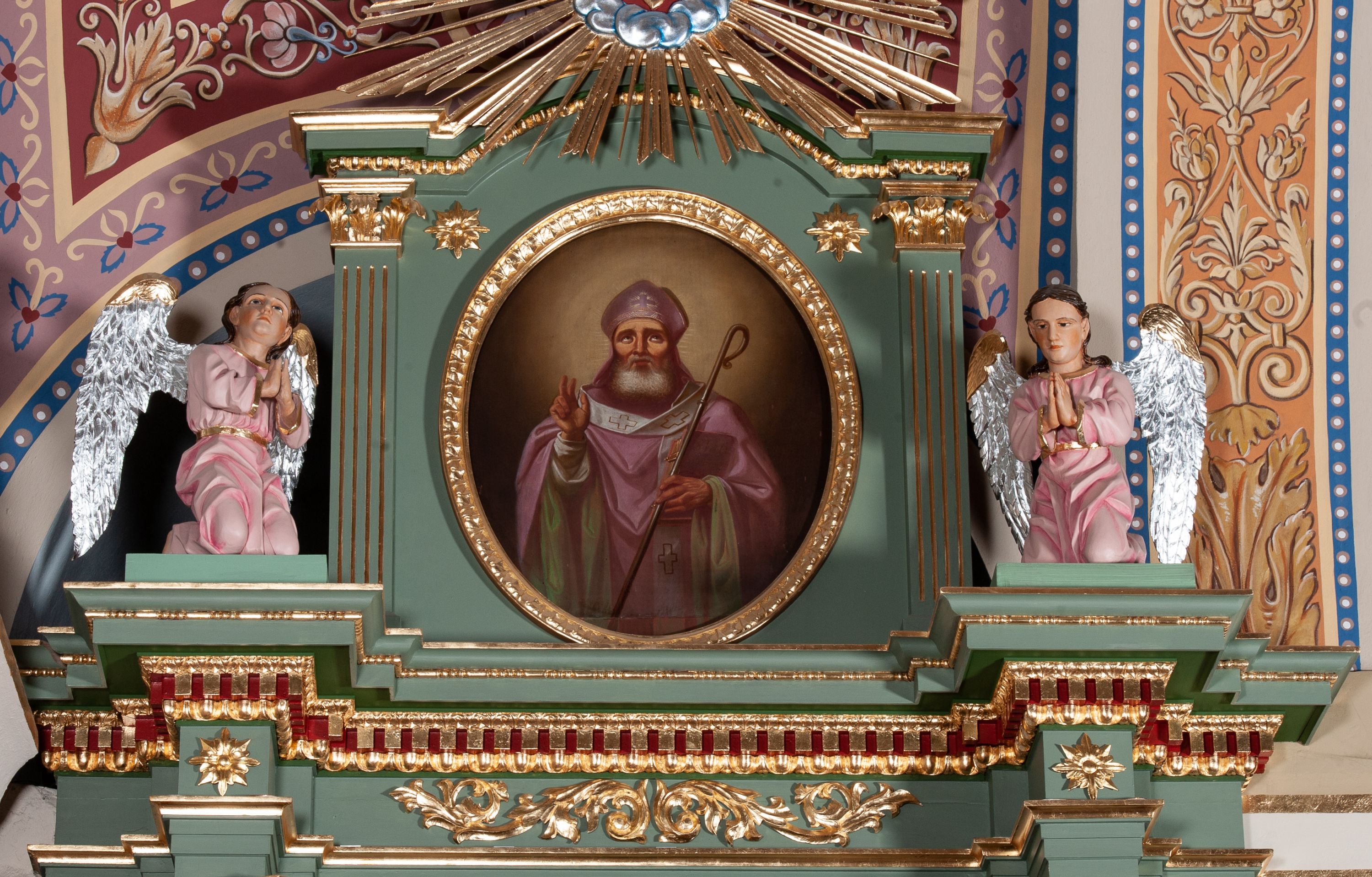 Obraz w kształcie owalu z przedstawieniem św. Mikołaja. Święty ukazany w półpostaci, frontalnie, z prawą ręką wzniesioną w geście błogosławieństwa, z pastorałem w lewej, w której przytrzymuje również księgę. Twarz szeroka o wyraźnie podkreślonych kościach policzkowych, oczy wzniesione ku górze, broda siwa i gęsta. Ubrany jest w białą albę, różowy i szeroki ornat z zieloną podszewką oraz biały paliusz. Na głowie ma założoną fioletową infułę, zdobioną prostym krzyżykiem. Pastorał o prostych formach z zawiniętą krzywaśnią, bez zdobień. Księga w czerwonej oprawie z napisem „S(więty) Jan / Chryzostom / [...]”. Tło jednolite, ciemnobrązowe, rozjaśnione wokół głowy świętego. Rama drewniana, złocona, dekorowana kimationem.