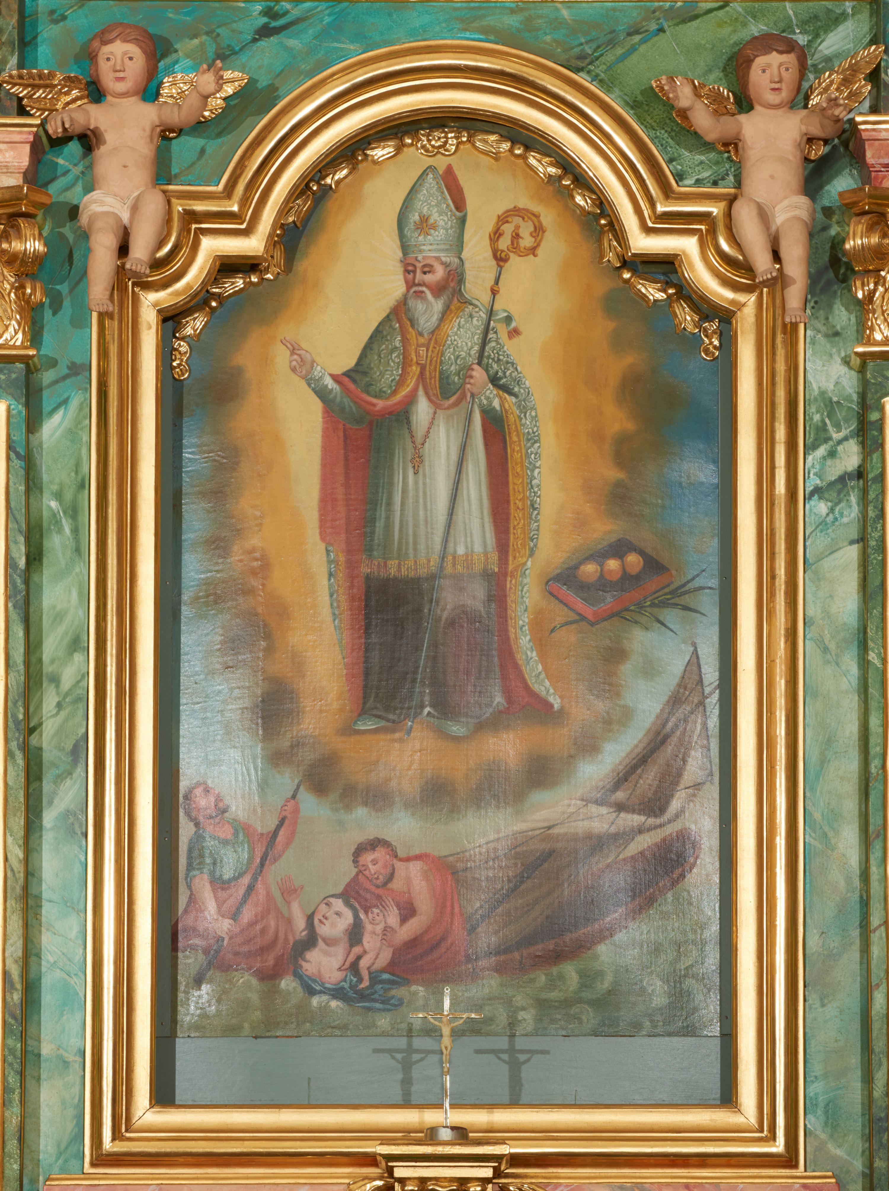 Obraz formalnie nawiązuje do dzieł wykonywanych w XIX wieku, jednak z powodu braku źródeł archiwalnych dotyczących powstania płótna nie udało się dotąd ustalić jego autora. Przedstawia św. Mikołaja, biskupa Miry, który żył na przełomie III i IV wieku. Trzy złote kule, która leżą na księdze symbolizują dar, jaki św. Mikołaj ofiarował trzem ubogim pannom na posag. Postacie w dolnej strefie obrazu nawiązują do kolejnej legendy z żywota świętego, według której miał ocalić tonących rozbitków na morzu. Z kolei biskupi strój świętego i księga wskazują na jego udział w misji duszpasterskiej, w czasie gdy był biskupem Miry w Licji. Święty Mikołaj miał również uczestniczyć w obradach soboru nicejskiego w 325 roku.
