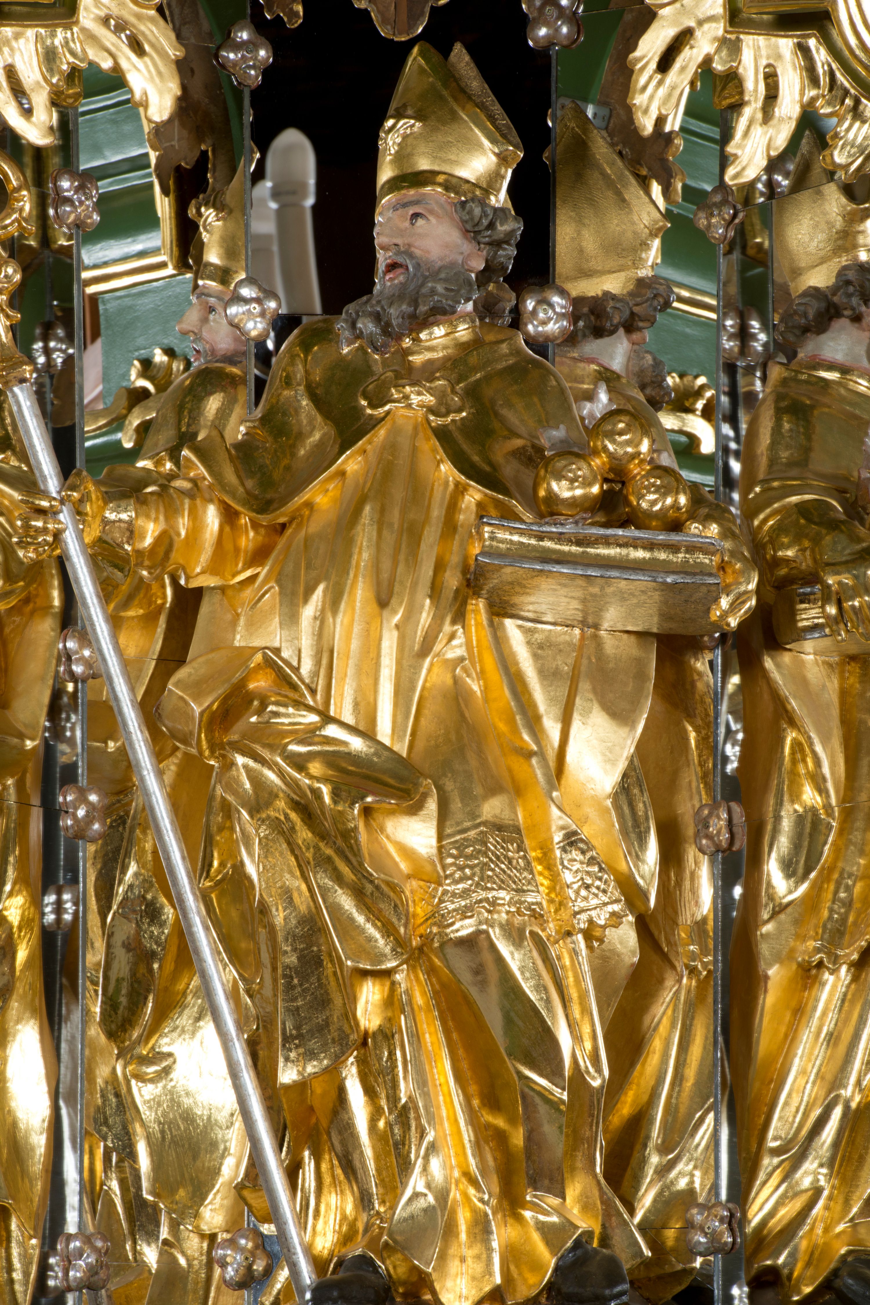 Święty Mikołaj był biskupem Miry w Azji Mniejszej. Wrażliwy na ludzkie cierpienia i biedę prowadził szeroką działalność charytatywną. Obraz nawiązuje do legendy, według której święty pomógł ubogiej rodzinie, w której trzy córki miały zarobić na swój posag, pracując jako nierządnice. Przekazał tej rodzinie trzy sakiewki ze złotem – przyszły posag dla każdej z nich. Z czasem sakiewki zaczęto przedstawiać jako złote jabłka lub złote kule. Księga, na której leżą, jest symbolem prawd wiary.