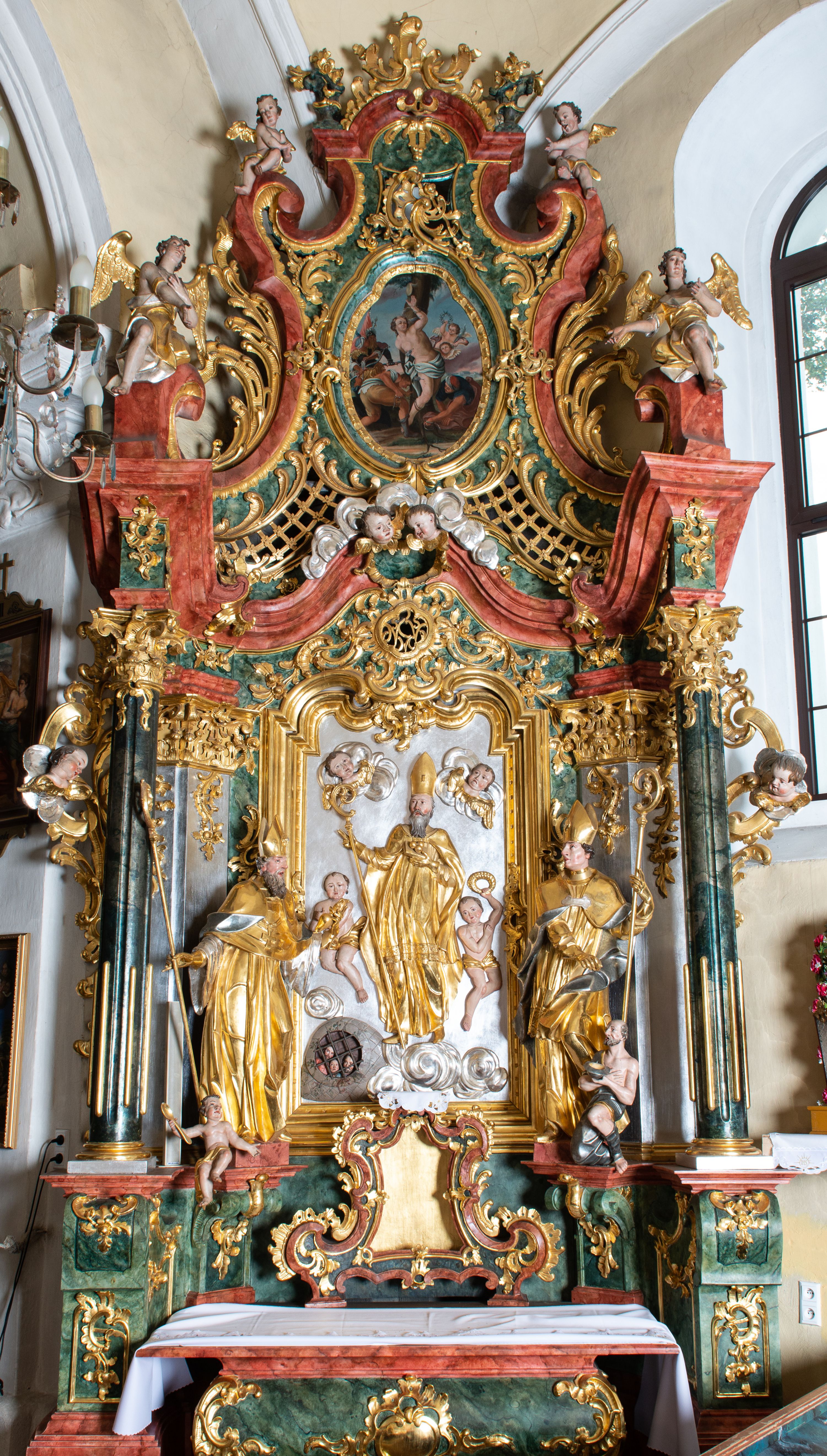 Rzeźbę św. Mikołaja wykonał prawdopodobnie Franciszek Feeg, choć dekoracja rzeźbiarska tego ołtarza przypisywana jest w całości jego bratu Johannowi. Niewykluczone jednak, że podobnie jak w przypadku ołtarza głównego bracia współpracowali i Franciszek wykonał część środkową nastawy.