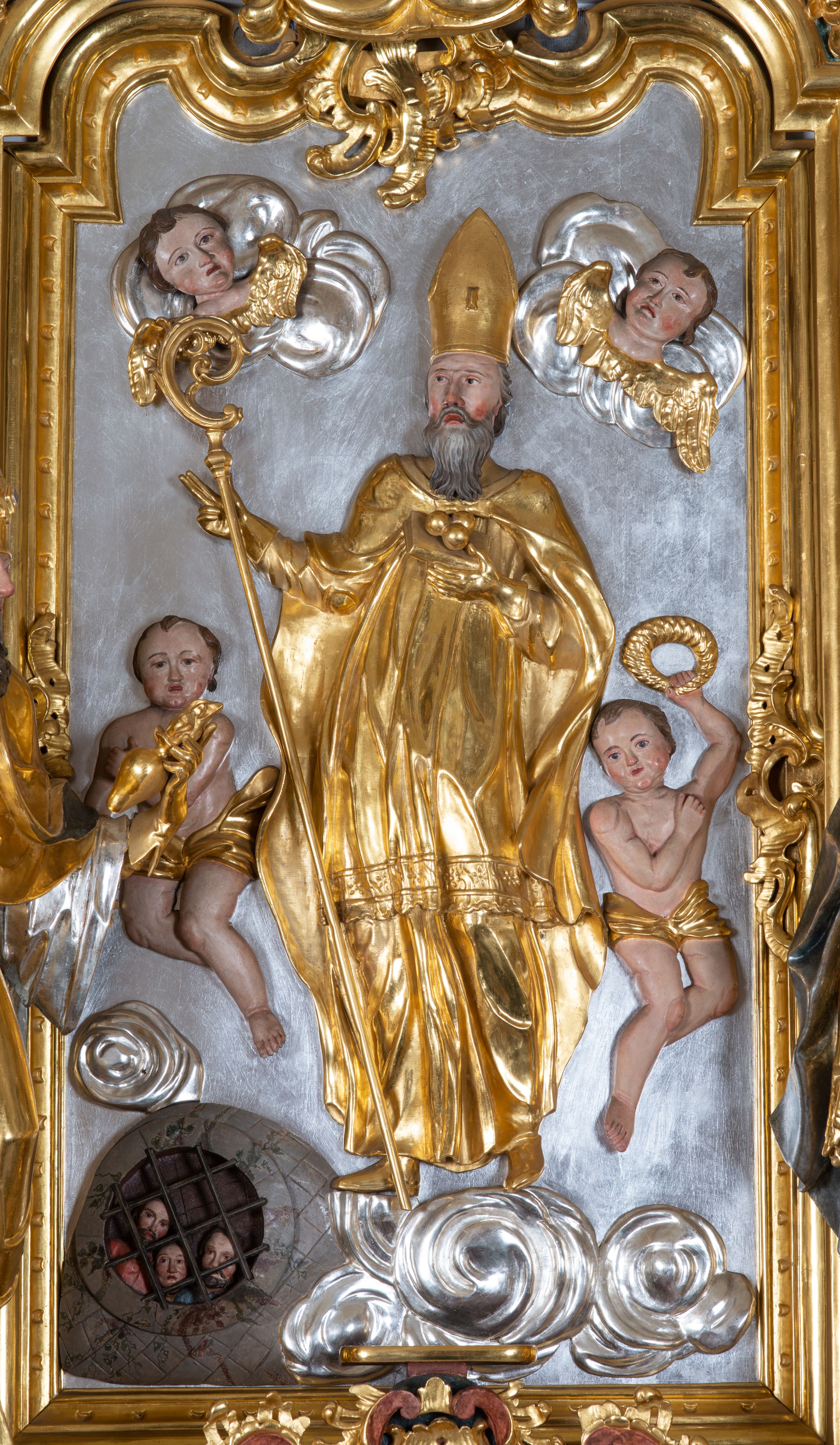 Święty Mikołaj, biskup Miry, żył na przełomie III i IV wieku. Atrybuty ukazane na płaskorzeźbie nawiązują do legend związanych z żywotem świętego biskupa. Trzy złote kule symbolizują dar, jaki św. Mikołaj ofiarował trzem ubogim pannom na posag. Trójka uwięzionych mężczyzn przypomina legendę o ocaleniu przez świętego biskupa trzech żołnierzy.
