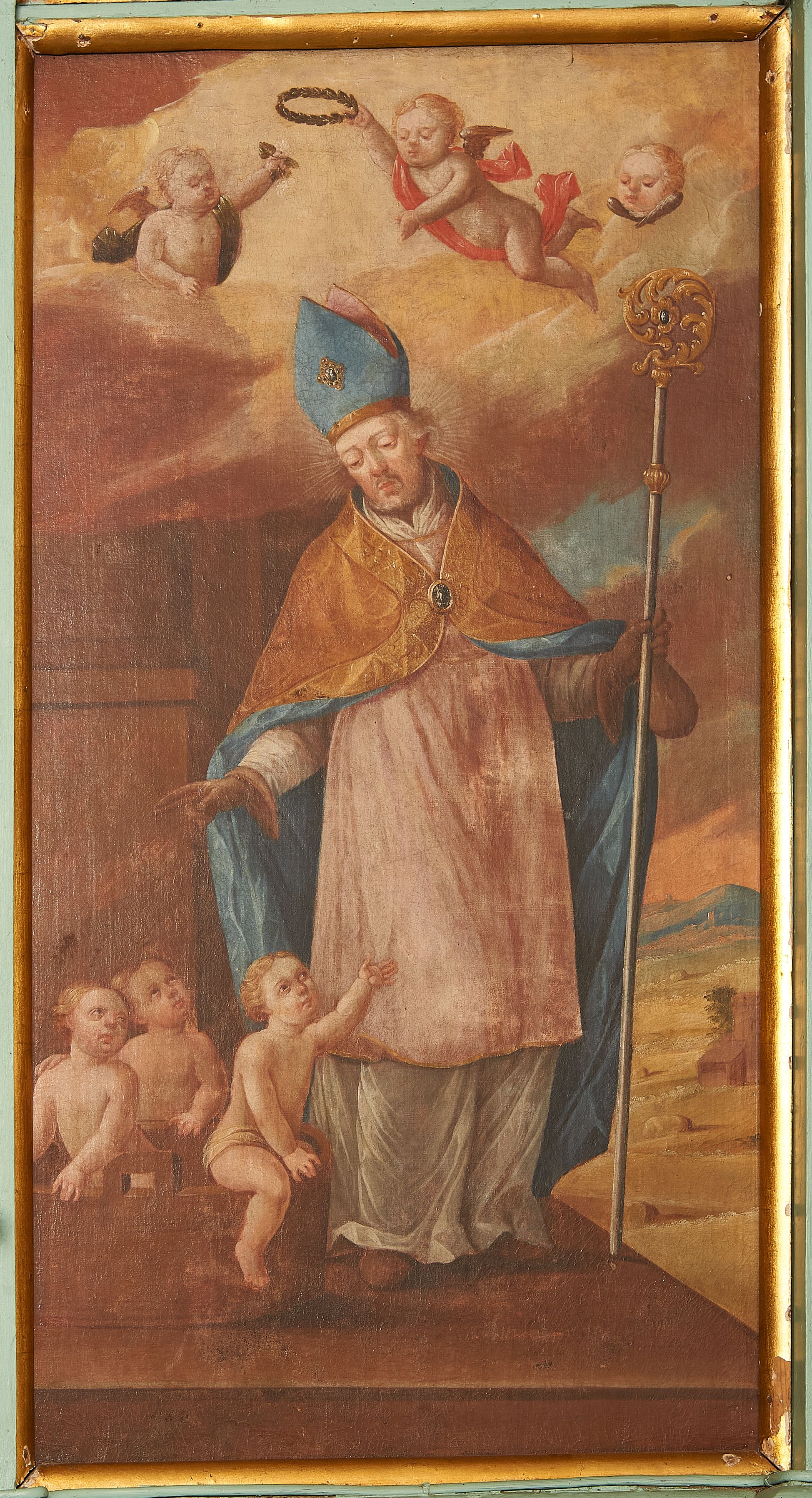 Obraz w kształcie stojącego prostokąta z przedstawieniem św. Mikołaja Biskupa, który ukazany został na brązowym podeście z sumarycznie oddaną, murowaną architekturą w tle. W centrum kompozycji ukazany jest w całej postaci św. Mikołaj ustawiony w delikatnym kontrapoście z prawą nogą ugiętą w kolanie, zwrócony delikatnie w lewo z górną częścią ciała przechyloną na prawo. Prawą rękę unosi w geście błogosławieństwa nad trójką dzieci w szafliku, a w lewej dłoni, odwiedzionej na bok trzyma pastorał i sakiewkę. Święty ma owalną twarz z przymkniętymi, dużymi oczami i długim nosem, okoloną siwą brodą oraz siwe średniej długości włosy. Ubrany jest białą albę, jasnoróżową komżę, biały humerał pod szyją, złotą kapę z niebieską podszewką; na dłoniach ma brązowe rękawice, a na głowie niebieską infułę, dekorowaną z przodu kameryzacją. W dolnym lewym narożu ukazana jest trójka dzieci w szafliku, z których jedno wychodzi z naczynia i wyciąga rączkę ku św. Mikołajowi. W górnej części obrazu pochmurne niebo i dwa aniołki, z których jeden trzyma w dłoni gałązkę białej róży, a drugi wieniec laurowy. W prawym górnym narożu znajduje się uskrzydlona główka aniołka ze skrzydełkami skierowanymi ku środkowi. Tło po lewej stronie obrazu stanowi fragment architektury, a po prawej stronie pejzaż. Kolorystyka w ciepłej, subtelnej i brunatnej tonacji.