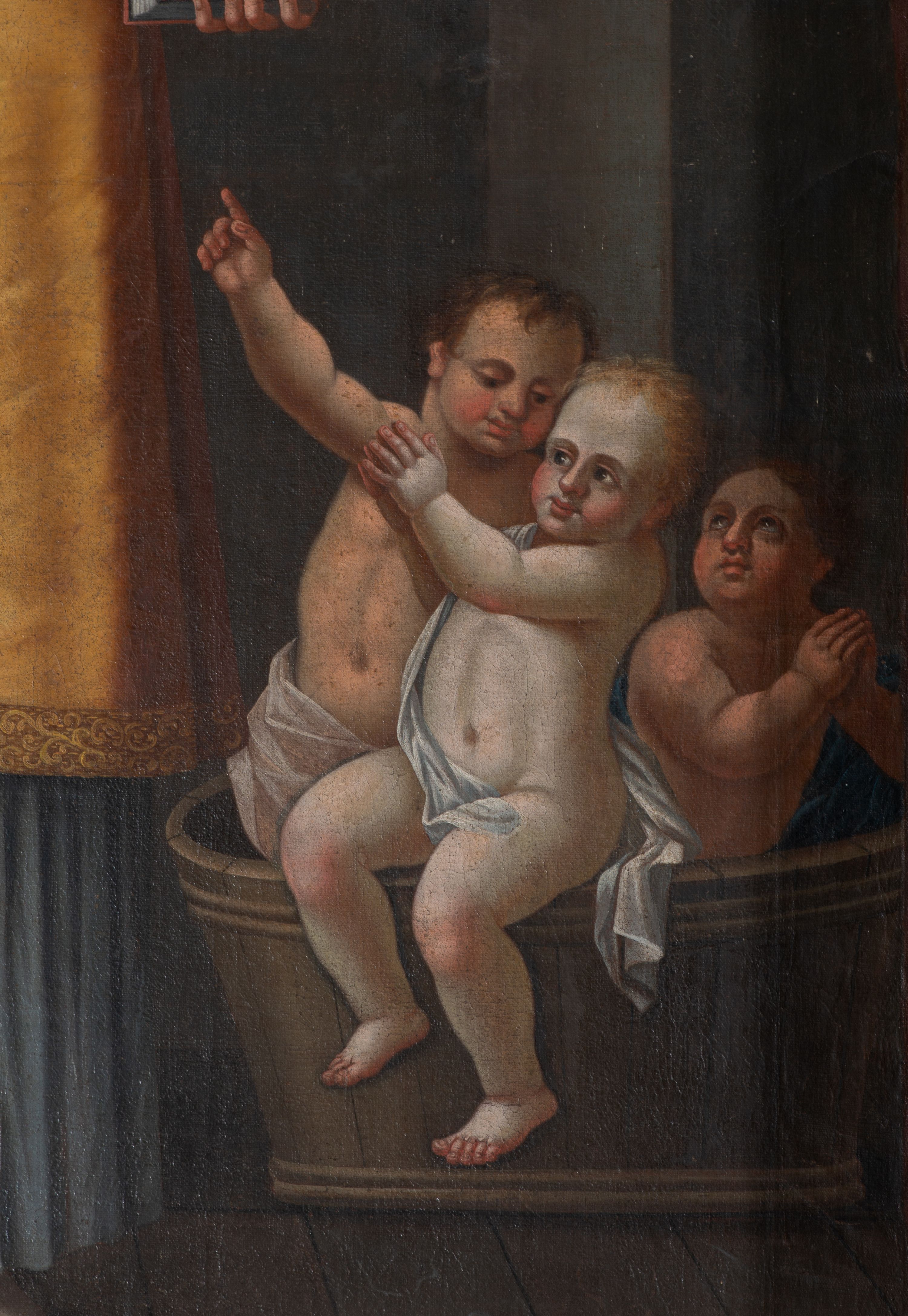 Krakelury na całej powierzchni, drobne ubytki warstwy malarskiej, zabrudzenia, widoczne naprawy płótna.
