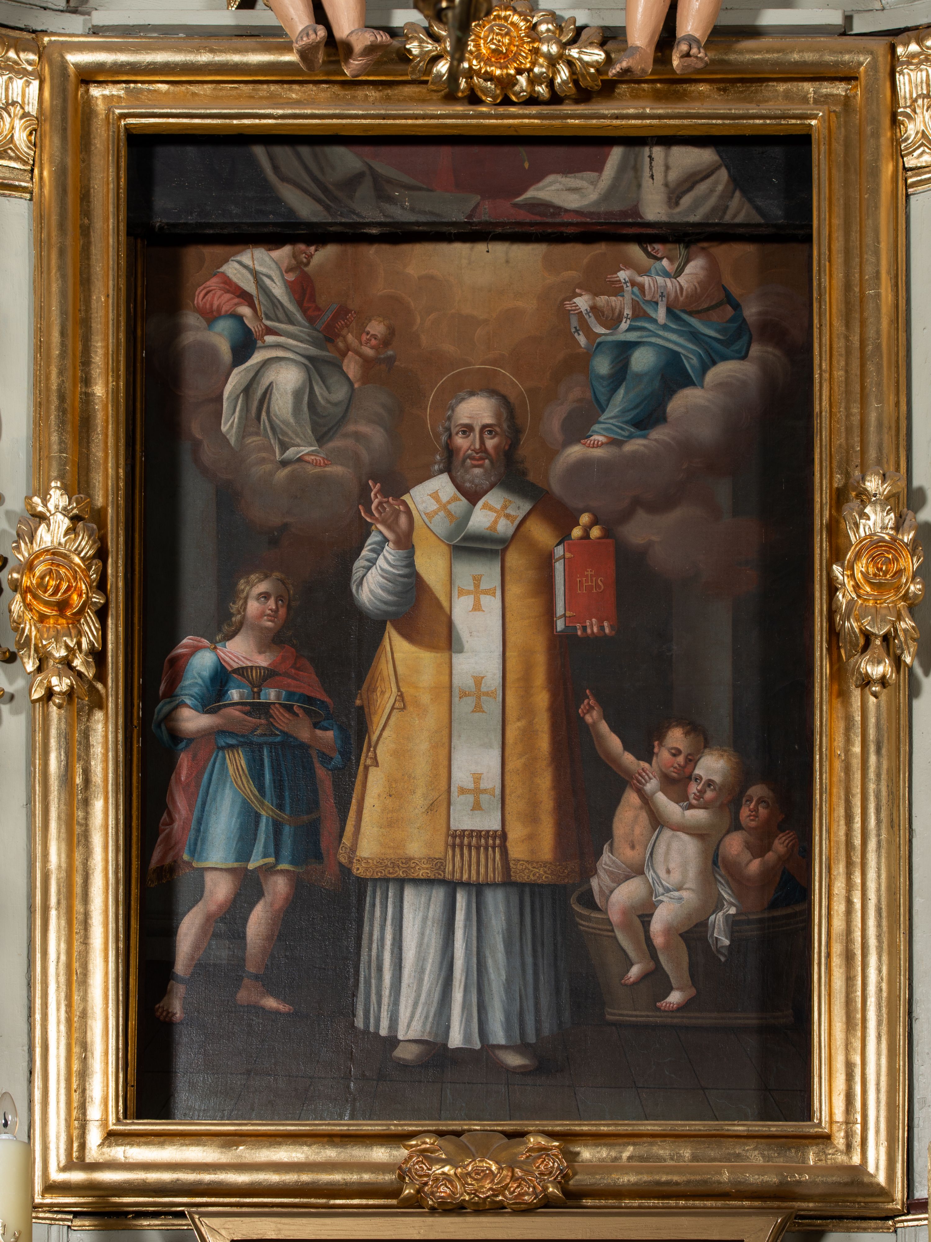 Święty Mikołaj był biskupem Miry, dlatego przedstawiany jest w stroju odpowiadającym tej godności (obrządku zachodniego lub wschodniego). Jego atrybutem jest trzymana w ręku księga Ewangelii. Postacie i przedmioty towarzyszące świętemu odnoszą się do licznych cudów i legend związanych z jego życiem. Trzy kule leżące na księdze odwołują się do legendy, według której Mikołaj uratował trzy córki mieszczanina od nierządu dzięki podarowaniu im w posagu złotych kul. Trójka chłopców w szafliku nawiązuje do historii o uchronieniu ich przez biskupa od kary śmierci. Natomiast młodzieniec z tacą ma związek z legendą o tym, jak Mikołaj podczas uczty uratował porwanego młodzieńca, na co wskazują kajdany na jego nogach.