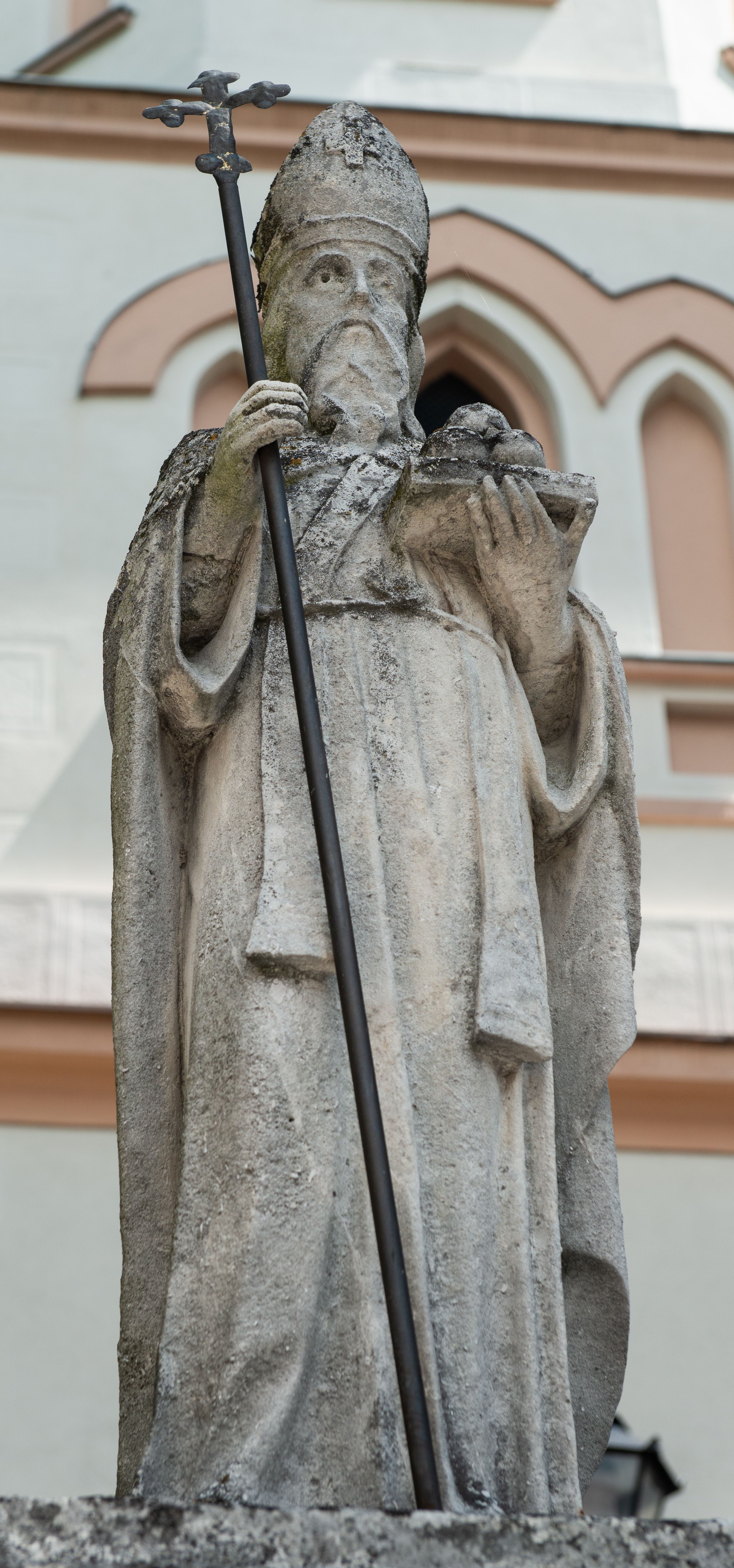 Rzeźba przedstawia św. Mikołaja, biskupa Miry, który żył na przełomie III i IV wieku. Trzy złote kule, która leżą na księdze symbolizują dar, jaki św. Mikołaj ofiarował trzem ubogim pannom na posag. Z kolei biskupi strój świętego i księga nawiązują do jego misji duszpasterskiej, w czasie gdy był biskupem Miry w Licji. Święty Mikołaj miał uczestniczyć w obradach soboru nicejskiego w 325 roku.