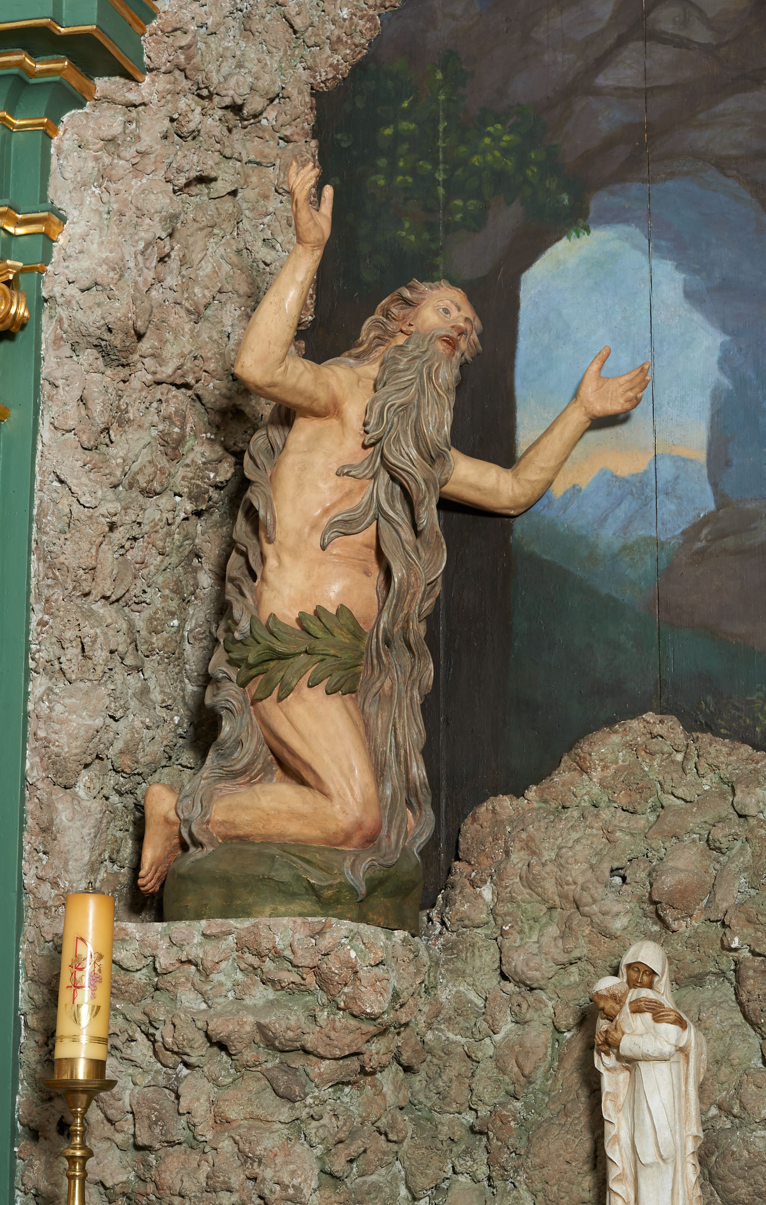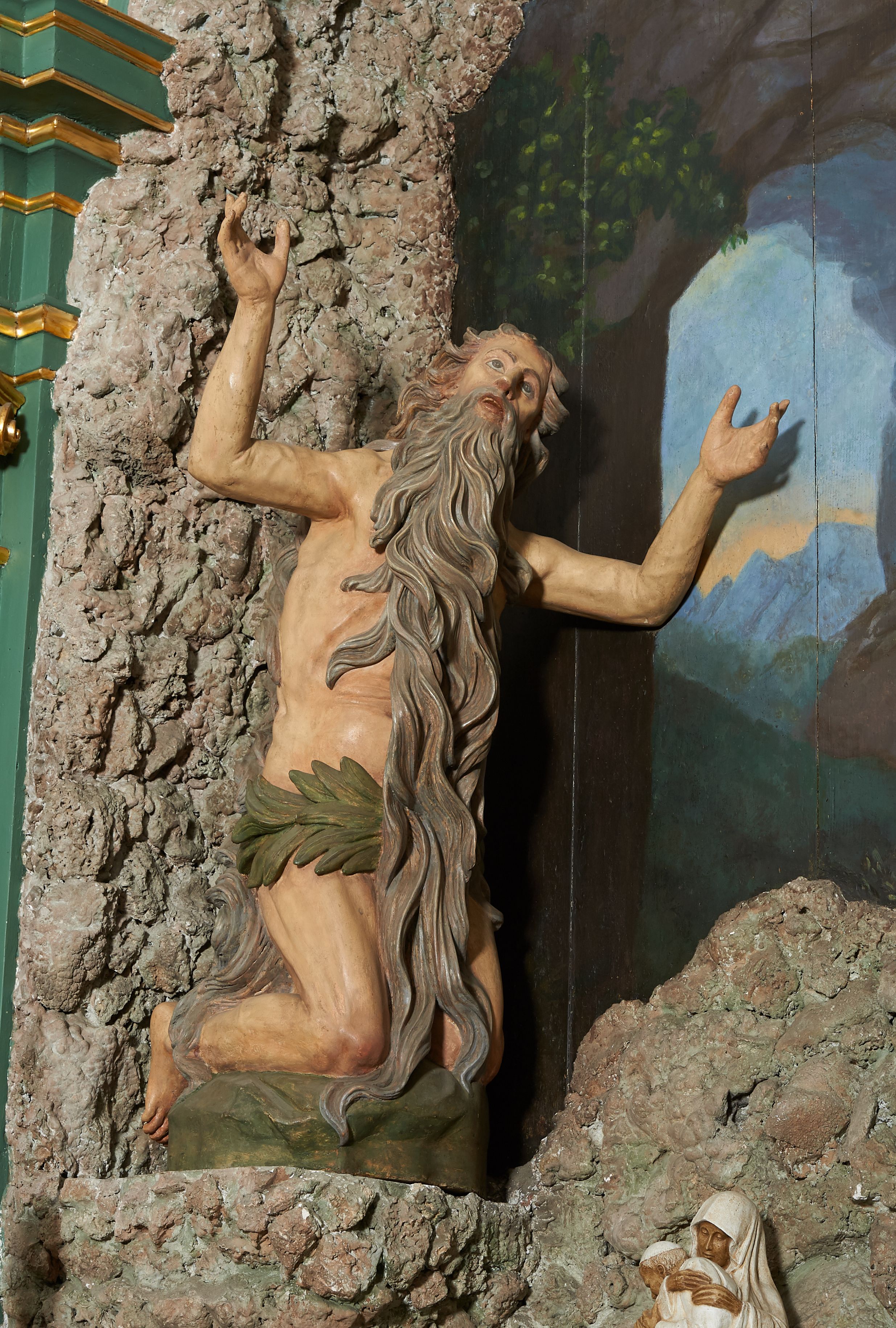W polu ołtarza imitującego grotę skalną znajduje się figura św. Onufrego modlącego się przed krucyfiksem. Po lewej stronie pełnoplastyczna figura klęczącego świętego ukazanego z profilu, z uniesionymi wysoko obiema rękami i głową. Twarz o starczych rysach, zwróconych w górę oczach, dużym nosie i otwartych ustach z widocznym uzębieniem, okolona bardzo długą, siwą brodą w postaci falowanych pasm, sięgających ziemi. Włosy siwe, zmierzwione, opadają na plecy w formie długich skręconych pasm, sięgających stóp. Ciało szczupłe, plastyczne modelowane, o wyraźnie zarysowanej anatomii i starczych cechach. Biodra przepasane liściastą gałązką.