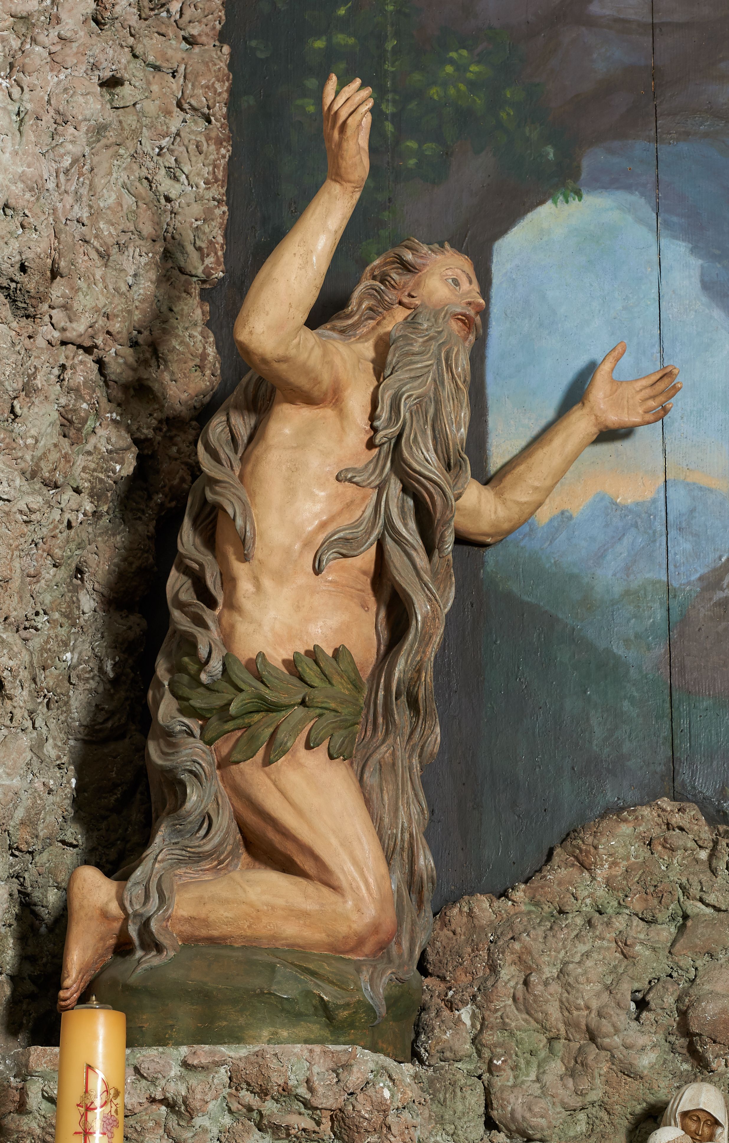 Figura św Onufrego powstała do ołtarza bocznego w trzeciej ćwierci XVIII wieku. Grotę zaaranżowano dopiero przed 1902 rokiem, w której wymiennie ustawiano rzeźby świętego modlącego się przed krucyfiksem oraz Matki Boskiej z Bernadetą Soubirous. Figura św. Onufrego została wykonana w warsztacie Korneckich z Gdowa. Święty był pustelnikiem z Egiptu, który spędził w samotności około 60 lat swojego życia. Jego postać znana jest z opisu św. Pafnucego, który spotkał go w grocie z długą siwą brodą przesłaniającą nagie ciało. Ta relacja wpłynęła na ukształtowanie wzorca ikonograficznego scen ze św. Onufrym.