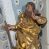 Zabrudzenia figury. Przetarcia warstwy srebrzeń miecza oraz złoceń szaty.
