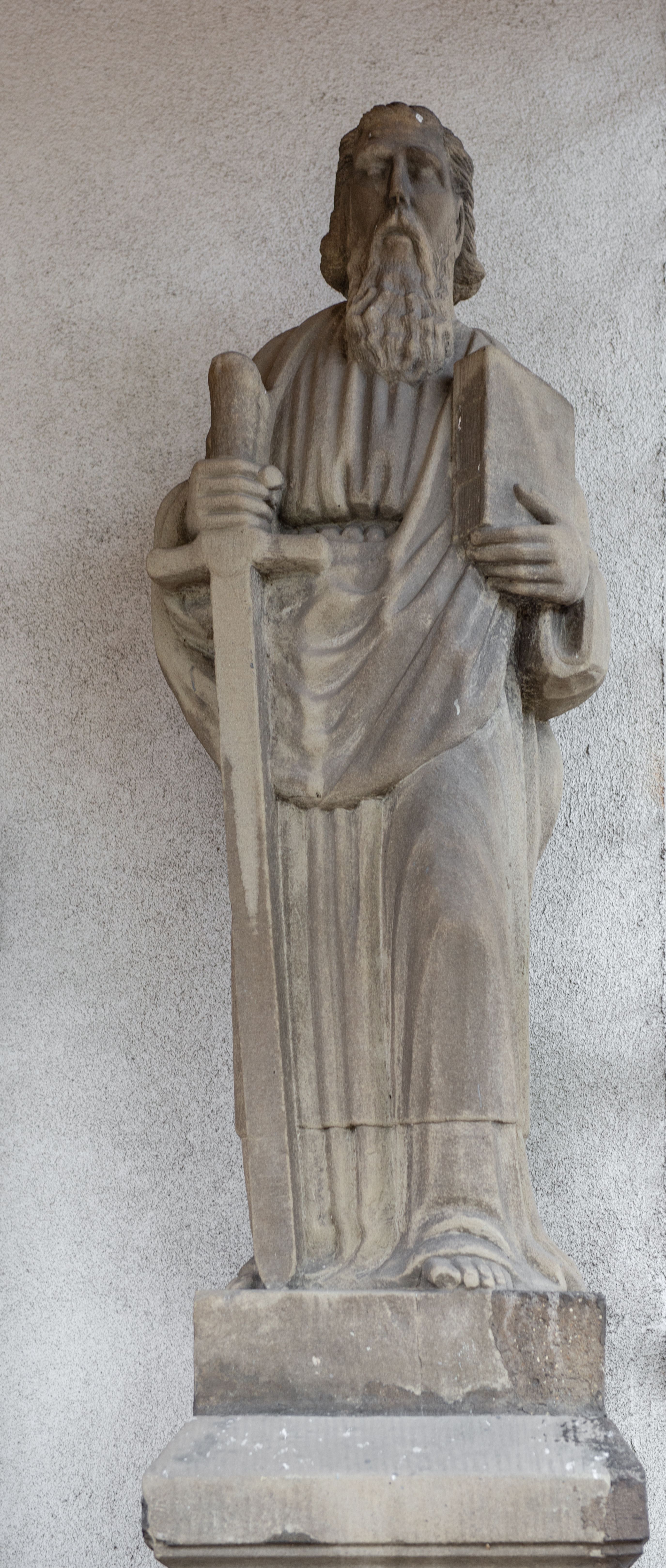 Rzeźba przedstawiająca św. Pawła, pełna, ustawiona na prostopadłościennym cokole. Święty ukazany w delikatnym kontrapoście z lewą nogą ugiętą w kolanie, z mieczem w prawej dłoni i księgą w lewej. Twarz podłużna, okolona długą brodą, usta delikatnie rozchylone, nos długi i prosty, włosy krótkie. Święty ubrany jest w długą suknię z długimi rękawami, przewiązaną w talii oraz płaszcz przerzucony przez prawe ramię i spływający połą z przodu na lewe ramię. Draperia szat sztywna, biegnąca równoległymi fałdami w dół.