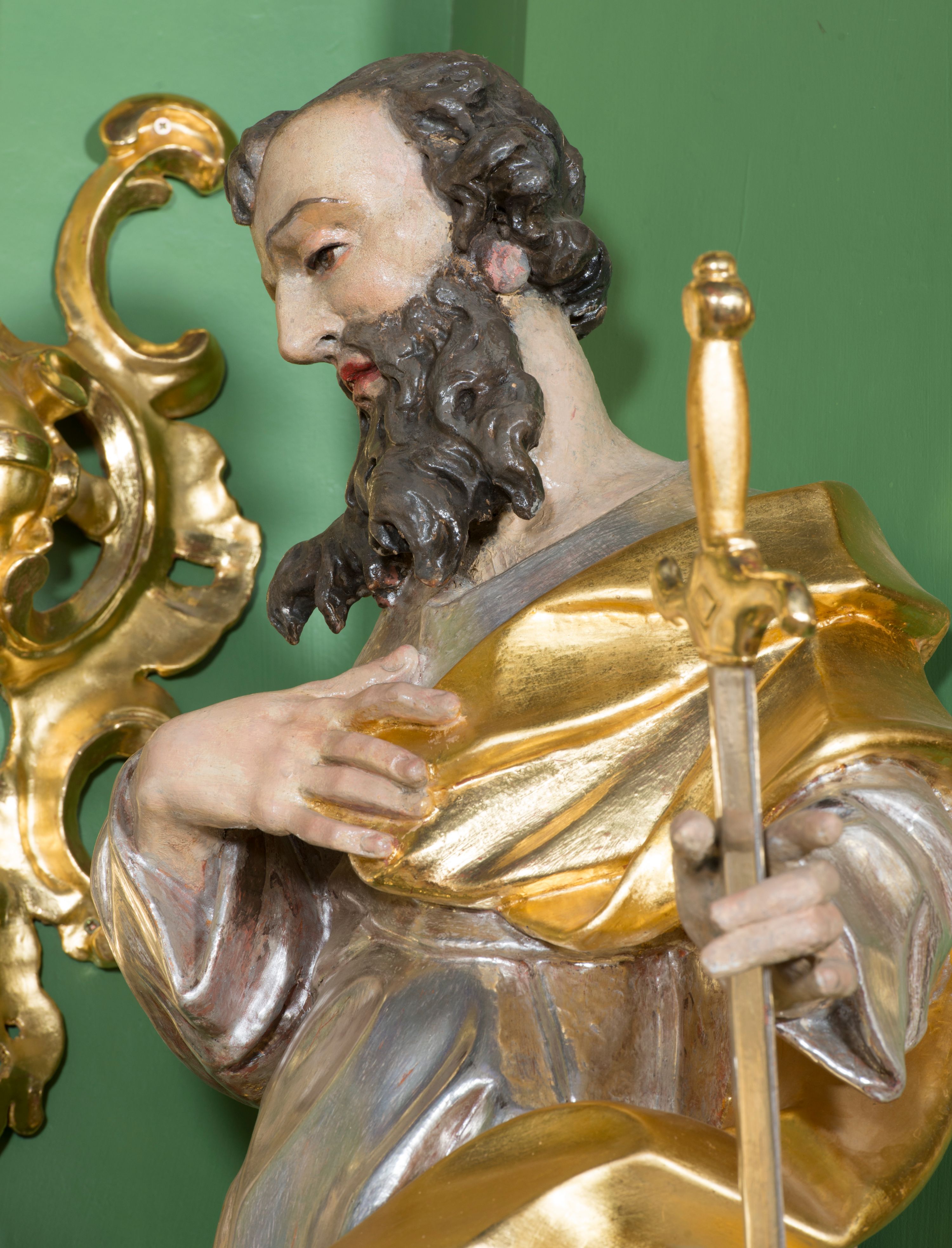 Rzeźba przedstawiająca św. Pawła w całej postaci. Figura ustawiona frontalnie, w kontrapoście, z głową pochyloną do przodu, prawą ręką spoczywającą na piersi, lewą wyciągniętą w bok, trzymającą miecz zwrócony ostrzem w dół. Twarz szczupła z wysokim czołem, o wyraźnie widocznych łukach brwiowych, dużym, zaoblonym nosie i zaznaczonych kościach policzkowych, okolona długą brodą silnie skręconą w pukle i głęboko rzeźbioną oraz krótkimi, silnie skręconymi włosami. Święty jest ubrany w długą suknię przewiązaną w talii oraz płaszcz podtrzymywany na piersi, przerzucony przez lewe ramię. Polichromia naturalistyczna w odsłoniętych partiach ciała, szaty i atrybuty złocone i srebrzone.