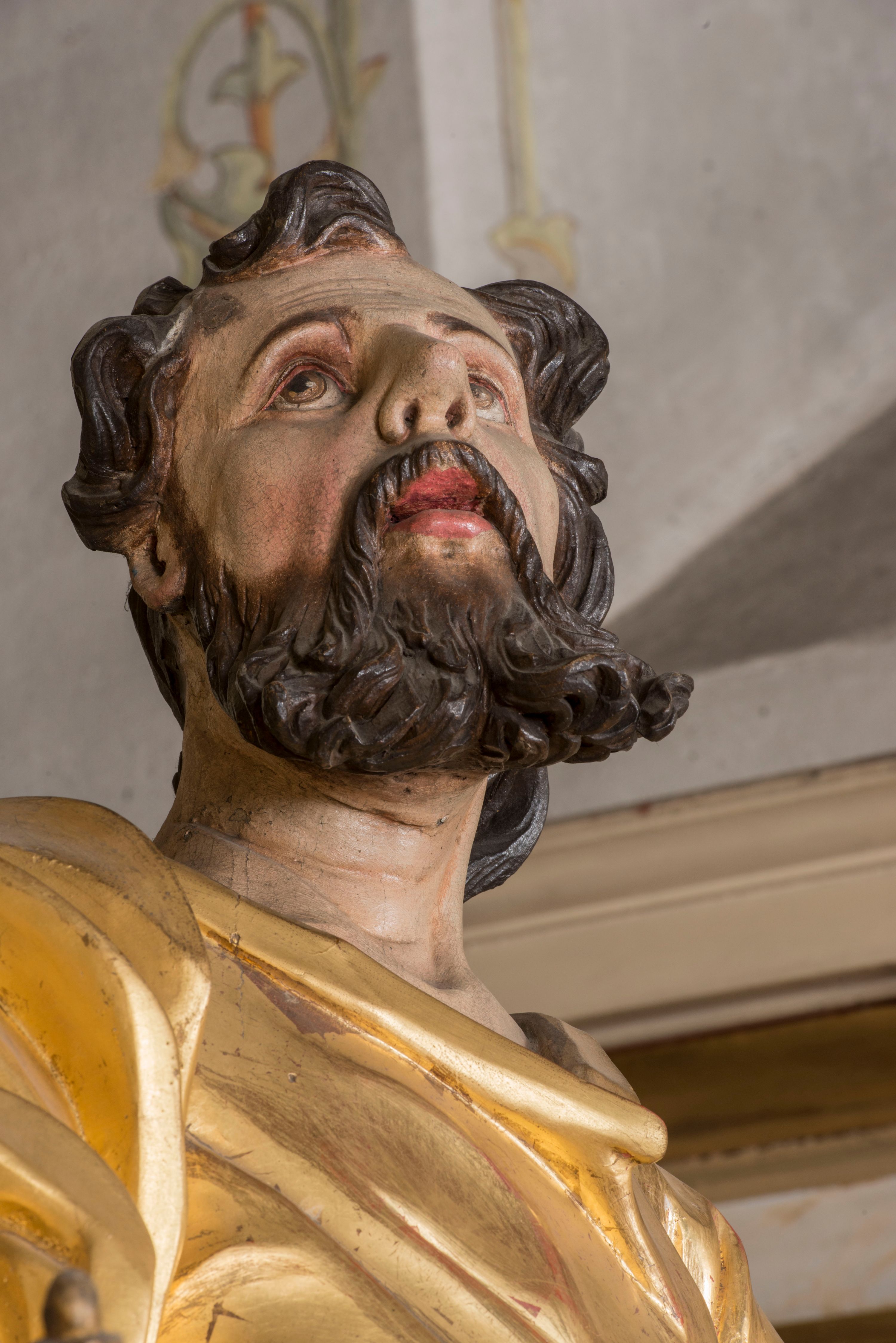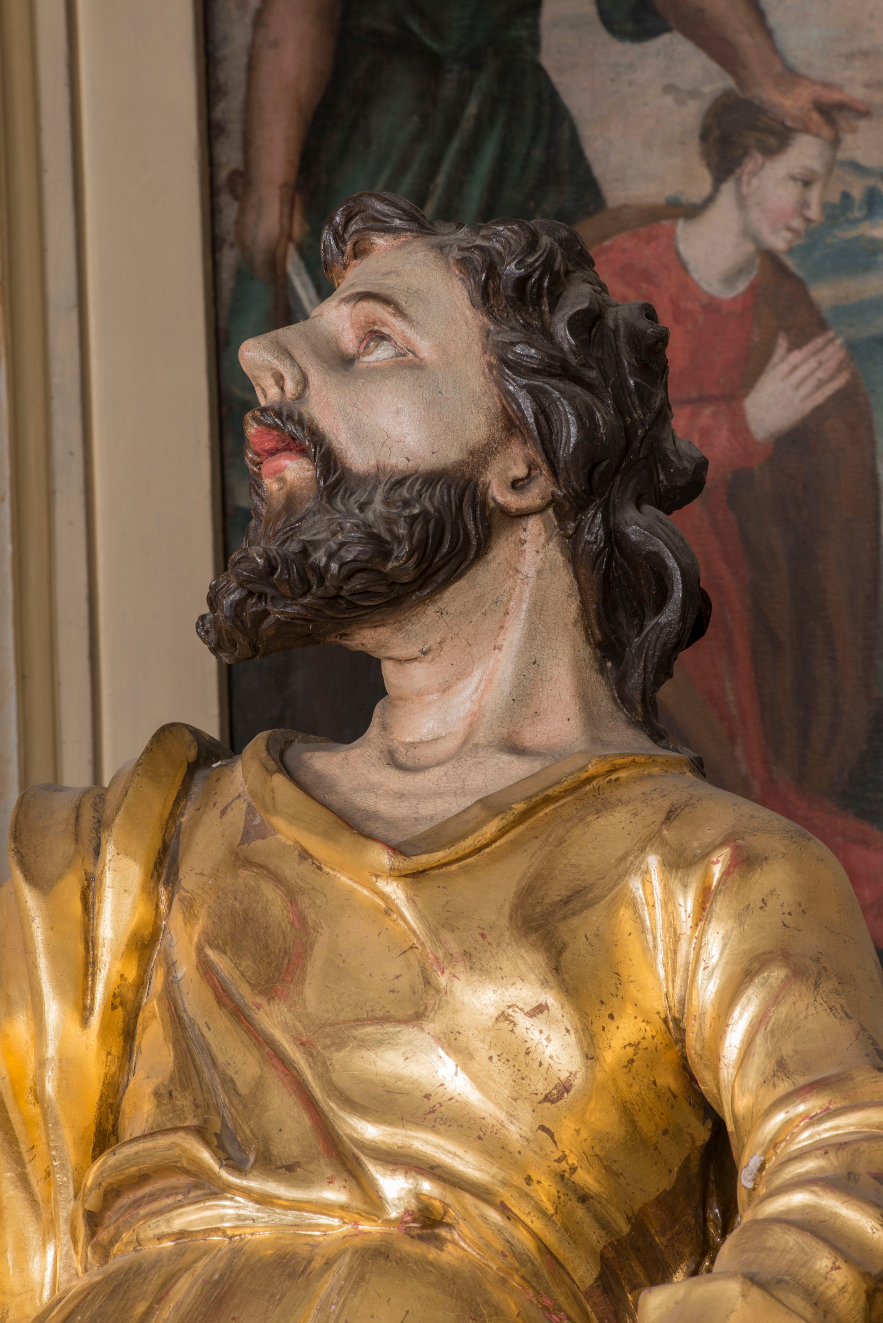 Figura ścięta z tyłu, drążona. Święty ukazany frontalnie, z uniesioną głową skierowaną w prawo, w kontrapoście, o esowato wygiętej sylwetce, odchylonej lekko w tył. W prawej ręce trzyma miecz, zwrócony ostrzem w dół, lewą przytrzymuje na nodze księgę. Twarz ma pociągłą, o dużych, migdałowatych oczach, zadartym nosie i pełnych ustach z wysuniętą górną wargą. Twarz okolona krótką, rozwidloną brodą oraz falowanymi włosami opadającymi na kark. Święty ubrany jest w sięgającą stóp tunikę z długimi rękawami, przepasaną szarfą oraz płaszcz zwinięty wokół prawego ramienia i opadający na lewą nogę. Polichromia ciała naturalistyczna, szaty i atrybuty złocone, detal srebrzony.