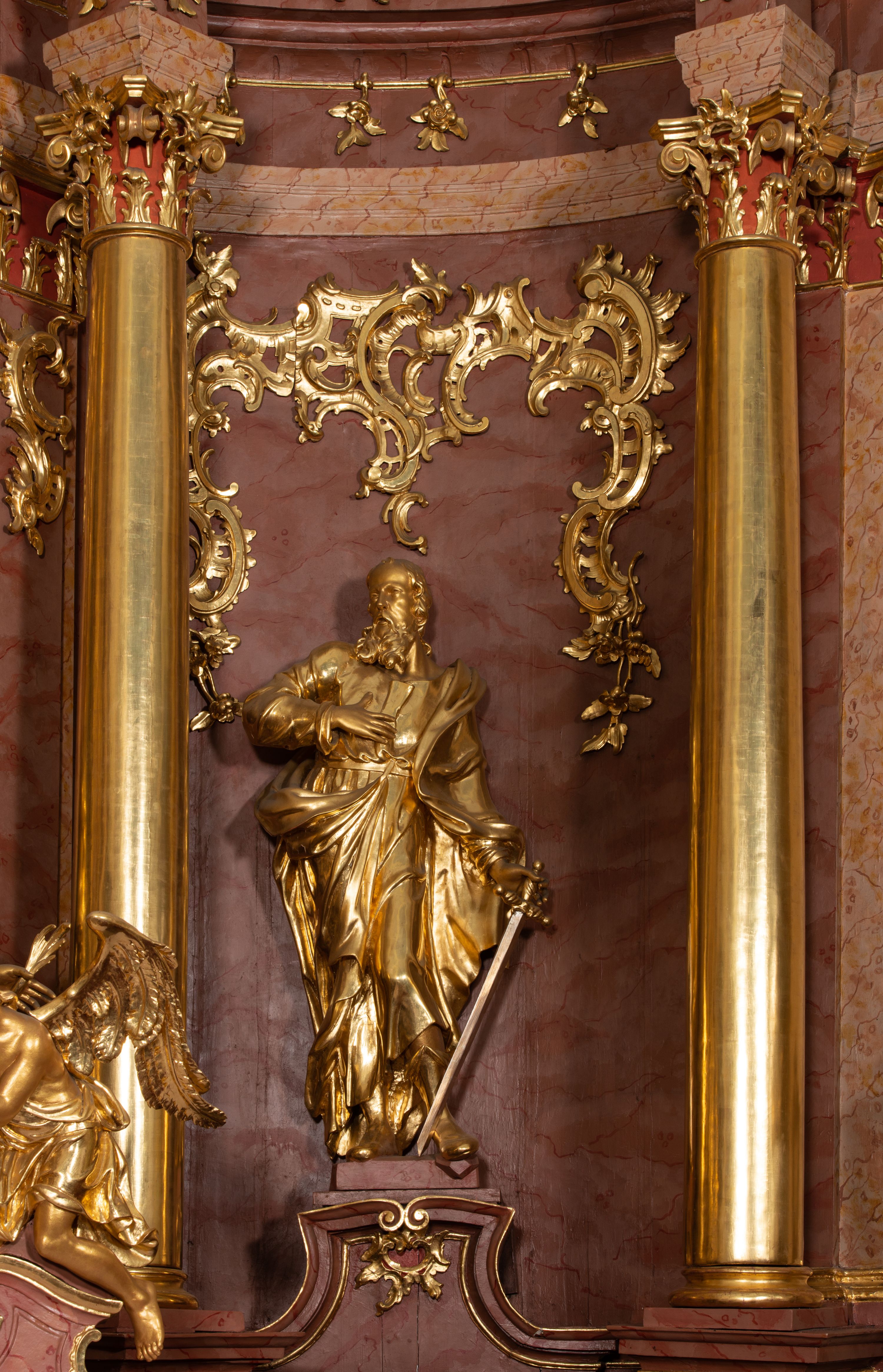 Figura św. Pawła powstała razem z ołtarzem głównym przed 1779 rokiem, a więc po pożarze kościoła (1752), ale przed jego ponowną konsekracją. Święty poniósł śmierć męczeńską przez ścięcie mieczem, dlatego jest on jego atrybutem.