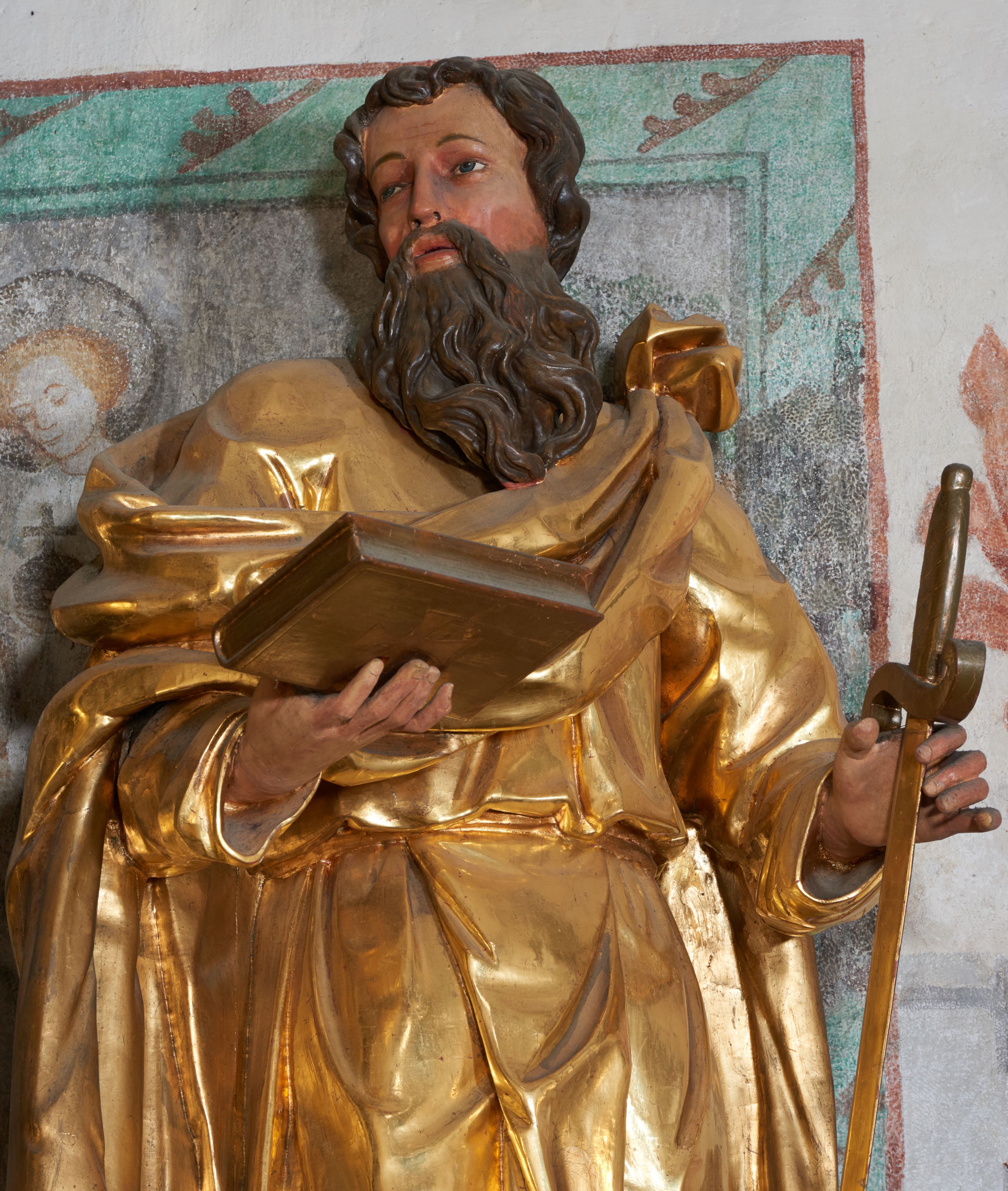 Siedemnastowieczna figura św. Pawła została wykonana wraz z ołtarzem, w którym się znajduje. Stanowi parę do umieszczonej po przeciwnej stronie postaci św. Piotra. Obie rzeźby charakteryzują się uspokojoną formą, ożywioną jedynie gęstymi fałdami przylegających ściśle do ciała szat.