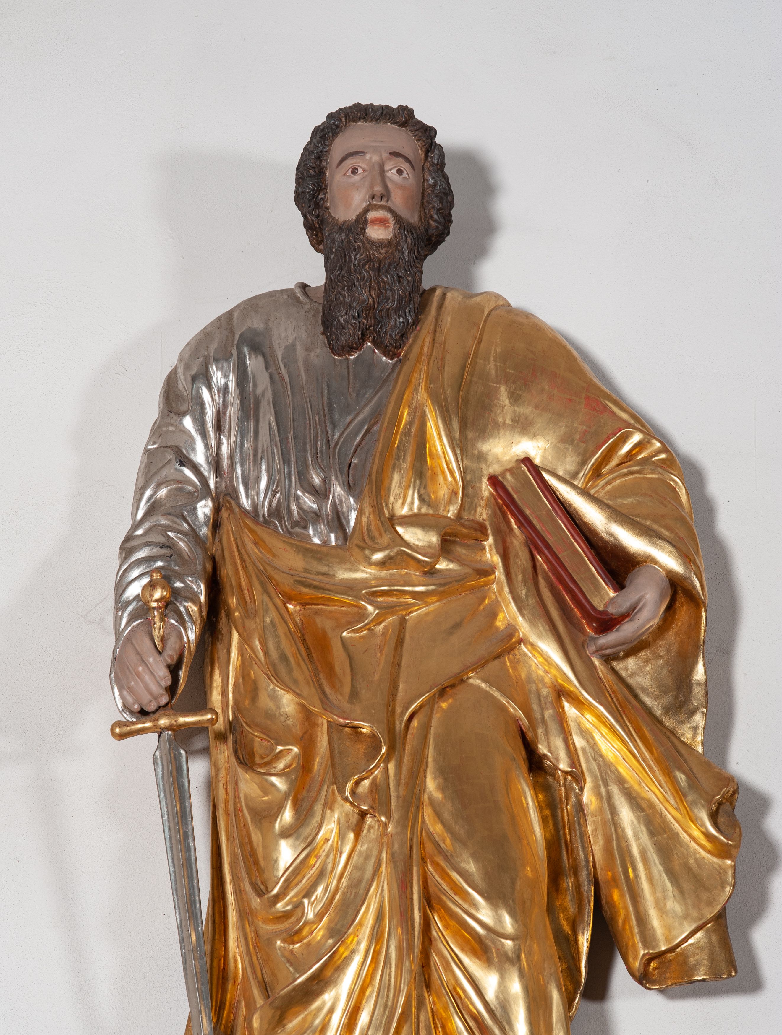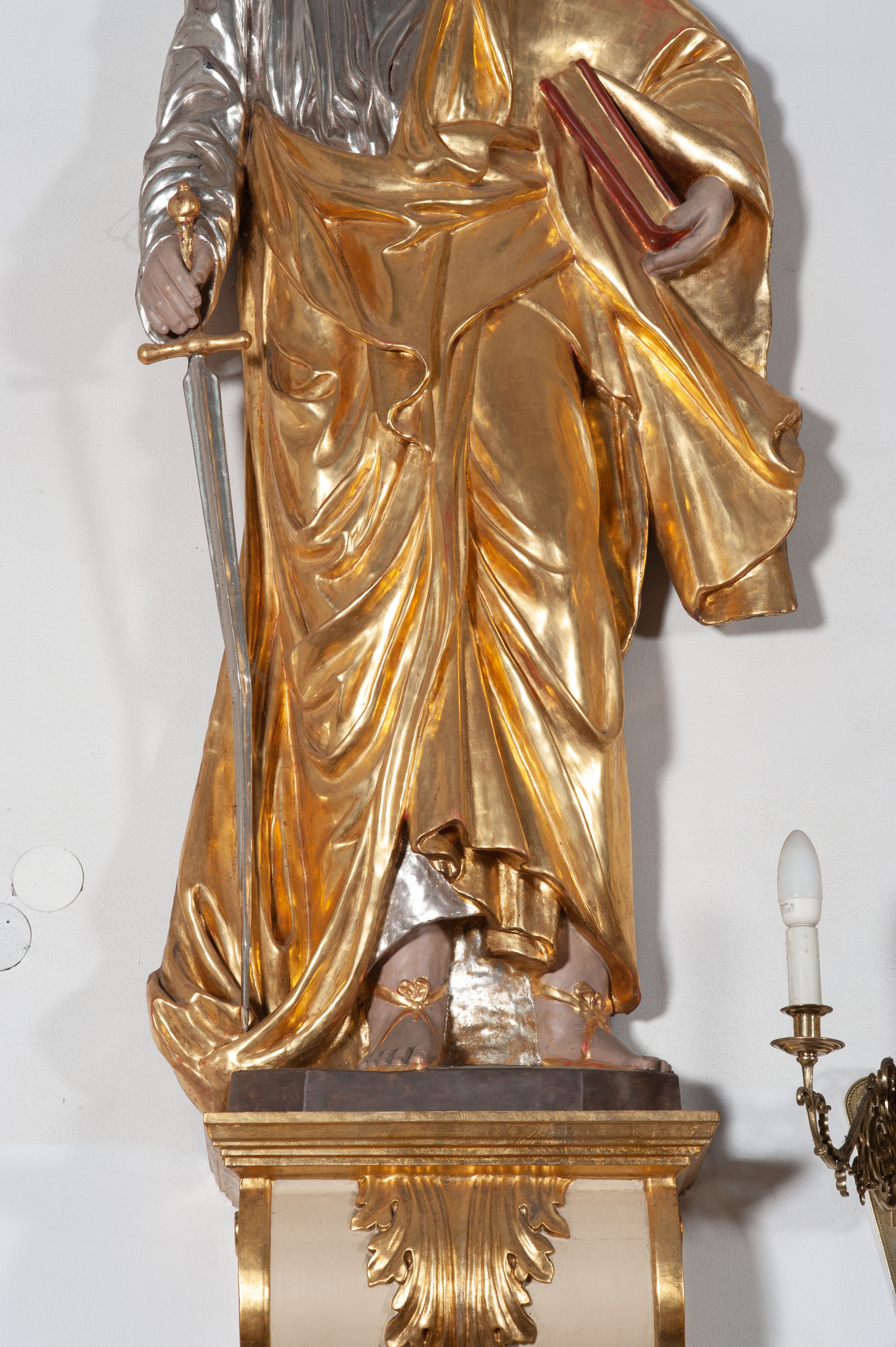 Całopostaciowa, ustawiona na konsoli w formie spływu wolutowego figura przedstawia zwróconą na wprost postać św. Pawła stojącego w lekkim kontrapoście. Pociągłą twarz charakteryzuje długi, ciemnobrązowy zarost, niewielkie, szeroko otwarte oczy wzniesione brwi oraz długi, prosty nos. Włosy są krótkie, ciemnobrązowe, kręcone. Święty ubrany jest w srebrzoną suknię z długimi rękawami oraz osłaniający niemal całą sylwetkę, wydatnie fałdowany złocony płaszcz, na stopach są złocone sandały. Prawą, opuszczoną w dół ręką podtrzymuje wsparty na pole płaszcza miecz, w lewej ma księgę w czerwonej oprawie.