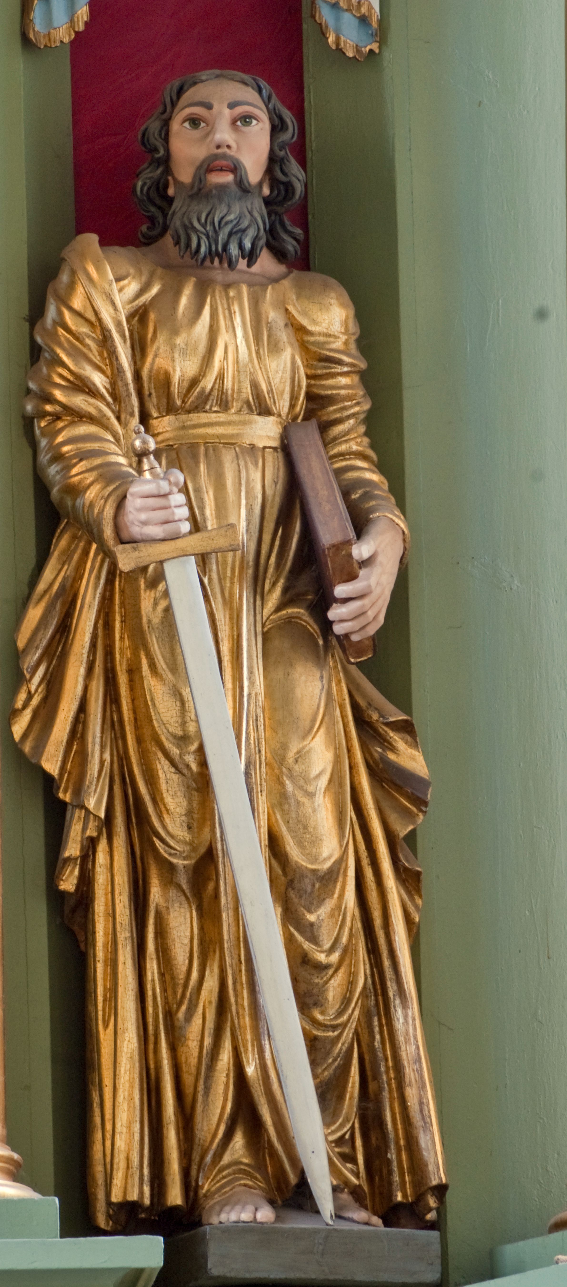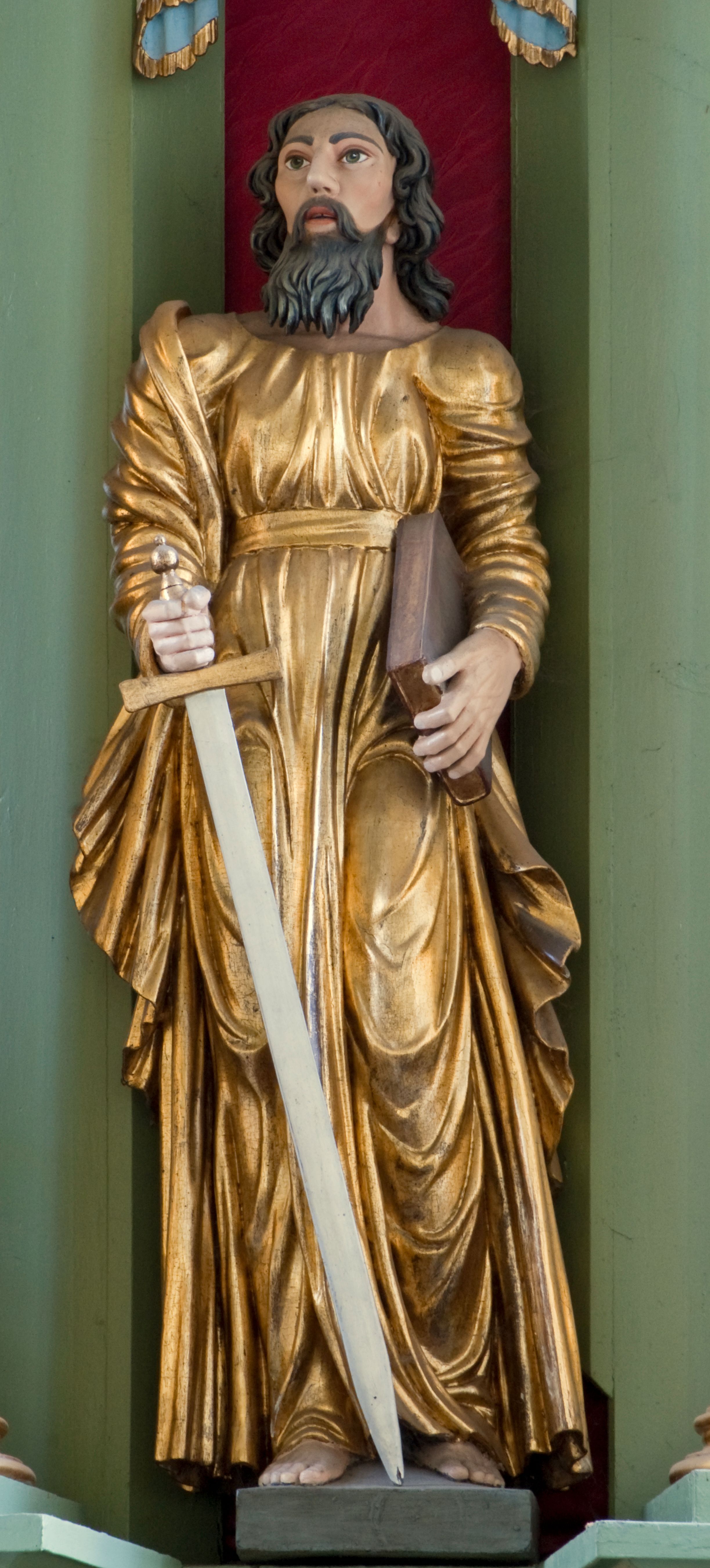 Rzeźba drążona ustawiona na niewielkim, prostopadłościennym postumencie. Święty Paweł został przedstawiony całopostaciowo, w pozycji stojącej, w lekkim kontrapoście. W prawej ręce opuszczonej wzdłuż tułowia trzyma zamkniętą księgę, prawą wspiera na mieczu. Święty został przedstawiony jako dojrzały mężczyzna o wyrazistych rysach twarzy – głęboko osadzonych oczach, krótkim i wąskim nosie oraz wystających kościach policzkowych. Na głowie dłuższe, kręcone włosy w kolorze ciemnobrązowym oraz kędzierzawa broda w tym samym kolorze. Wzrok postaci skierowany przed siebie, usta nieco rozwarte. Święty Paweł jest ubrany w złocone, bogato fałdowane szaty – sięgającą ziemi suknię z długimi, wąskimi rękawami przewiązaną w pasie oraz złoty płaszcz udrapowany wokół prawej ręki. Widoczne spod szat stopy postaci są bose. Figura polichromowana, partie szat złocone.
