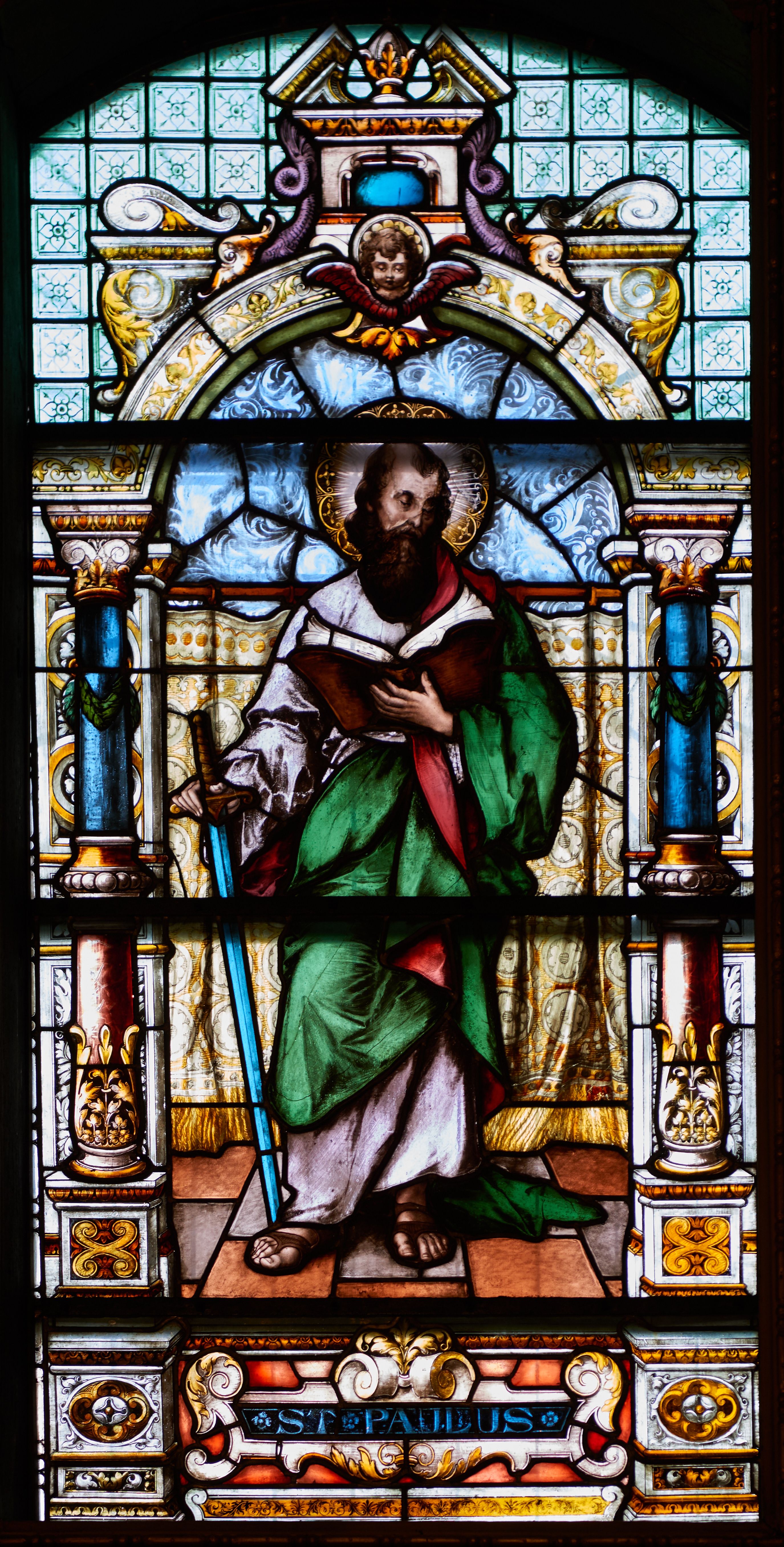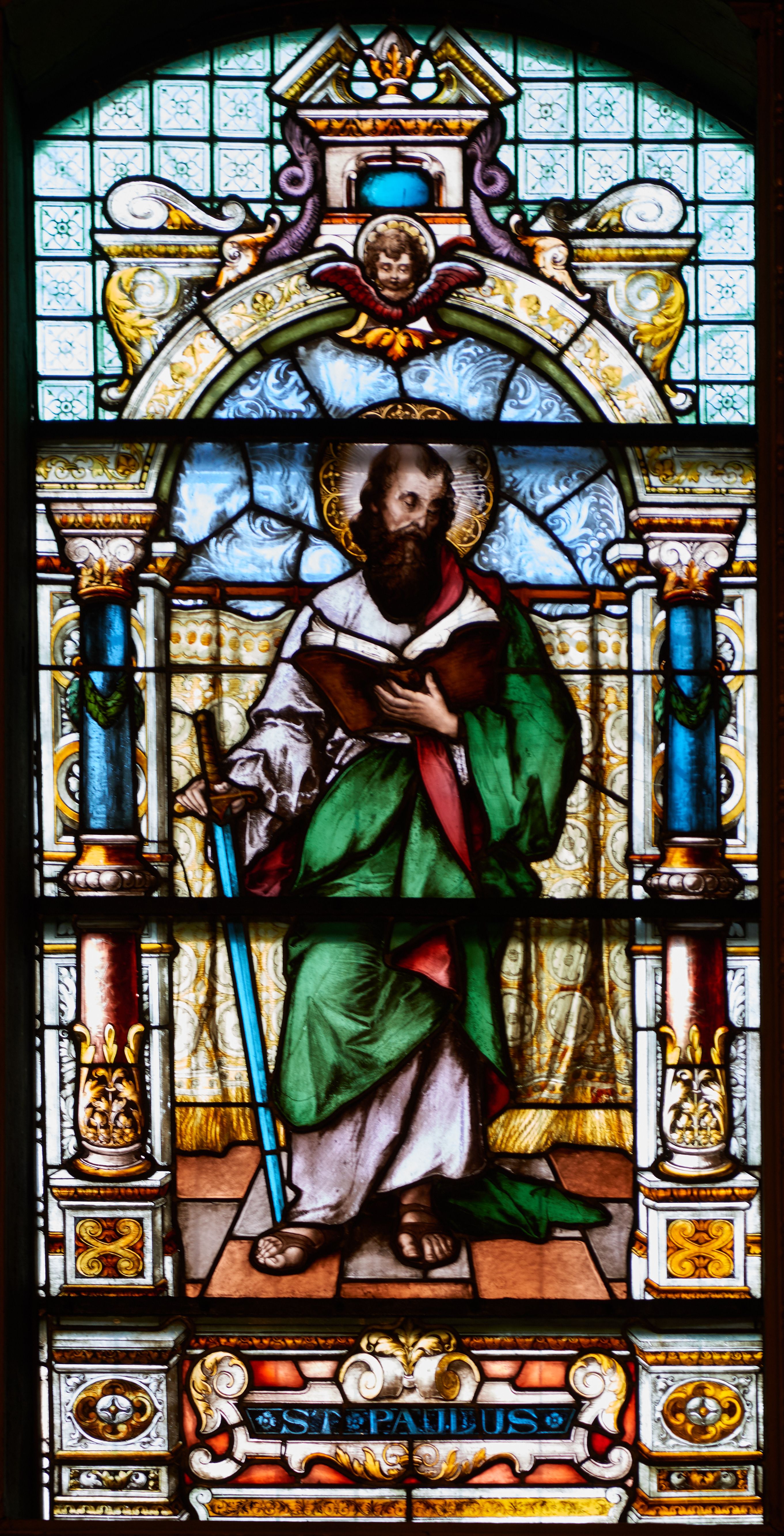 Witraż w kształcie stojącego prostokąta, zamkniętego łukiem odcinkowym. W centrum kompozycji ukazany jest św. Paweł wewnątrz dekoracyjnej aediculi. Święty przedstawiony jest frontalnie, w lewej dłoni trzyma otwartą księgę, a w prawej miecz skierowany ostrzem w dół, głowa skłoniona jest lekko w dół, w stronę księgi. Twarz podłużna w wysokim czołem z zakolami, okolona bujną, długą i ciemnobrązową brodą. Święty ubrany jest w jasnoróżową suknię, zielony płaszcz z czerwoną podszewką, przewieszony przez lewe ramię oraz sandały na stopach; wokół głowy ma kolisty nimb, wypełniony świetlistymi promieniami i złotymi zdobieniami. Aedicula wsparta jest na parach kolumn oraz stojących za nimi filarów, ustawionych na dwustopniowych cokołach. Podpory podtrzymują zwieńczenie z łukiem odcinkowym z przodu. W tle na prostym drążku, zawieszona jest drapowana, złota kotara ze złotymi frędzlami; podłoga ułożona z brązowym płytek. Cokoły kolumn dekorowane są płycinami, wypełnionymi rozetami. Kolumny w połowie przedzielone są opaską, u dołu zdobione stylizowanymi liśćmi akantu, a u góry zielonym festonem. W dolnej części kolumny są koloru czerwonego, w górnej niebieskiego; kapitele kompozytowe. Trzony filarów zdobione prostokątnymi płycinami, wypełnionymi roślinną dekoracją. Łuk zdobiony jest złoconą wicią roślinną i astragalem, w kluczu znajduje się uskrzydlona główka aniołka z czerwonymi skrzydłami. Zwieńczenie dwustopniowe, bogato dekorowane wolutkami i liśćmi akantu, na szczycie przerwany przyczółek, a po środku wazon. W dolnej partii witrażu, pomiędzy cokołami aediculi ozdobny kartusz zdobiony stylizowanym ornamentem okuciowym z prostokątną płyciną w polu z napisem: „S[ANC]T[US] PAULUS” oraz sygnatura artysty Georga Boosa z Monachium.