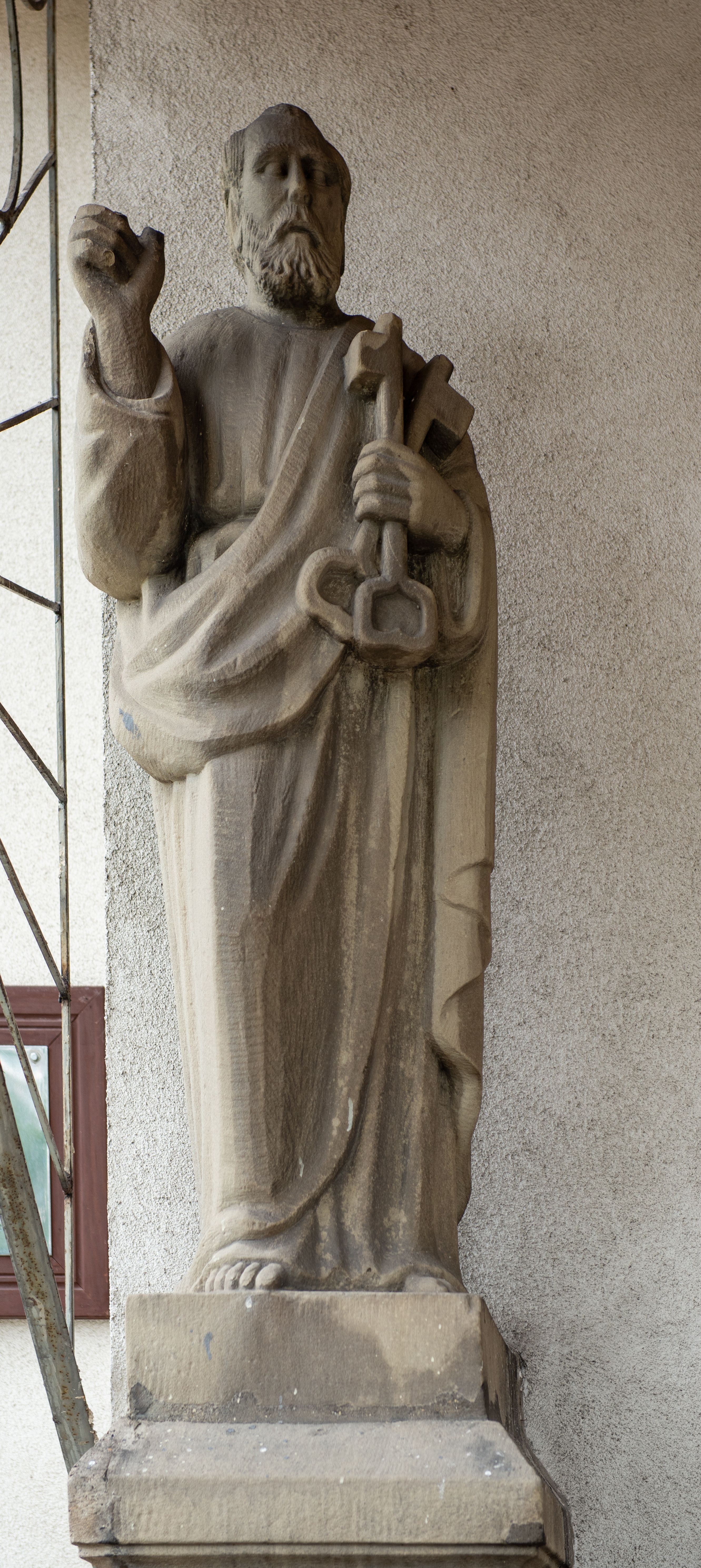 Rzeźba przedstawiająca św. Piotra, wolnostojąca, pełna, ustawiona na prostopadłościennym cokole. Święty ukazany w delikatnym kontrapoście z prawą nogą ugiętą w kolanie, prawą ręką ugiętą w łokciu i uniesioną do góry, w lewej przyciśniętej do piersi trzyma dwa klucze. Twarz podłużna, okolona krótką brodą, usta delikatnie rozchylone, nos długi i prosty, włosy krótkie z kępką włosów nad czołem. Święty ubrany jest w długą suknię z długimi rękawami, przewiązaną w talii oraz płaszcz przerzucony przez lewe ramię i spływający połą wzdłuż lewego boku. Draperia szat sztywna, biegnąca równoległymi fałdami w dół.