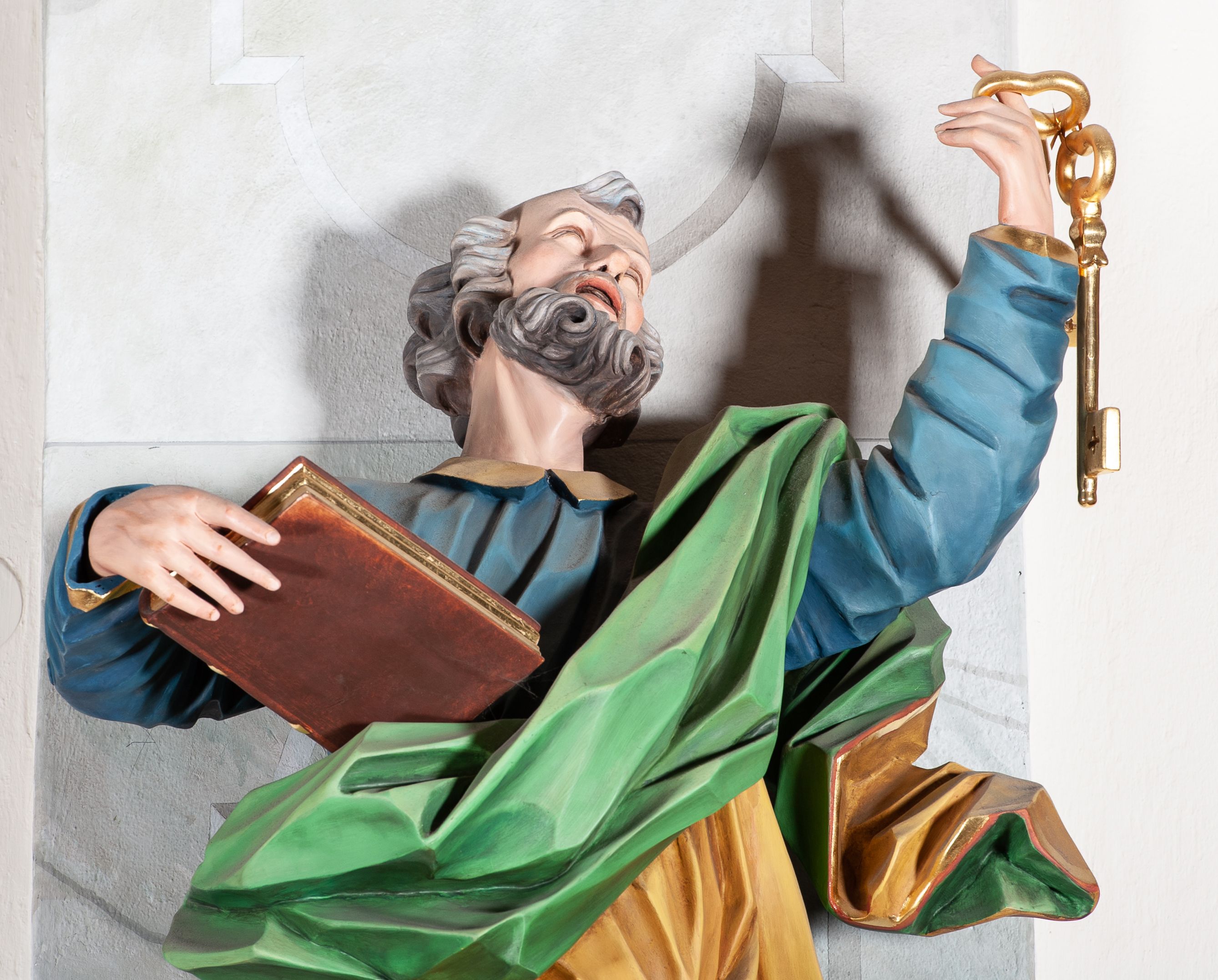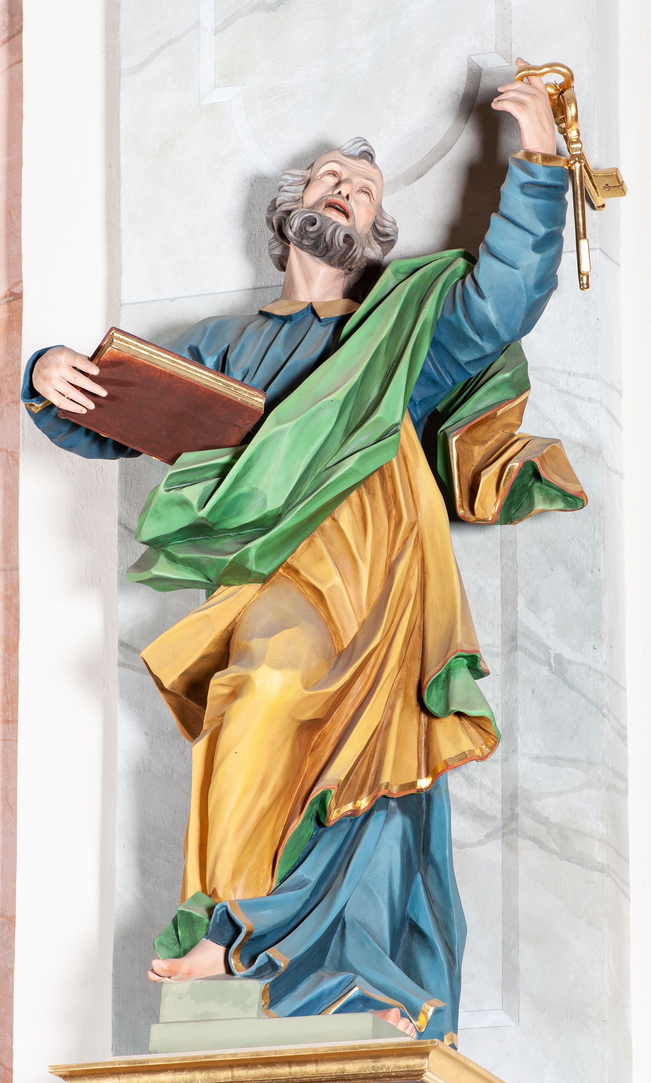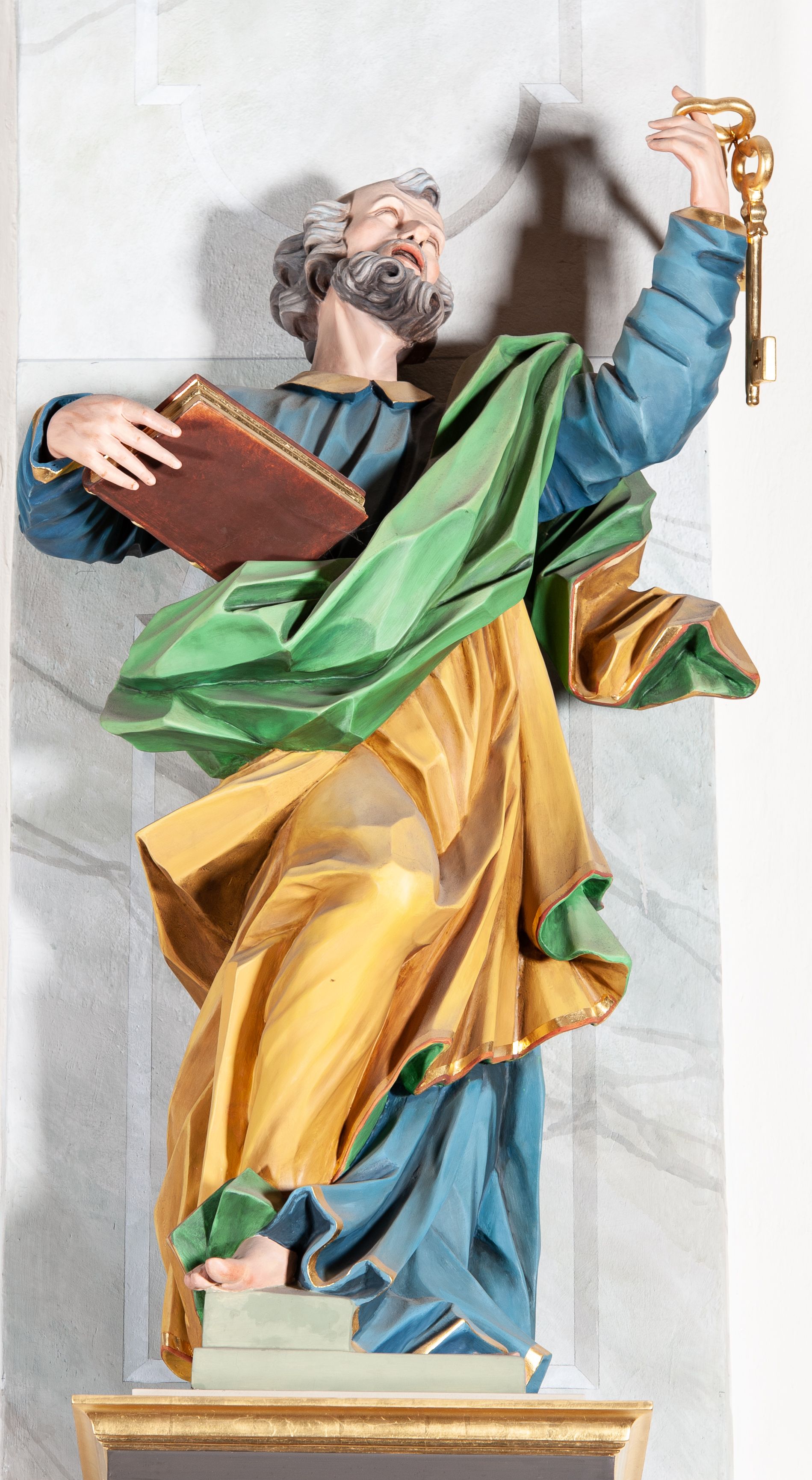 Rzeźba drążona, ścięta z tyłu, przedstawiająca św. Piotra. Święty ustawiony frontalnie, o esowato wygiętej sylwetce, z ugiętą prawą nogą, opartą o stopień. W lewej uniesionej wysoko ręce trzyma dwa klucze, prawą podtrzymuje opartą o bok księgę. Głowa skierowana trzy czwarte w lewo i uniesiona w górę. Twarz ascetyczna, oczy uniesione w górę, rozchylone usta; okolona gęstą brodą, układającą się w pukle. Włosy siwe w postaci silnie skręconych loków po bokach i na tyle głowy oraz pukiel na czole. Święty ubrany jest w niebieską suknię z kołnierzykiem oraz przerzucony diagonalnie przez lewe ramię żółty płaszcz ze złoconą lamówką i zieloną podszewką. Tkanina ekspresyjnie kształtowana, silnie drapowana, miejscami przylegająca do ciała. Polichromia naturalistyczna, atrybuty i lamówka złocone.