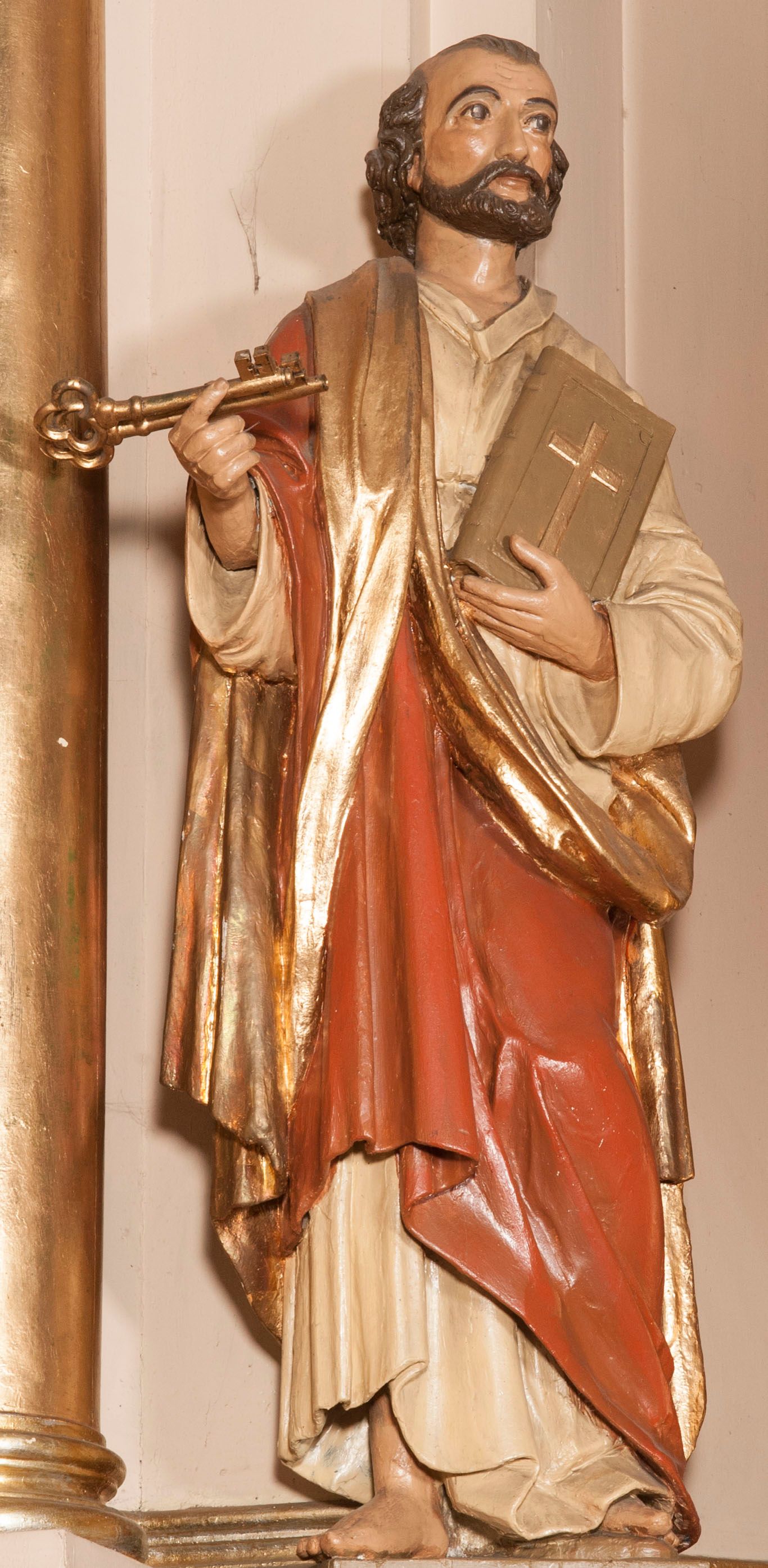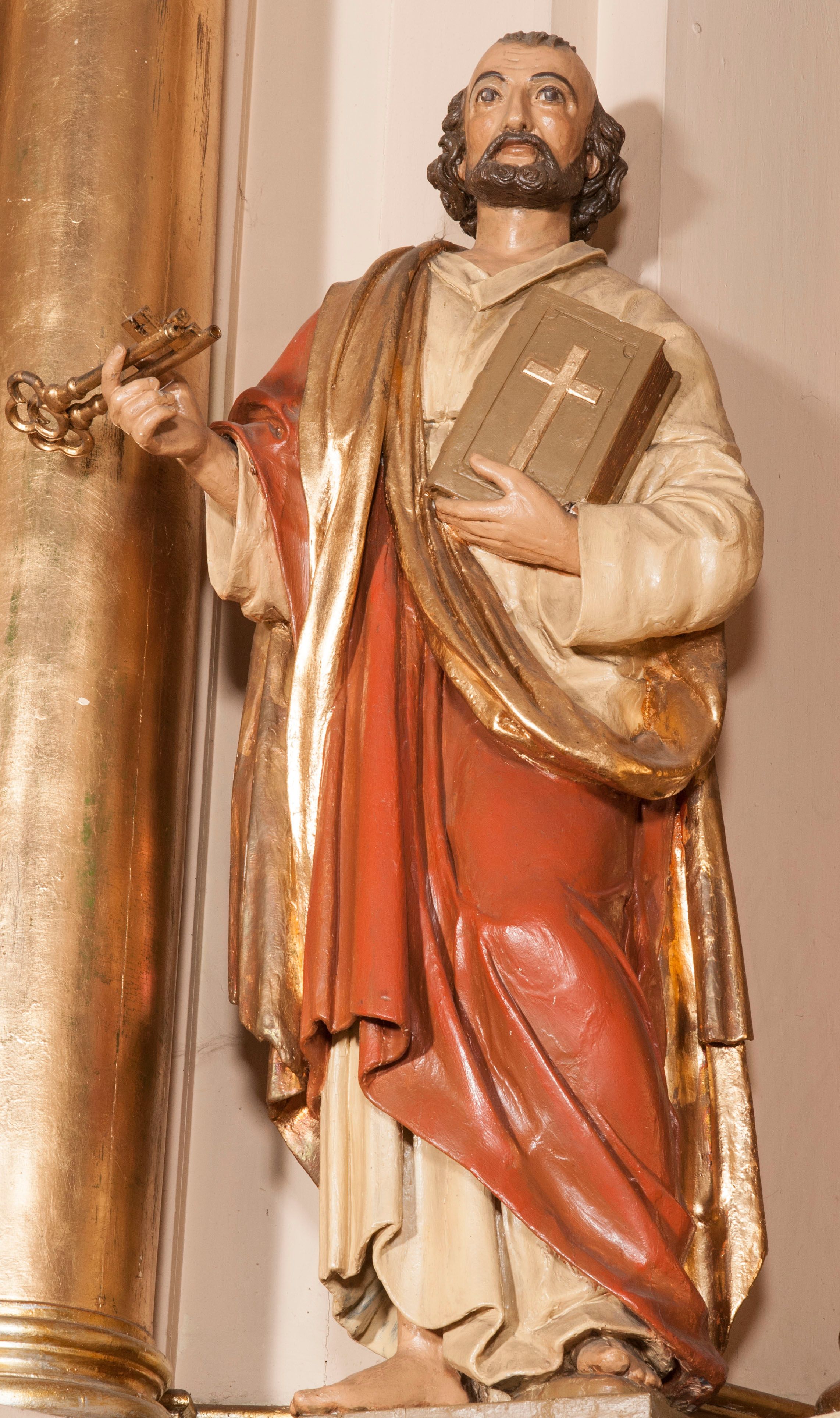 Przedstawienie św. Piotra umieszczone po prawej stronie ołtarza głównego zostało wykonane w latach 1850-1860. Jest przykładem poprawnej, dziewiętnastowiecznej rzeźby, która wypełniała licznie powstające w tym czasie ołtarze.