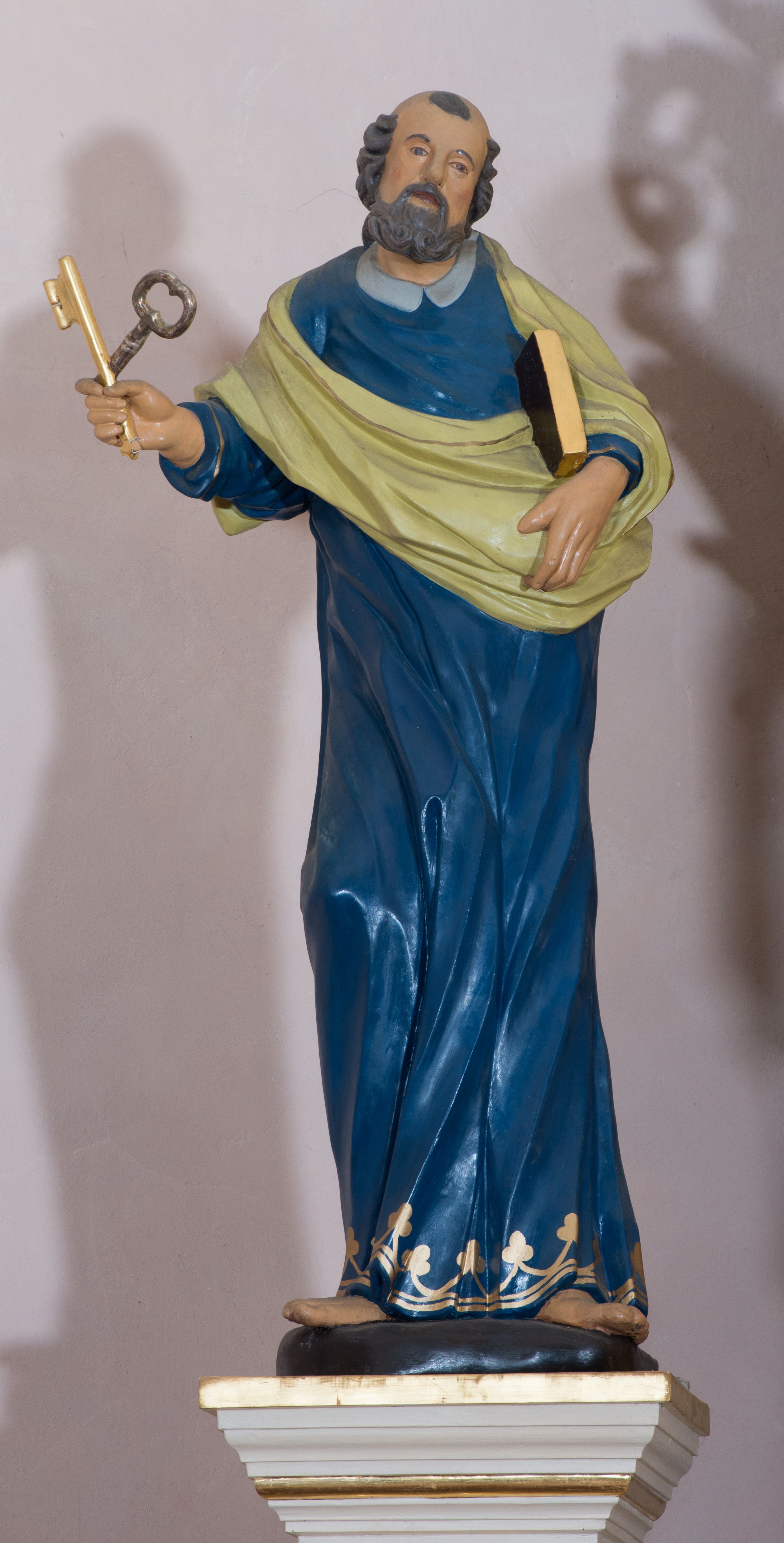 Rzeźba drążona, przedstawiająca św. Piotra. Święty ustawiony na niskim cokole, w delikatnym kontrapoście, z prawą nogą ugiętą w kolanie, z rozłożonymi na boki stopami. W prawej dłoni trzyma dwa skrzyżowane klucze, a w lewej księgę w brązowej oprawie. Twarz podłużna, okolona siwą brodą z długim nosem i małymi ustami. Włosy siwe, zasłaniające uszy, głowa ujęta do połowy łysiną, nad czołem kosmyk siwych włosów. Święty jest ubrany w długą, niebieską suknię z kołnierzykiem, u dołu zdobioną złoconym pasem ornamentu składającego się ze złączonych trójliści. Na suknię ma założony zwinięty jasnozielony płaszcz. Polichromia w odsłoniętych partiach ciała naturalistyczna, detale i klucze złocone.