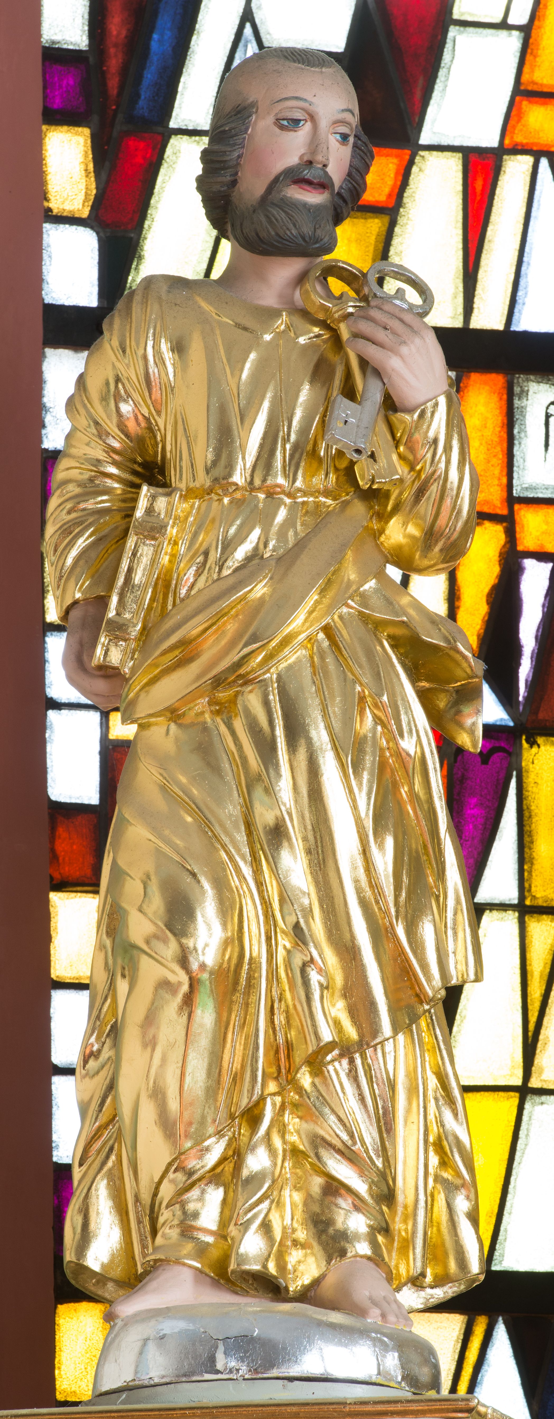 Rzeźba przedstawia św. Piotra, ustawionego na półkolistym, srebrzonym cokole. Święty ukazany frontalnie, w lewej dłoni uniesionej na wysokości barku trzyma dwa klucze, a w prawej przy boku trzyma księgę. Twarz pełna o delikatnie rozchylonych ustach i dużych oczach. Głowa okolona krótką brodą oraz włosami po bokach głowy i kępką na jej czubku. Święty ubrany jest w długą suknię, przewiązaną w talii oraz złocony płaszcz przechodzący ukośnie z przodu i pod lewą ręką. Draperia szat miękka o równoległych fałdach; dłonie wyrzeźbione sztywno i niedbale. Polichromia w odsłoniętych partiach ciała naturalistyczna, szaty i atrybuty złocone oraz srebrzone.