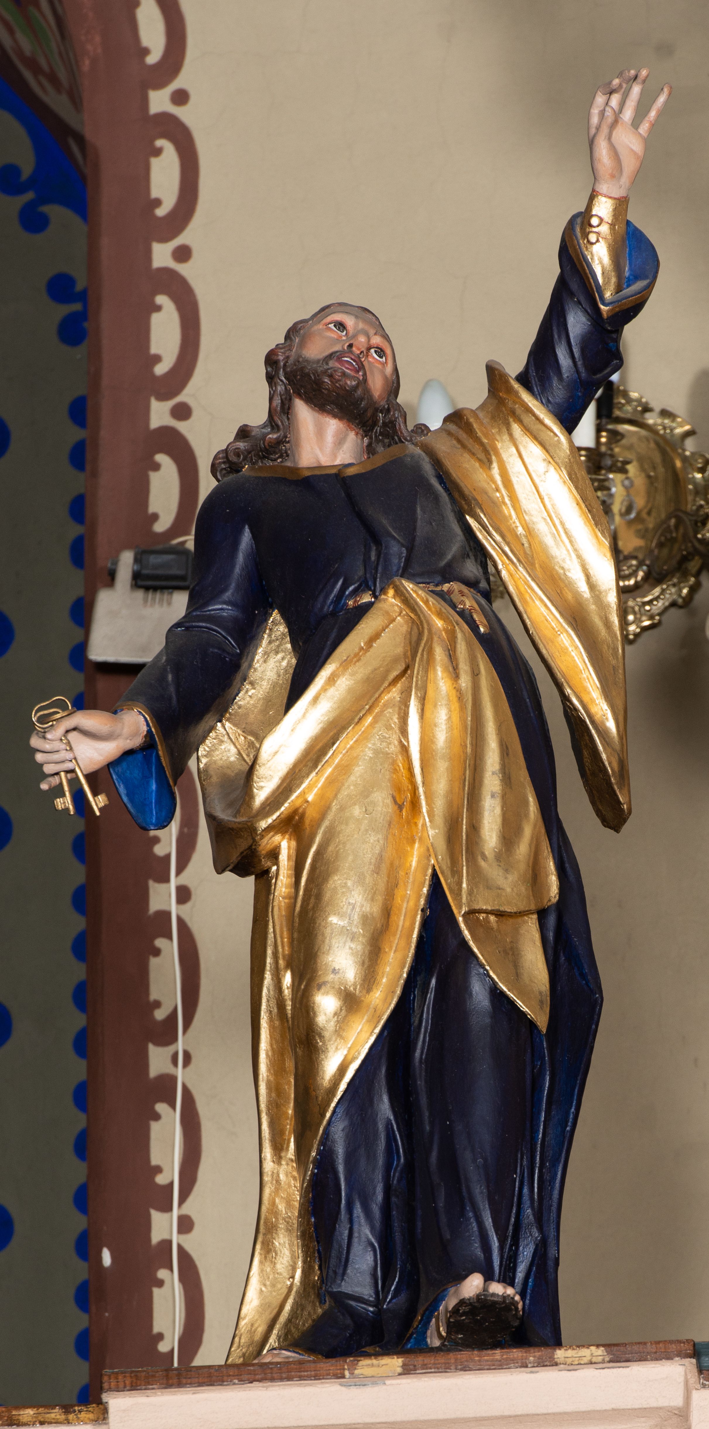Rzeźba pełna, ustawiona na niskiej podstawie. Święty zwrócony frontalnie, odchylony, z głową skierowaną w górę, w wykroku. Lewą rękę unosi wysoko w górę, prawą w bok, w dłoni trzyma klucze. Twarz ma szczupłą, o dużych oczach skierowanych w górę, garbatym nosie oraz pełnych, otwartych ustach; okoloną krótką, kręconą brodą oraz kręconymi włosami, sięgającymi ramion. Święty ubrany w ciemnoniebieską tunikę ze złoconymi lamówkami, przepasaną w talii oraz złocony płaszcz zarzucony na lewe przedramię i zawiązany w pasie z przodu postaci. Na stopach ma sandały. Polichromia ciała naturalistyczna.